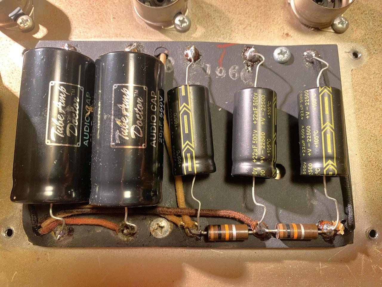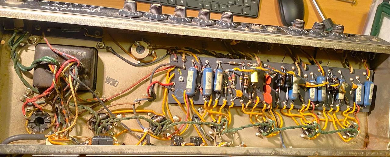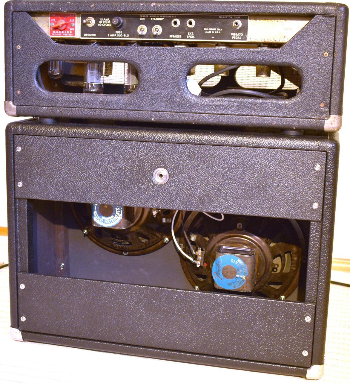 Prodám tuto 35 wattovou hlavu s reprobednou v perfektním funkčním stavu. Reproduktory mají původní membránu. Hrají bez problému. Bedna je z masivní borovice, vyráběná na míru, aby odpovídala velikostí hlavě. Díky menším rozměrům není tak přebasovaná jako velké Fender reproboxy. K hlavě mám měkký obal Šiba + neoriginální footswitch na tremolo. Transformátory jsou původní. Uvnitř jsou původní ceněné Ajax Blue Molded kondenzátory. Filtrační elektrolyty, elektrolyty v bias obvodu a elektrolyty na katodách vyměněny. Hraje to skvěle. Prodávám, protože mám ještě hodně podobně znějící Vibrolux Reverb z roku 65.