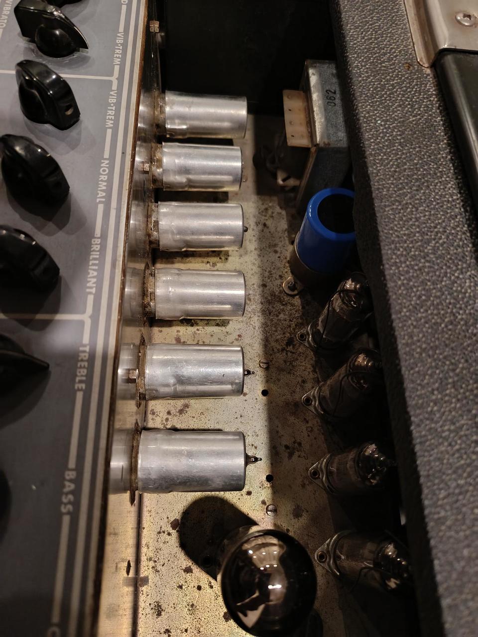 Prodám VOX AC-30 celolampové kombo, raritní model s reverbem z roku 1970-71. Aparát má nové filtrační kondenzátory a usměrňovací elektronku GZ34 JJ. Uvnitř originál (trafa, kondenzátory Mullard), nic nechrastí, neškrčí. Hraje moc pěkně, zvuk je měkký a zároveň dynamický, výborně si rozumí se zkreslením. Elektronky v prampu jsou proměřené, v pořádku. Koncové jsou zatím OK, mohu je případně vyměnit za nové JJ (+2500).