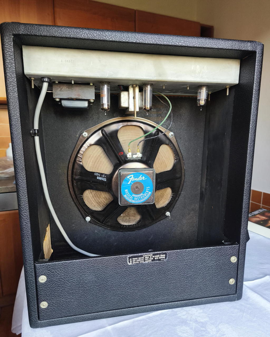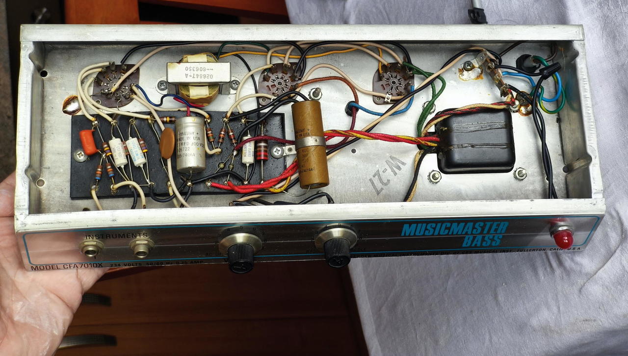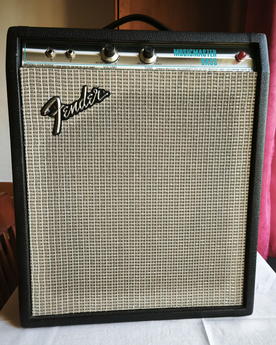 Prodám celolampové baskytarové kombo Fender Musicmaster Bass Amp z roku 1977 ve stavu muzeálního kusu s minimálními známkami opotřebení a černým látkovým povlakem. Kombo je už z výroby nastaveno na evropské napětí 230V. Basový zesilovač Fender Musicmaster Bass byl poprvé představen v roce 1970 jako doplněk k basové kytaře Fender Musicmaster Bass, kterou rovněř prodávám, základnímu studentskému basovému vybavení firmy Fender. Je to jednoduchý zesilovač s jedním kanálem a pouze dvěma korekcemi - hlasitostí a tónovou clonou. Je osazen 12" reproduktorem Fender, předzesilovací elektronku 12AX7 a koncovými elektronkami 6BQ5 (EL84), miniaturními heptalovými pentodami, s výstupním výkonem 12 W. Vyráběl se do roku 1982. Tato verze nemá vypínač, ale zapíná se otočením knoflíku Volume.