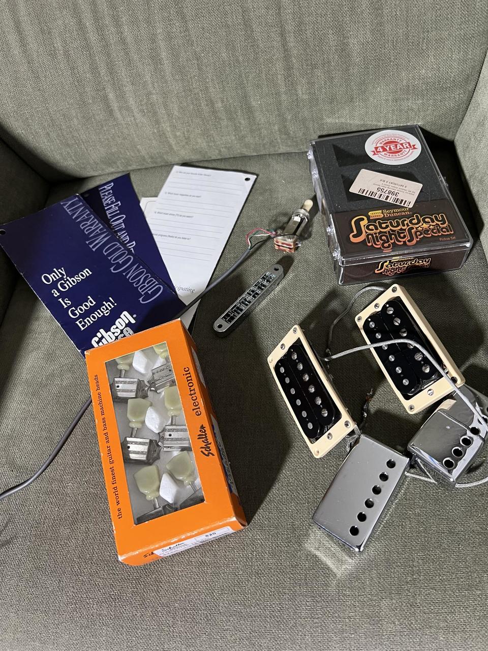 Vylepšení: - snímače Seymour Duncan Saturday Night Special, Alnico 4, skvěle zpěvné, citlivé i drzé, otevírají kytaru víc než původní silné snímače - 50's wiring jako u starých Les Paulů – zachování dynamiky a výšek při stažení volume - nová kobylka TonePros Locking - vintage vyšší rámečky snímačů od firmy Wizz Pickups - kovové pointery pod knoby potenciometrů – přehlednější a vintage look - nový přepínač snímačů - pohodlné velké jumbo pražce - zamykatelné ladicí mechaniky Grover - zbroušené, vyleštěné pražce, profesionálně seřízeno na 010 struny Součástí balení: - původní snímače Gibson 498T a 490N - původní kobylka Gibson - původní přepínač snímačů - původní rámečky snímačů - sada vintage ladicích mechanik Schaller pro původní look Důležité issues: - vertikální prasklina na hlavě vedle přilepeného křídla, klasický LP syndrom, konzultováno nezávisle s různými kytaráři, doporučují s ní aktuálně nic nedělat, drží takto 23 let, jinak je krk bez chyby - odstraněné původní “zoubky” lemů kolem nových pražců (je to ve výsledku i lepší pro bending) - strhané hlavičky šroubků, které drží pohromadě původní gibsonovské snímače (nemá vliv na zvuk, snímače drží pevně pohromadě) - originální pouzdro, které má už něco za sebou, ale poslouží a ochrání Léta to byla moje hlavní kytara, táhla to se mnou aktivně aspoň na třech deskách. Prodávám, protože mám ještě custom shop, takže na ni hraju málo a takhle kytara si hrát zaslouží. Osobní vyzkoušení a předání v Brně.