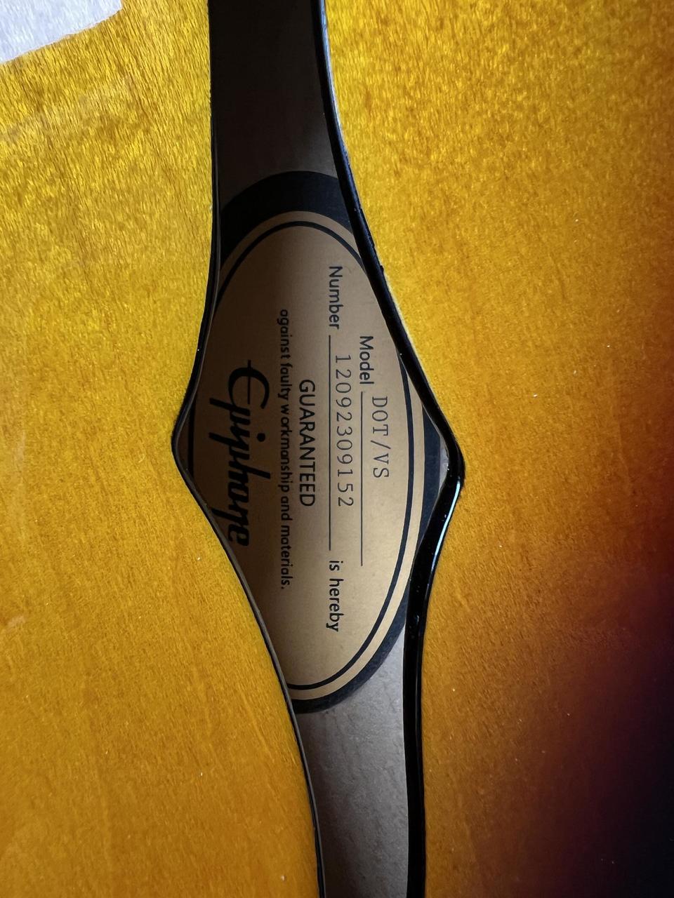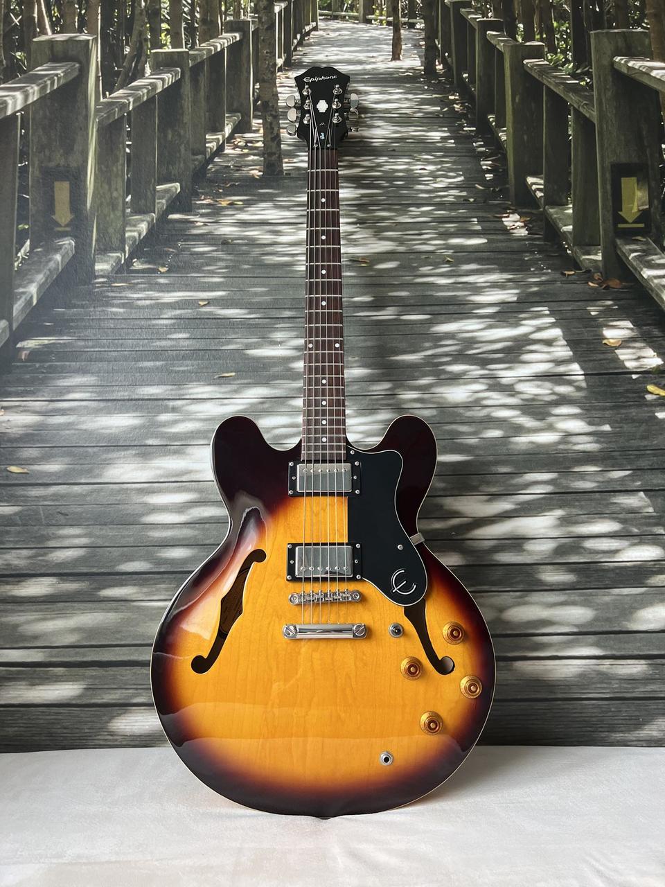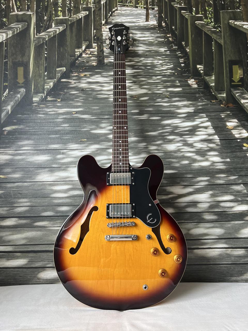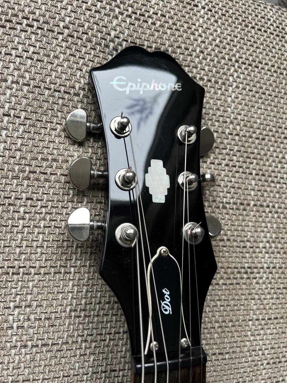 Prodám perfektně zpívající hollow-body Epiphone - vyrobena 2012 - z dílny Epiphone s nádherným vintage sunburst finišem. Osazena dvěma humbuckery, každý má svoji tónovou clonu a hlasitost, na hlavě mechanikami Grover. Předností je dost dlouhý krk, takže se dá v pohodě hrát i v polohách okolo 20. pražce. Je to vlastně ES-335, jen na hmatníku má tečky. Odtud její název Dot