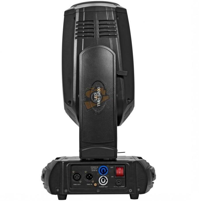 Otočná hlavice s kvalitním COB (chip-on-board) 200W LED světelným zdrojem a nespočtem funkcí - polohování do 540 PAN a 270 TILT, auto, master / slave a DMX režim, barevné kolo s 9 dichroickými barevnými filtry, duhový efekt s nastavitelnou rychlostí v obou směrech, rotující 3-fazetový hranol, dvě gobo-kola, první s 9 statickými kovovými gobo efektyy, druhé se 7 rotujícími. Vše doplněno o frost filtr, stroboskopický efekt s 1-18 záblesky za sekundu, stmívač nebo zoom. Vestavěný port USB s fantomovým napájením pro přijímače QuickDMX, řídicí deska s LCD a fóliovou klávesnicí pro nastavení výchozí adresy DMX, polohování a další nastavení. Hlavice obsahuje svorky P-Con pro připojení a napájení až 8 jednotek.