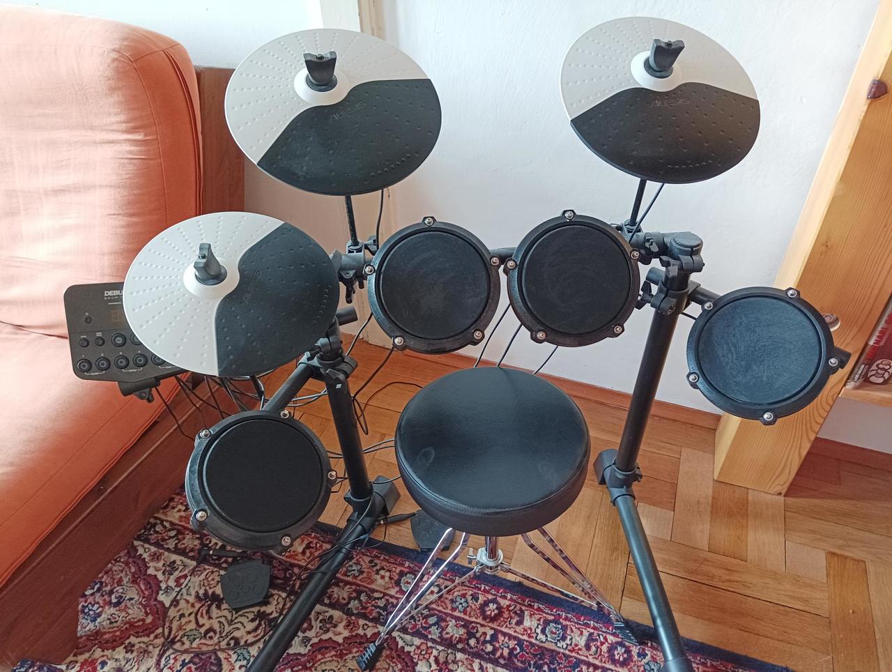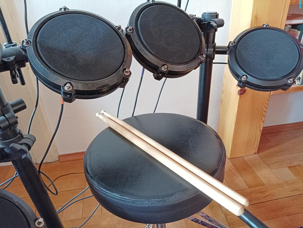 Prodám tyto elektronické bicí (včetně stoličky a paliček). Vizuální stav je perfektní, byly velmi málo používané. Funkčně: je vada v kabelu (místo kopáku hraje ride činel - .samotné pady jsou funkční, modul taktéž. Na opravu kabelu nebo jeho výměnu nemám čas, proto prodávám tak, jak to je. Pro někoho bude oprava hračka.