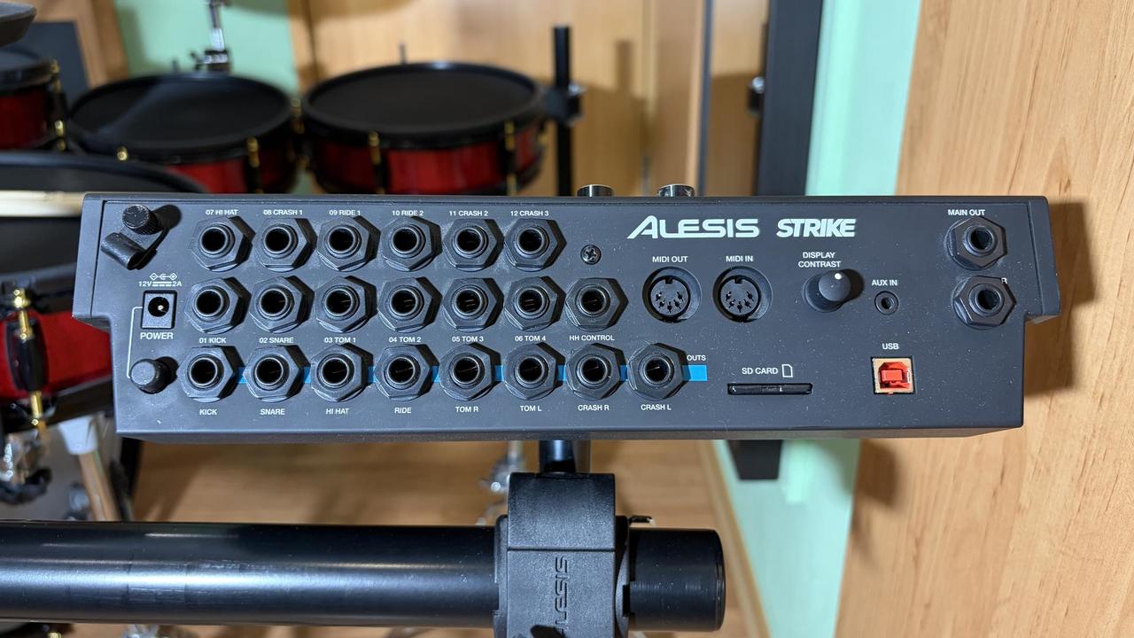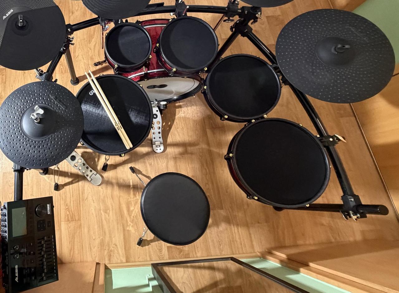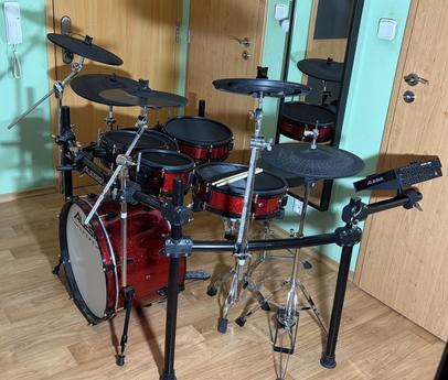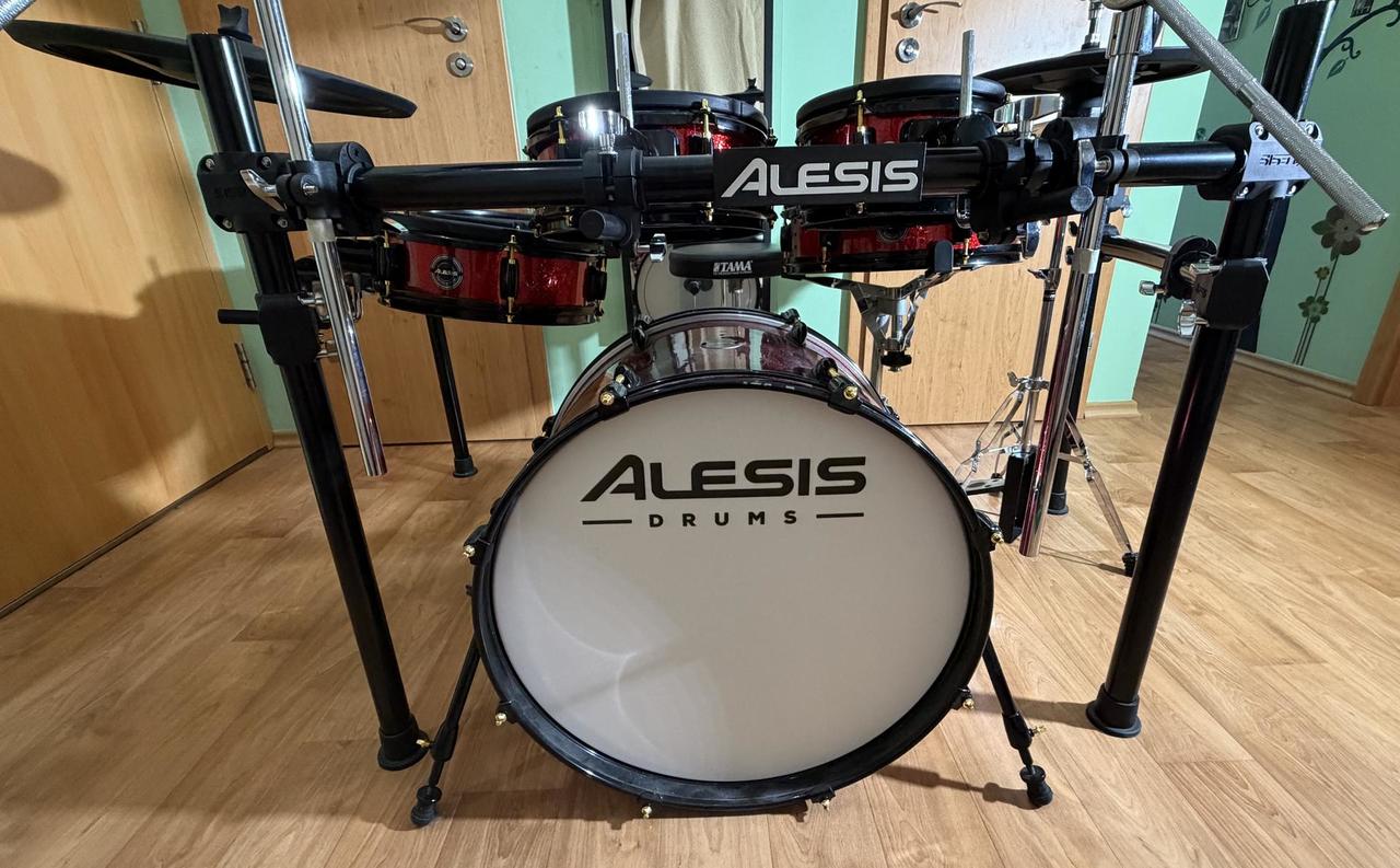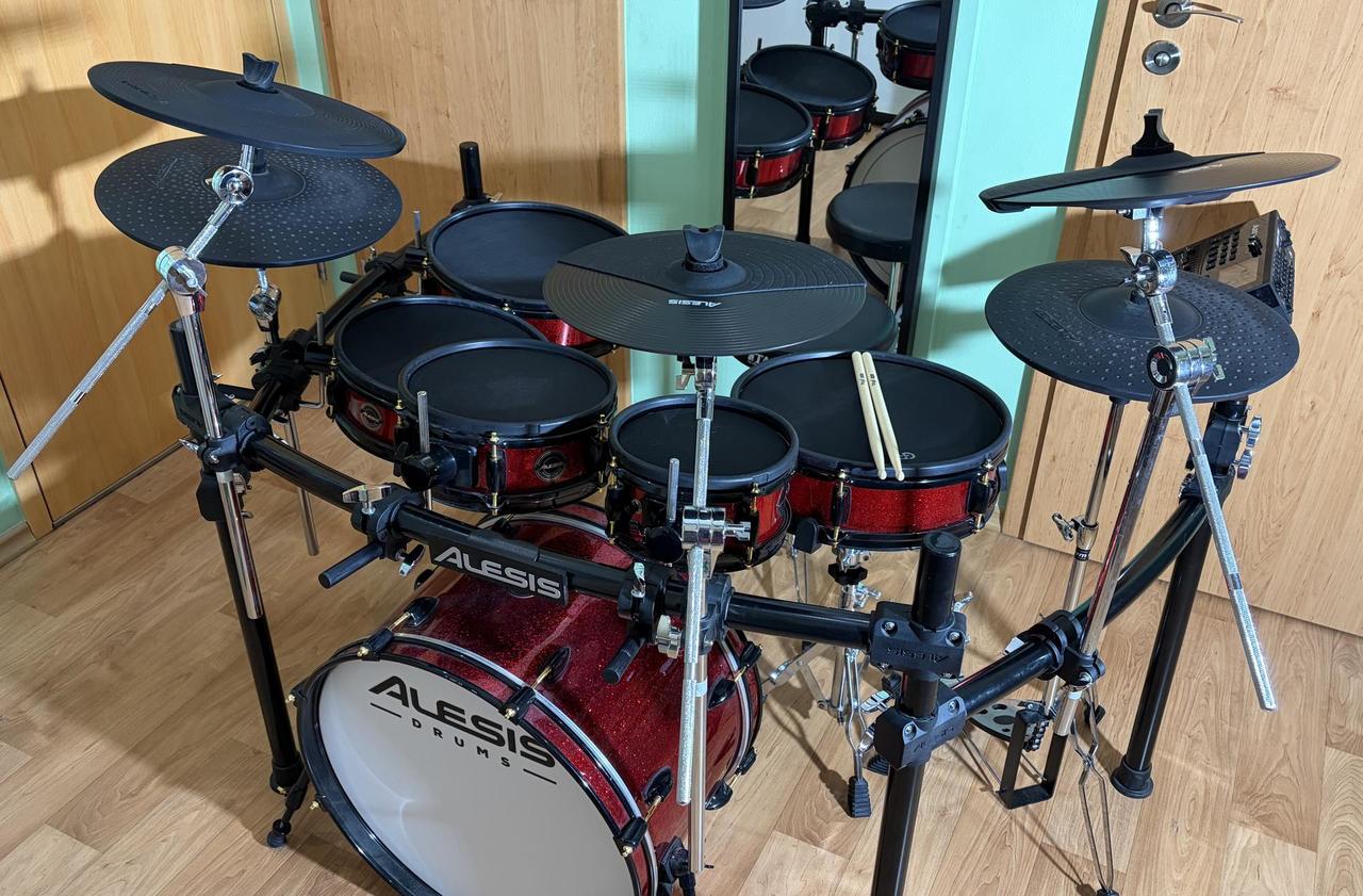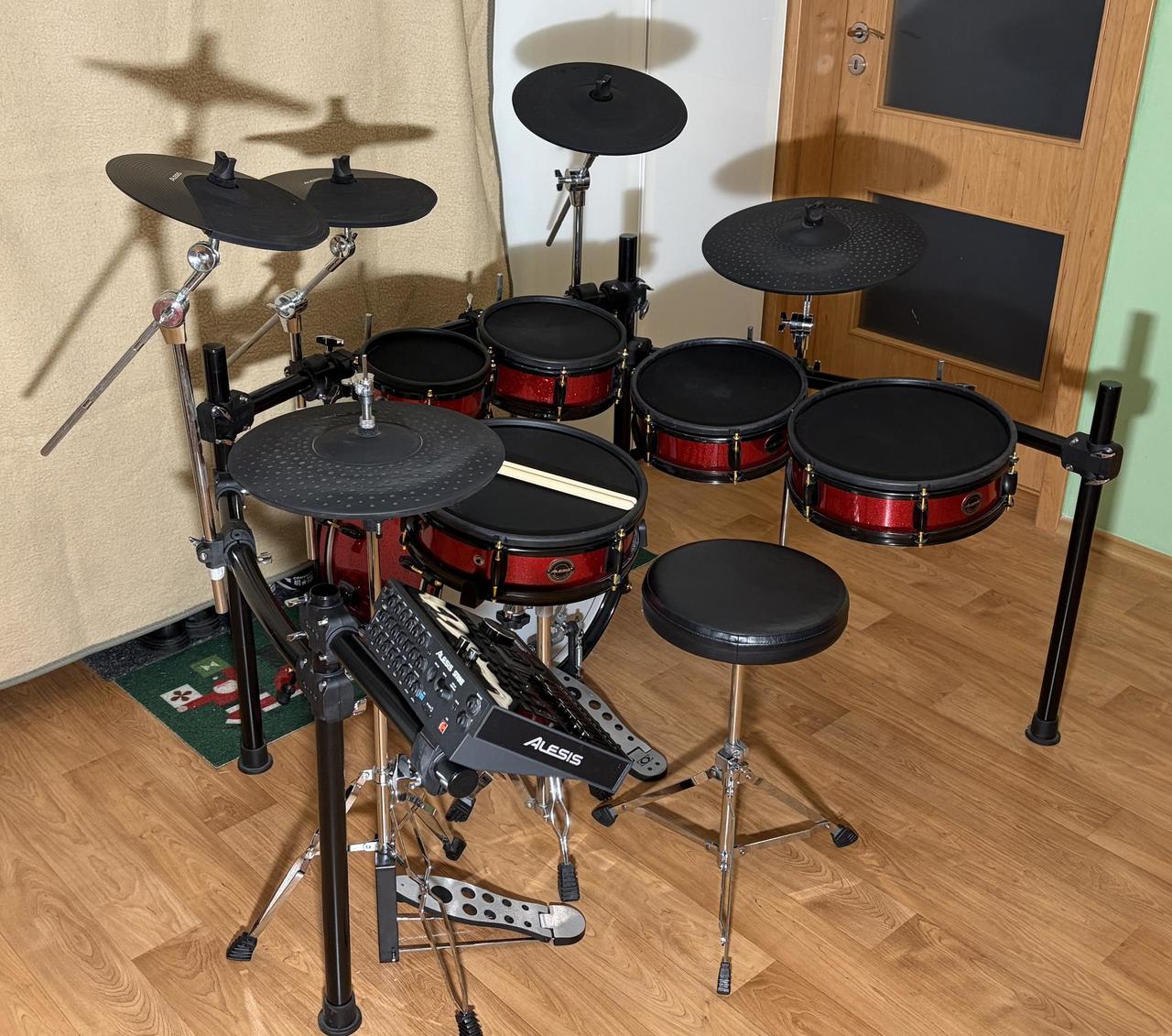 Včetně příslušenství: - pedál k basovému bubnu - stojan na Hi-Hat - bubenická stolička - bubenická sluchátka Alesis Kupované na kytarách.cz v roce 2022. Osazeno novými černými dvouvrstvými MESH blánami (snare + všechny tomy). Jen vážnému zájemci. Osobní odběr (předvedení a vyzkoušení). Původní cena 80.000,- Super stav (pouze lehce prasknuté ochranné sklo na displeji - nemá vliv na funkci displeje). Foceno bez zapojených kabelů. Popis: 11-dílná profesionální elektronická souprava bicích nástrojů se síťovými blánami společnosti Alesis. Strike Pro Special Edition obsahuje 20"" basový buben, který v kombinaci se síťovými blánami a zvukovým modulem přináší autentický pocit při hře. Bicí obsahují síťové blány nové generace na všech dvoj-zónových padech - snare a tom bubny. Přinášejí vynikající odezvu a přirozený pocit při hře. Sada nabízí 3-zónový 16“ ride činel, 3 x 14"" crash činel a 14"" hi-hat činel. Činely s gumovou povrchovou úpravou zajišťují realistický pocit, vynikající kontrolu a odezvu při úderech. Ve srovnání s tradičními elektronickými činely přinášejí tišší provoz, což je vhodné při hře v domácnosti. Zvukový modul obsahuje 136 bicích souprav, 1800 nástrojů a 45000 zvukových vzorků. K dispozici je zabudovaný sampler, 16 GB externí paměťová karta a USB/MIDI pro připojení k DAW software. Elektronické , bicí , bubny , sada , mesh , souprava .