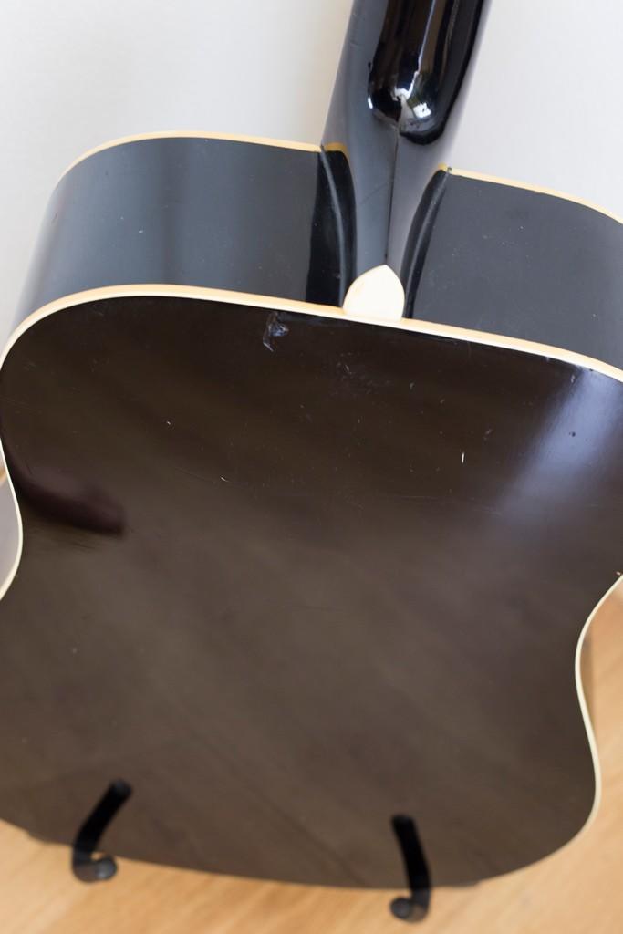 O japonské řemeslné tradici není sporu a v průběhu 70-tých a 80-tých let vyráběli velmi kvalitní kytary, které se rovnaly a některé i překonávali produkci amerických kytar, především Martin a Gibson. S korejskou a čínskou produkcí vůbec nelze porovnávat! Tento model je alternativou ke Gibsonu v černém provedení se smrkovou horní deskou a mahagonovými zády a boky. Kytara typu dreadnought s typickou vlnkou ala Gibson hlavou. Vsádka sedla je z kosti,a šířka nultého pražce cca 49mm. Krk má komfortní tvar a je bez jakýchkoliv deformací. Mechaniky, pražce i palisandrový hmatník ve velmi dobrém stavu. Má plný a vyvážený projev s velkým objemem a hlasitostí. Na kytaře jsou nataženy struny Martin Bronze 10-47, a je seřízena s nízkým příjemným dohmatem. Na kytaru se hojně i často hrálo a na jejím stavu je to znát. Má několik šrámů a odřenin (již zohledněno v ceně), ale díky tomu je skvěle vyhraná a získáte neobvyklý kousek s vysokou historickou hodnotou (více jak 40-let doby vzniku) se skvělou hratelností i dnes! Ideální by bylo osobní předání (jihočeský kraj nebo na cestě ČB-PHA), případně možno poslat.