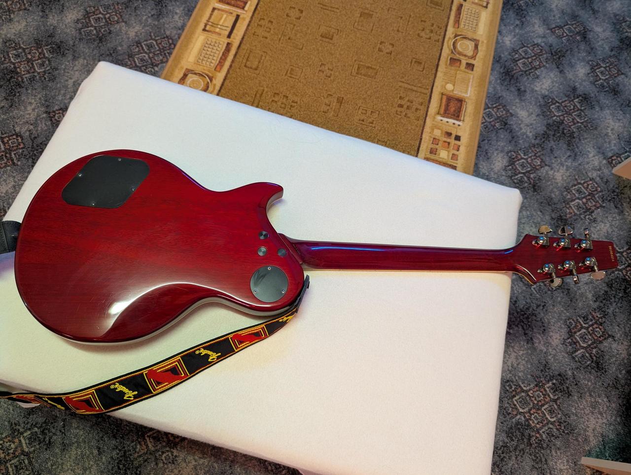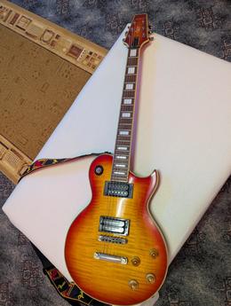 Tato krasavice vypadá jako grounge pádlo, ale je to metalová, celomahagonová pila, vlastně nejtvrdší, na jakou jsem kdy hrál. Prošla pár úpravama, včetně výměny snímaču - kobylkového SD SH13 dle Direla Dimebaga z Pantery, krkový je SD Jazz. Třeba slyšet a přesvědčit se.