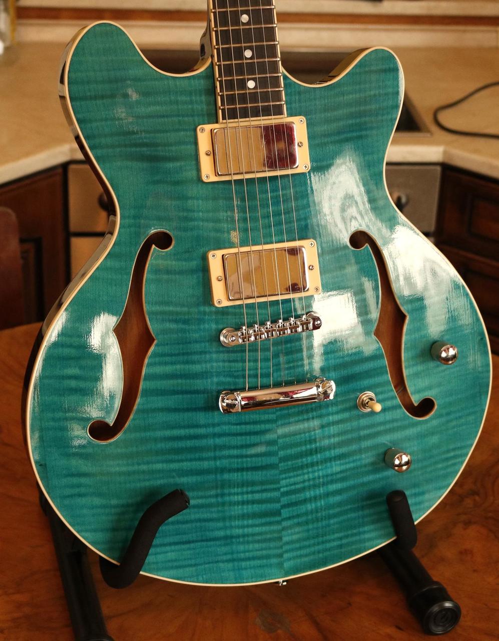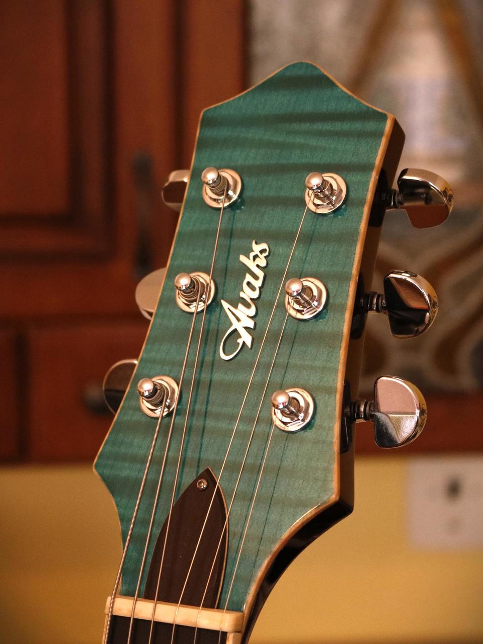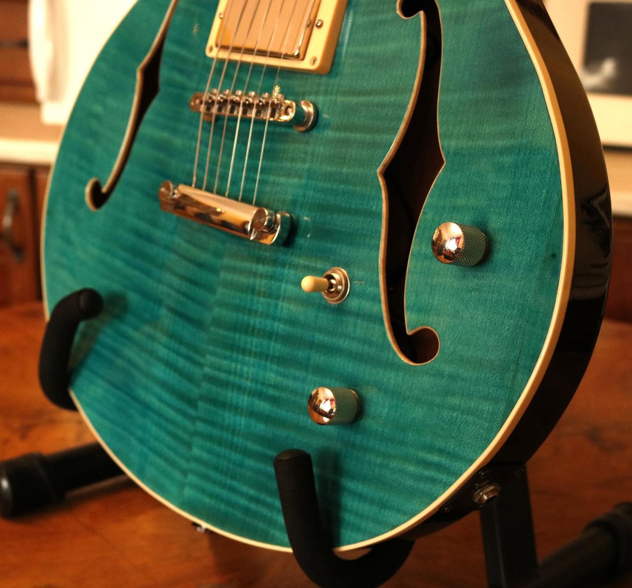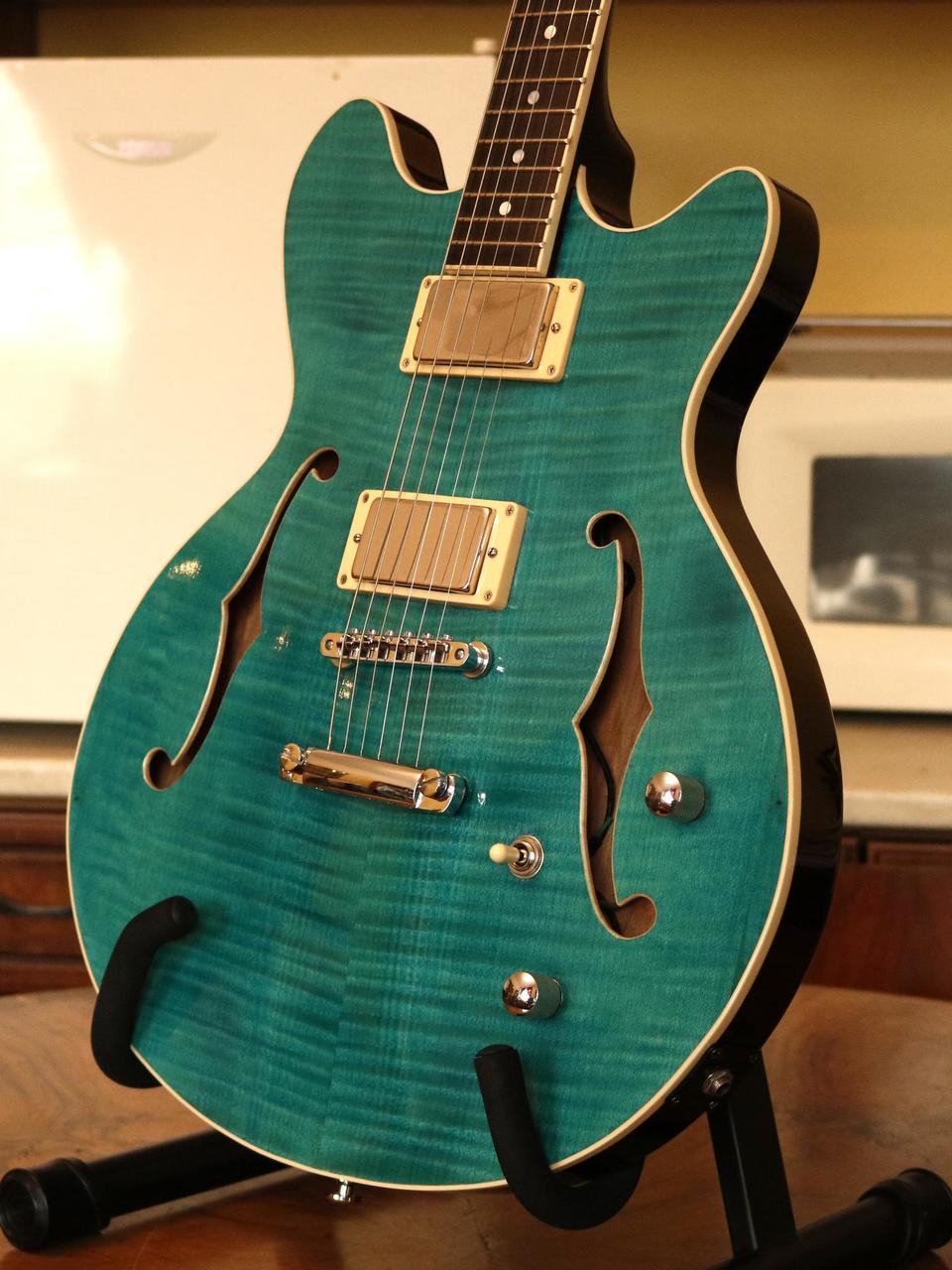 Výjimečná pololubová kytara ve stylu ES-335 od ukrajinské značky Avaks – raritní kus s jedinečným původem.