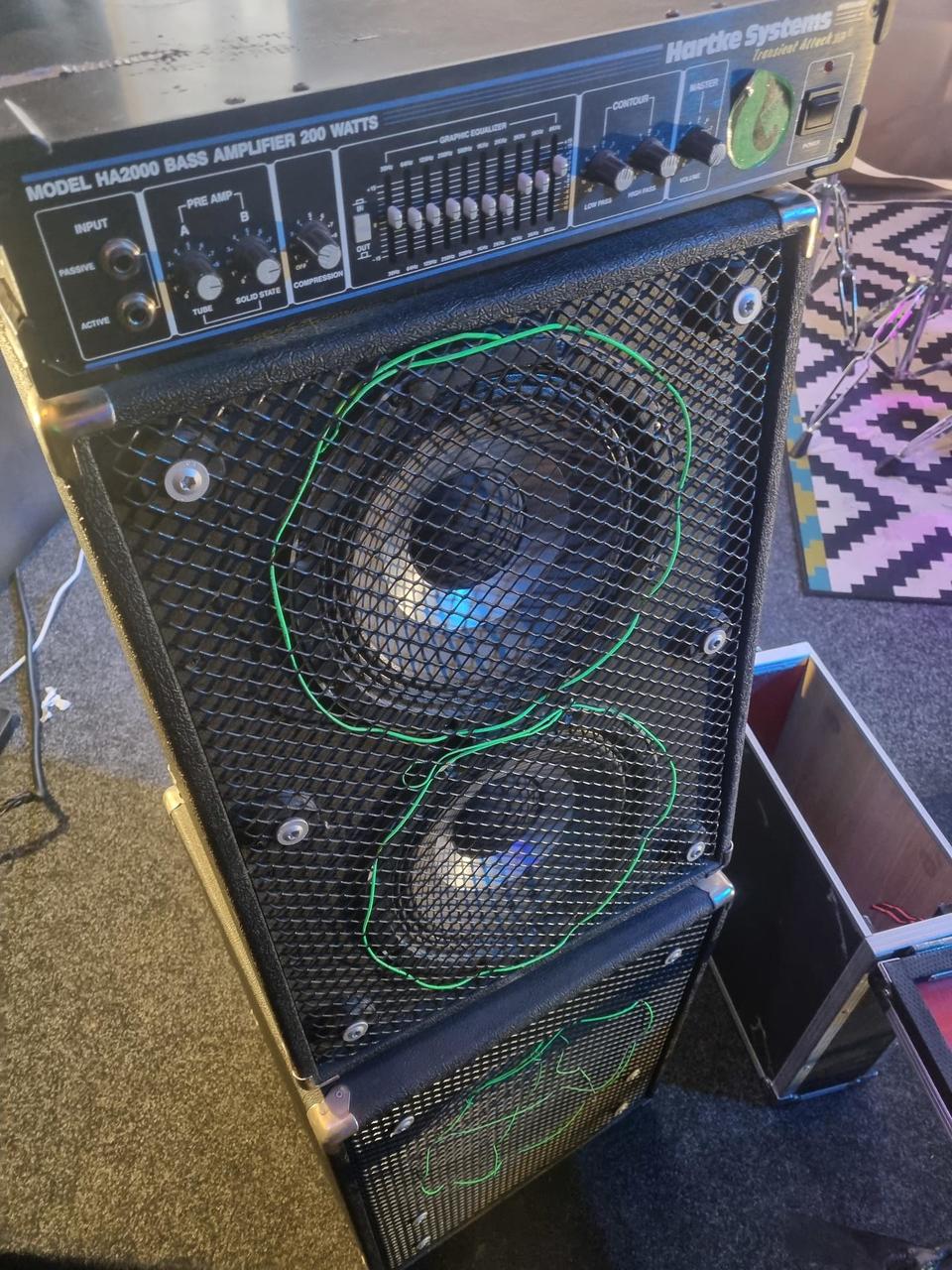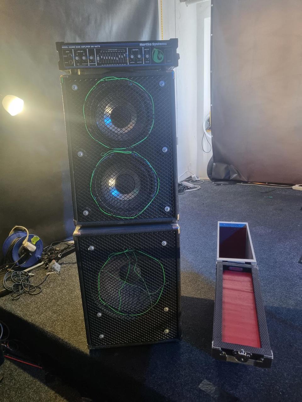 Bedna 1x15" Beyma SM115/N, 400W 8 Ohm; bedna 2x10" Hartke 10HX 150, 150W 8 Ohm. Hlava Hartke 2000