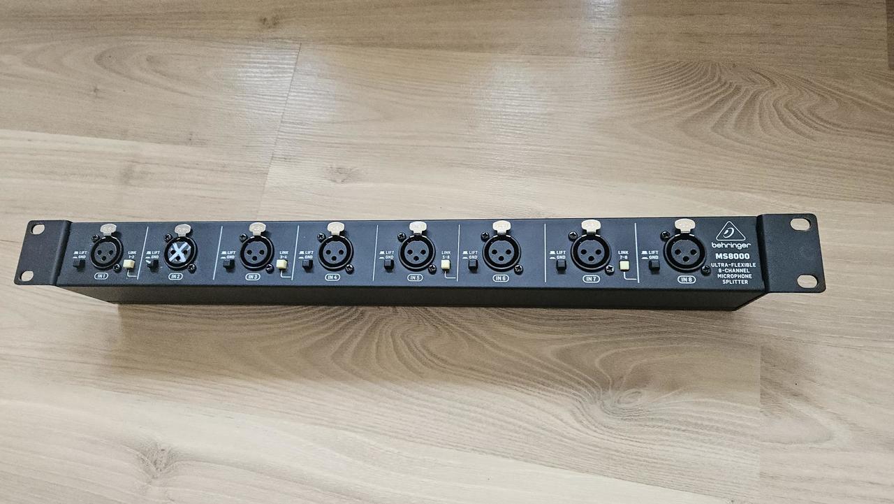Prodám mikrofonní splitter Behringer MS8000. Má upadlou pacičku u západky druhého vstupního XLR, který je označen křížkem. Závada se dá obejít tak, že se použije XLR samec bez západky. Případně můžete konektor nahradit novým. Splitter je jinak v bezchybném stavu, vše krom té západky funguje jak má.