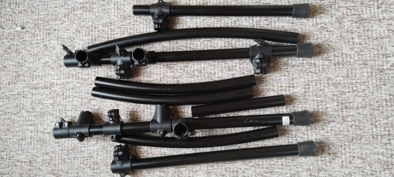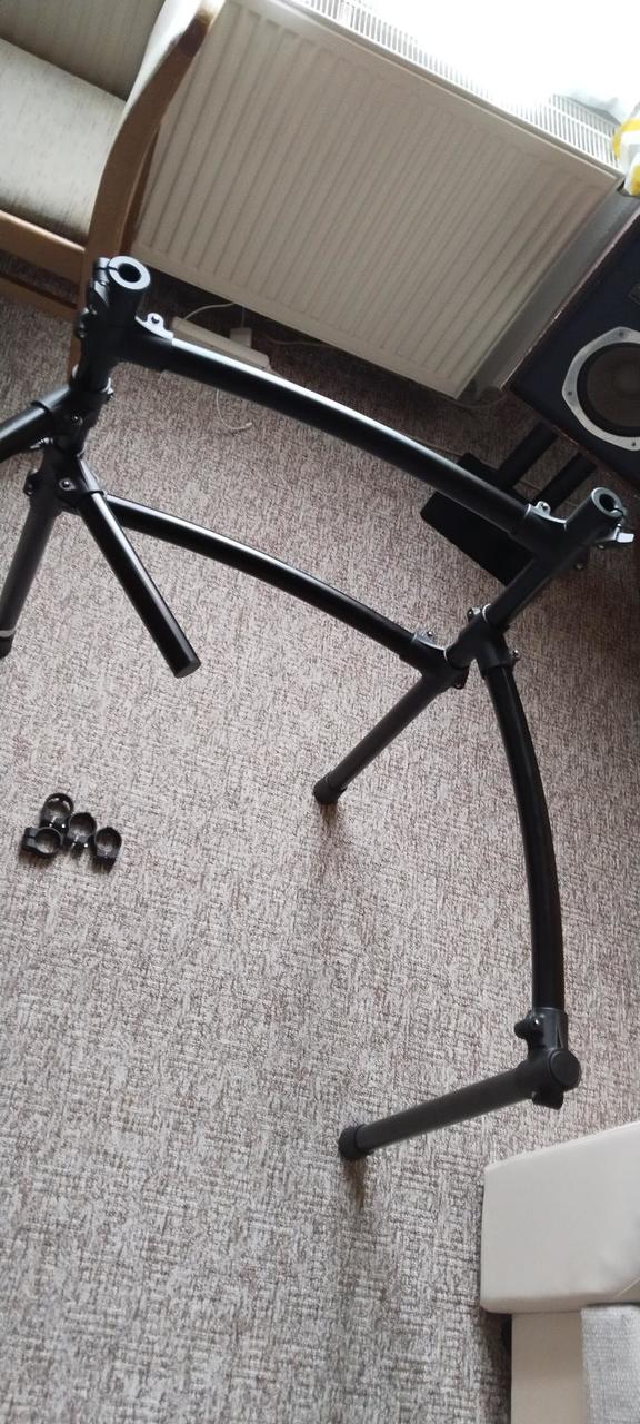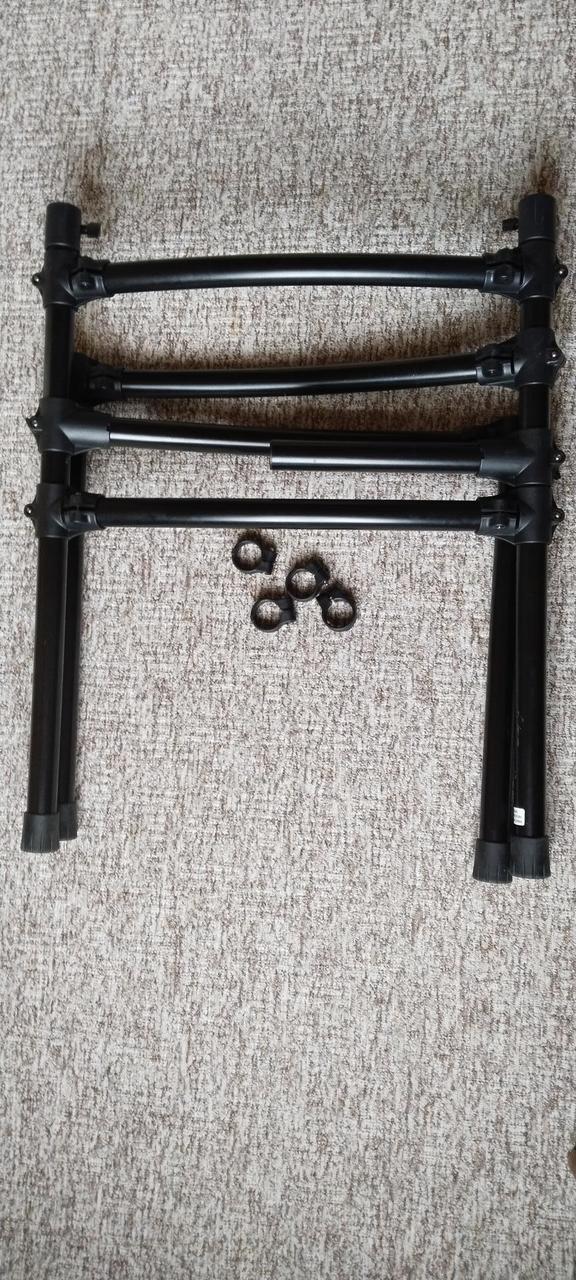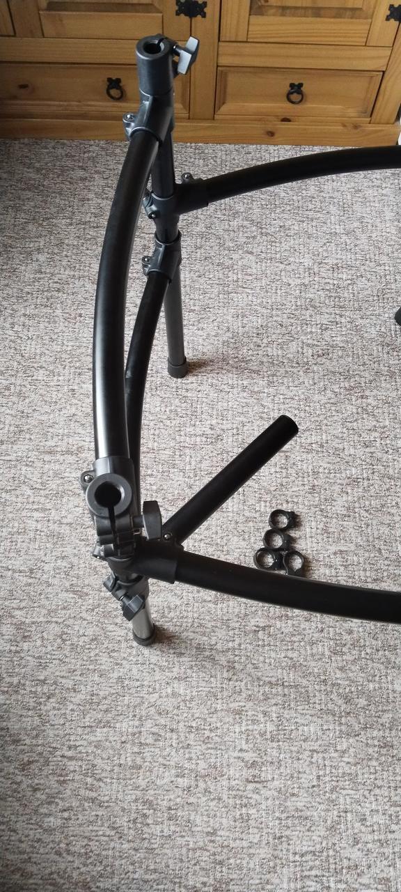 Prodávám pouze samotnou rampu, bez ramen, držáku a kabelů. Součástí jsou 4 nohy, 5 tyčí, dvě svorky na ramena, 9 rohových spojovacích svorek, 4 paměťové svorky, 3 krytky konců tyčí, 4 gumové návleky na nohy. Tato rampa umožňuje přichycení dvou ramen na činely přímo do těla rampy, pomocí dvou clampů v obou vysokých nohách. Mohu zaslat i na dobírku.