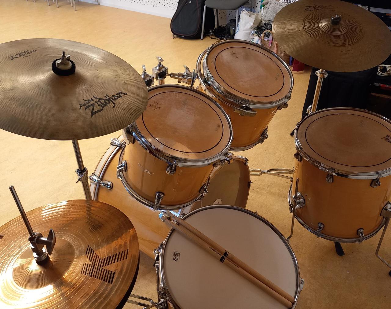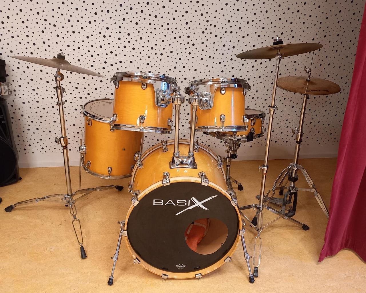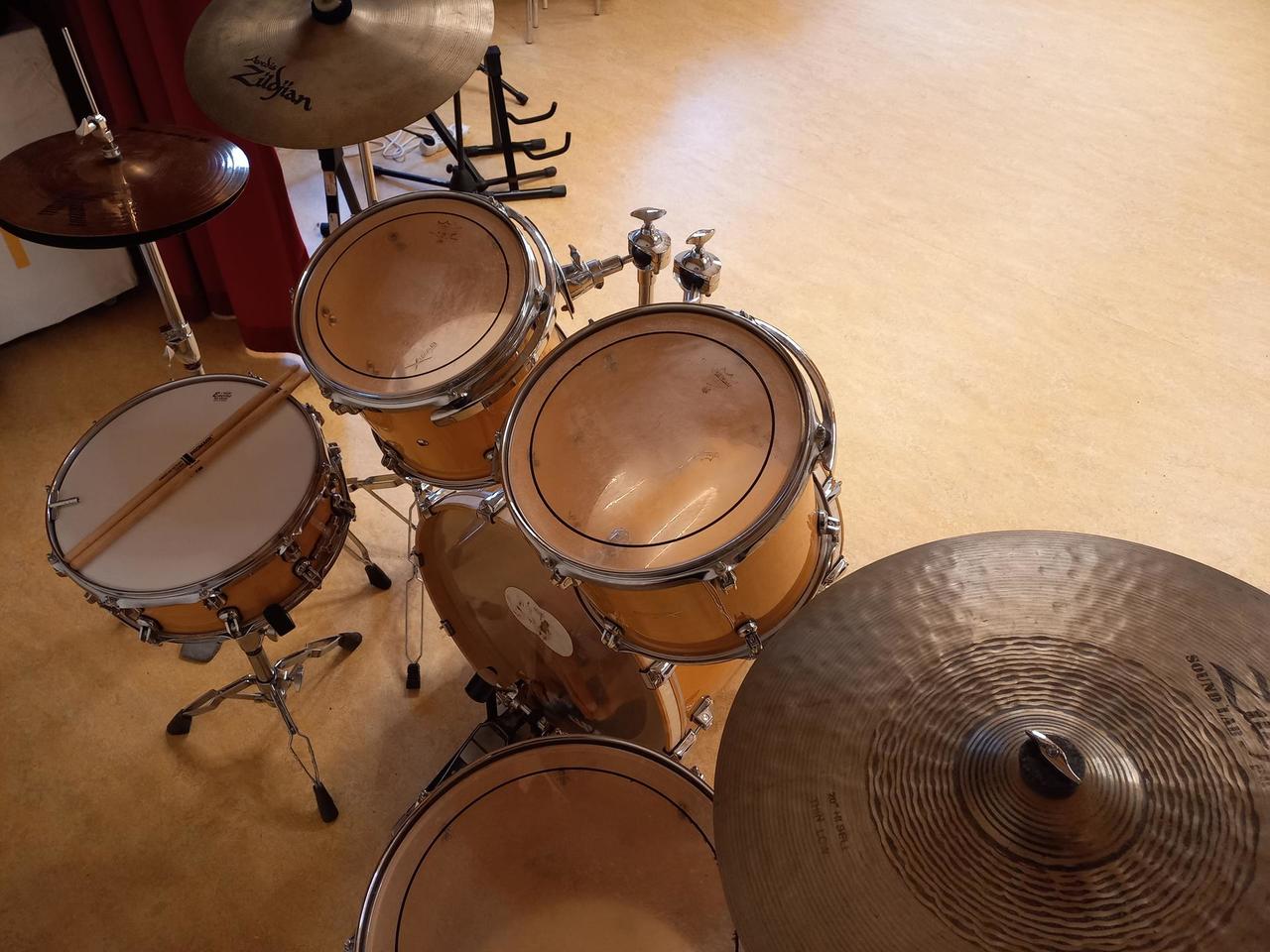 Kompletní bicí souprava Basix Custom - lakované, barva nature a činely Zildjian Avedis.