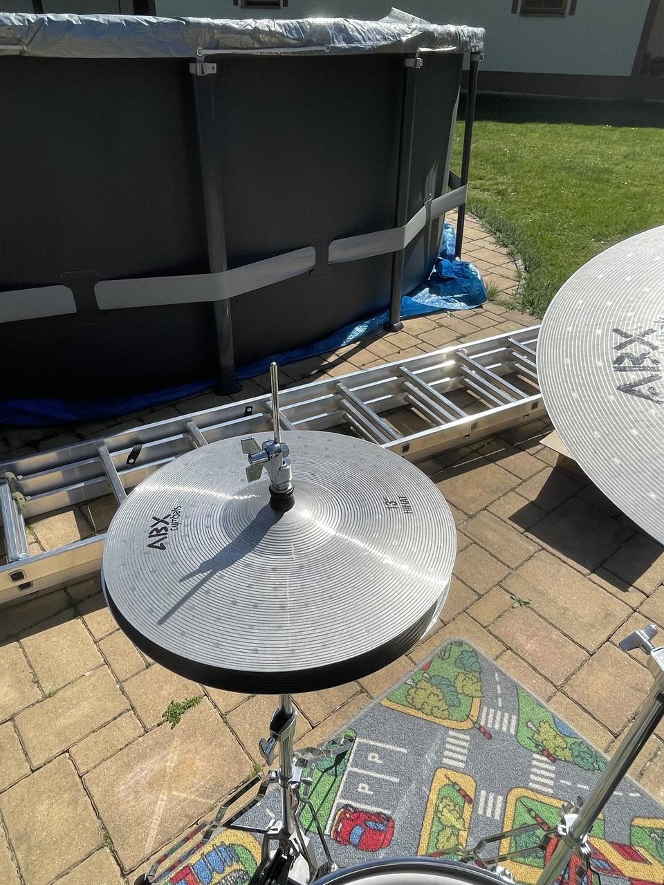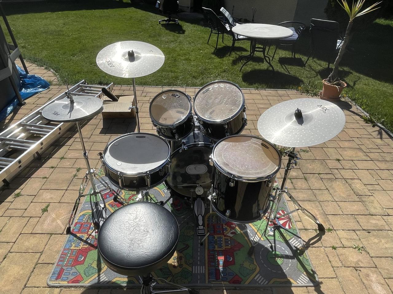 NA CENĚ SE DÁ DOMLUVIT!!! sestava obsahuje: Bicí: Bass drum 20", Tomy 10" a 12", Floor tom 14", Snare 14"×5". Činely ABX: Hi-hat 13", Crash 16", Ride 18". Hardware: Všechny původní stojany (stojan na snare, hi-hat, činelové stojany a pedál).