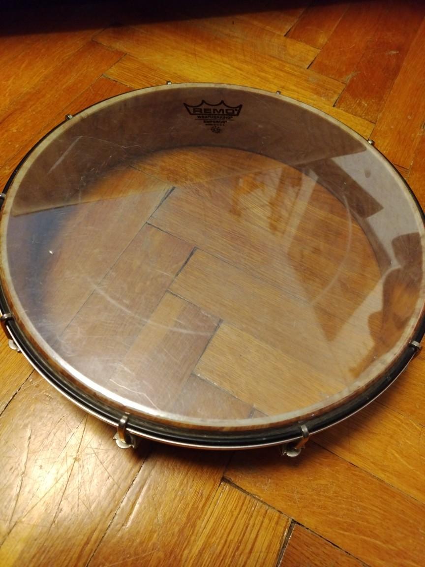 Možnost jako roto-tom, nebo ruční buben, tamburína, ... Plastový, do každého počasí. Šrouby pro možnost doladění. Málo používaný (spíše nepoužívaný), zachovalý. Blána Remo, lehce používána, ale bez ďůlků. Hrálo se na něj vesměs rukama, výjimečně paličkou.