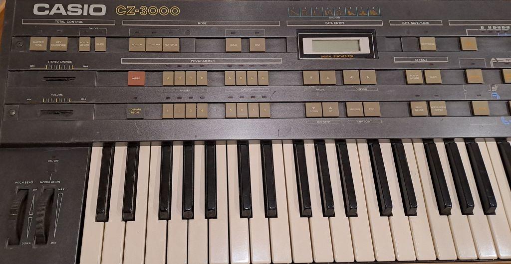 Casio CZ3000 (61) - všechny klávesy, MIDI, displej a potenciometry funkční, tlačítka fungují, ale nespolehlivě na několikátý stisk, vidím to na kompletní výměnu tlačítek. Neoriginální vypínač, nějaké škrábance.