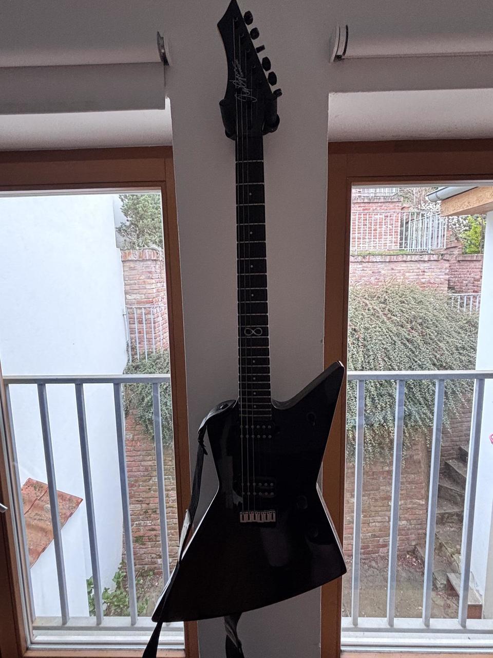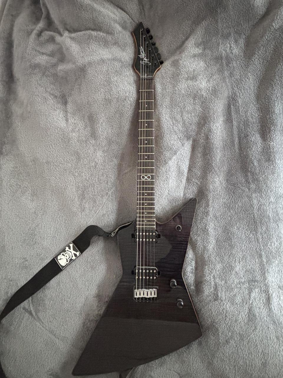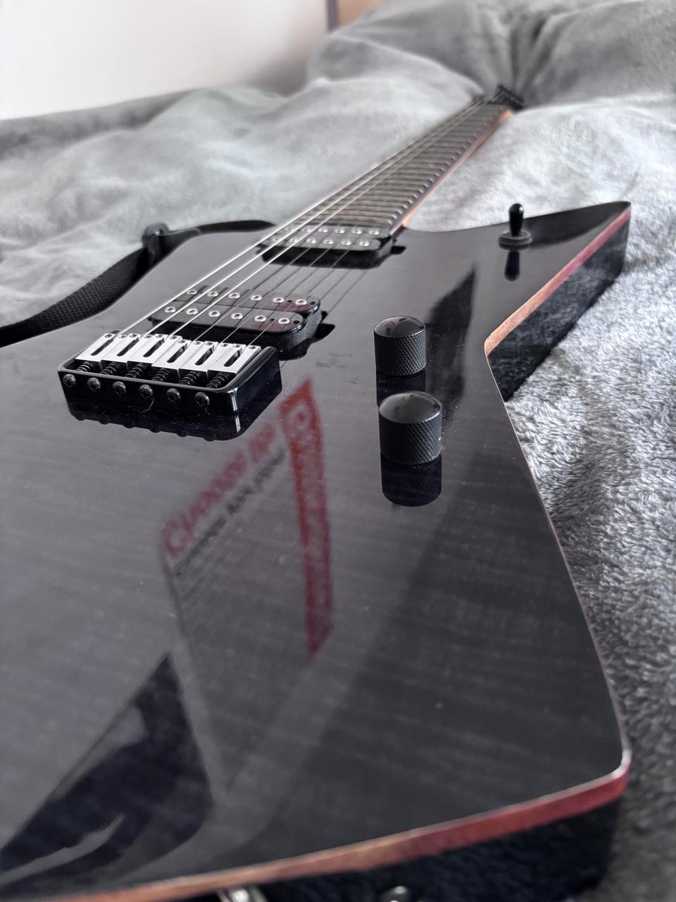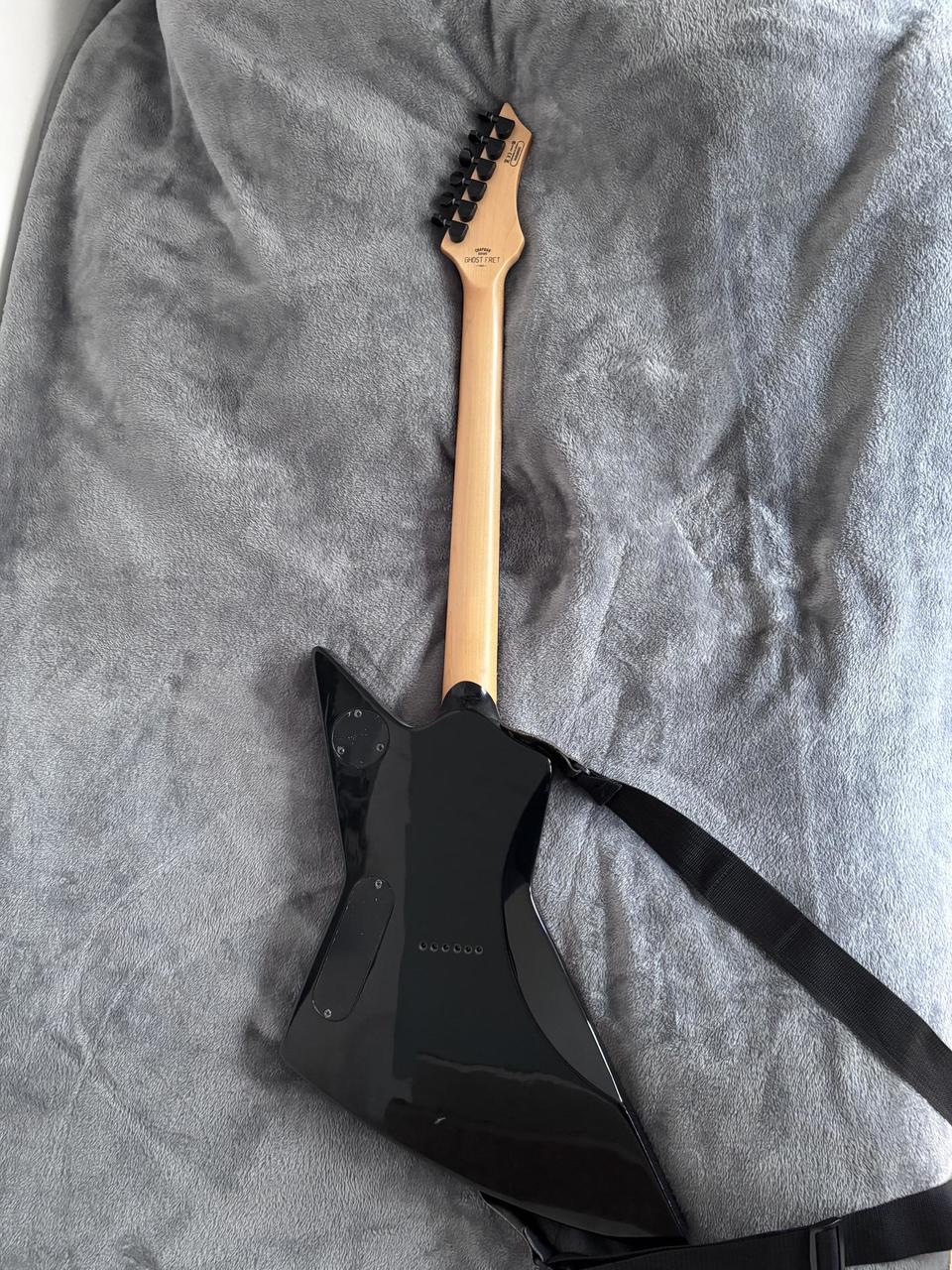 Elektrická kytara Chapman Ghost Fret Explorer v2 v černé barvě. Mahagonové tělo v kombinaci se set-through javorovým krkem zajišťuje bohatý sustain a výrazný midrange. Ebonový hmatník s jumbo frets a rádiusem 350mm – pohodlná hratelnost po celém hmatníku. Humbuckery Chapman Primordial Zero s push-pull coil splitem pro přepínání mezi humbucker a single coil zvukem. Hardtail string-through bridge pro stabilitu ladění a maximální sustain. Na těle jedno drobné škrábnutí viditelné na fotkách, hratelnost ani funkčnost kytary nijak neovlivňuje. S cenou se dá hýbat.