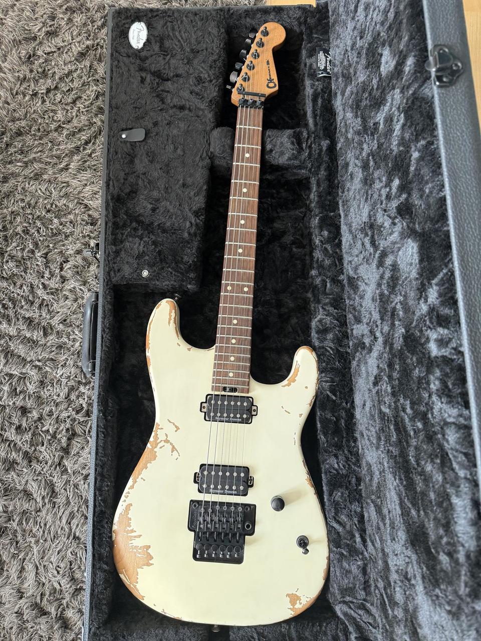 Specifikace zde: https://www.charvel.com/gear/shape/san-dimas/style-1/pro-mod-relic-san-dimas-style-1-hh-fr-pf/2965201376 Na nástroji Dunlop Straplocks, přidám původní. Ke kytaře kožený kufr Fender + mohu přidat gigbag Charvel. Kytara není vytížená, měla by hrát, posílám tedy dál.