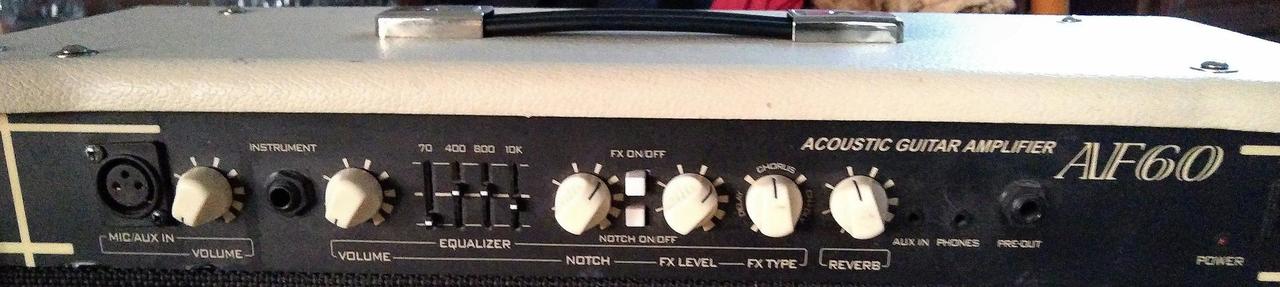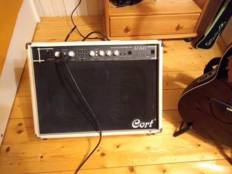 Kombo pro akustickou kytaru Cort af60 v dobrém a plně funkčním stavu. Osazení: 2x 8" plus tweeter, výkon 60w. Vstup pro kytaru a mikrofon, ovládané zvlášť. Kytarový vstup má ekvalizér, "notch" potenciometr pro odstranění zpětné vazby, chorus/delay a reverb. Dále vstup pro aux signál, výstup na sluchátka a jackový výstup pro PA a podobně. Celý popis je ve videu viz níže.