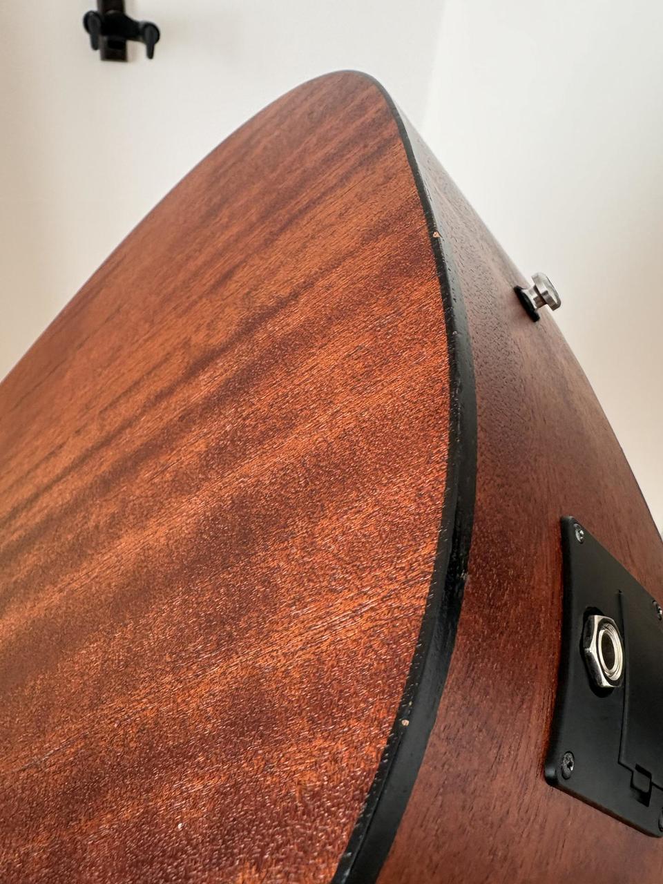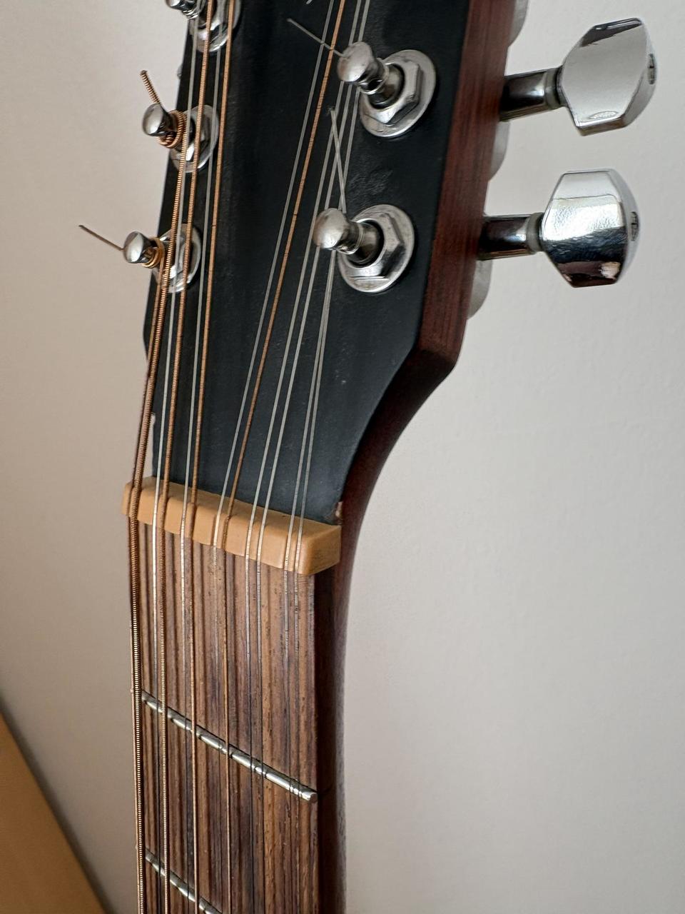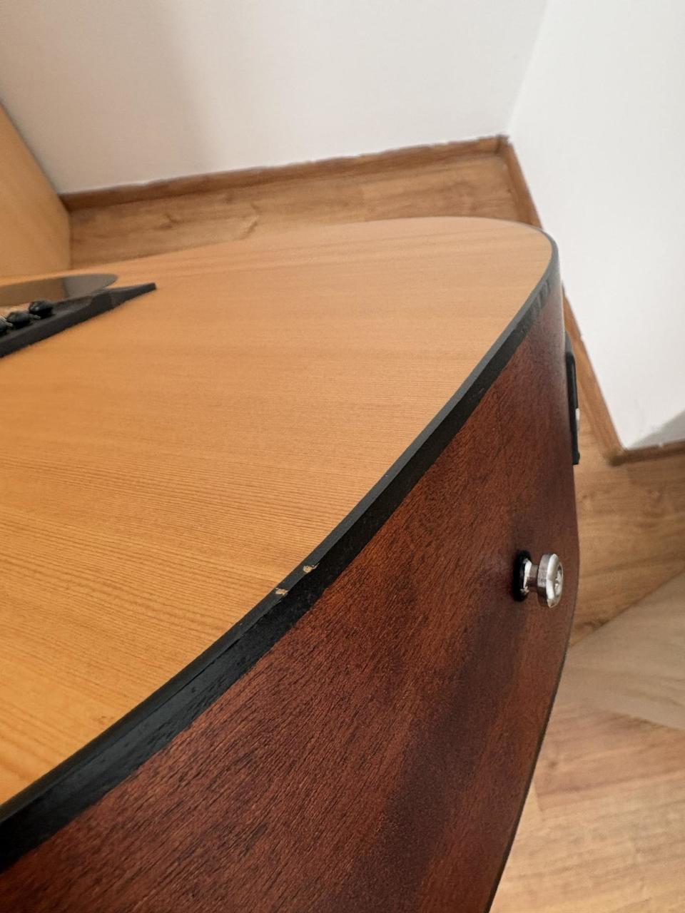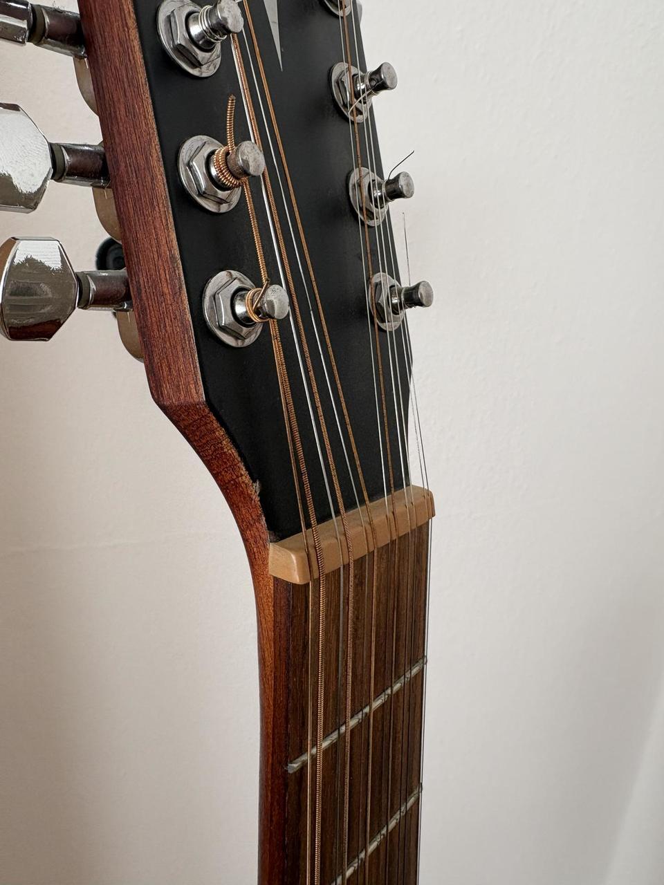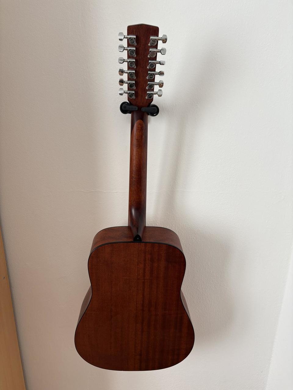 Přední deska smrk; zadní, boční deska a krk Mahagon. Pěkný, vyvážený, plný zvuk. Hrána na plesech, zábavách apod. pro obohacení zvuku. Signál vždy veden přímo do mixu bez efektů apod. Drobné oděrky z používání - viz foto, popřípadě mohu poslat další. Přepadala na hlavu, proto jsem odstranil kolíček z krku a měl kytaru na pásu připnutou "za hlavu", kolíček chybí. Elektronika Cort (ladička, výšky/středy/basy/volume). Používal jsem potenciometry na středu a zvukaři si nikdy nestěžovali :-) Jedná se o pěknou dvanáctistrunku za málo peněz. Lazení drží. Pouze osobní předání. V případě dotazů prosím volejte, není problém přidat další fotky apod... Cena i s obalem, pevná.