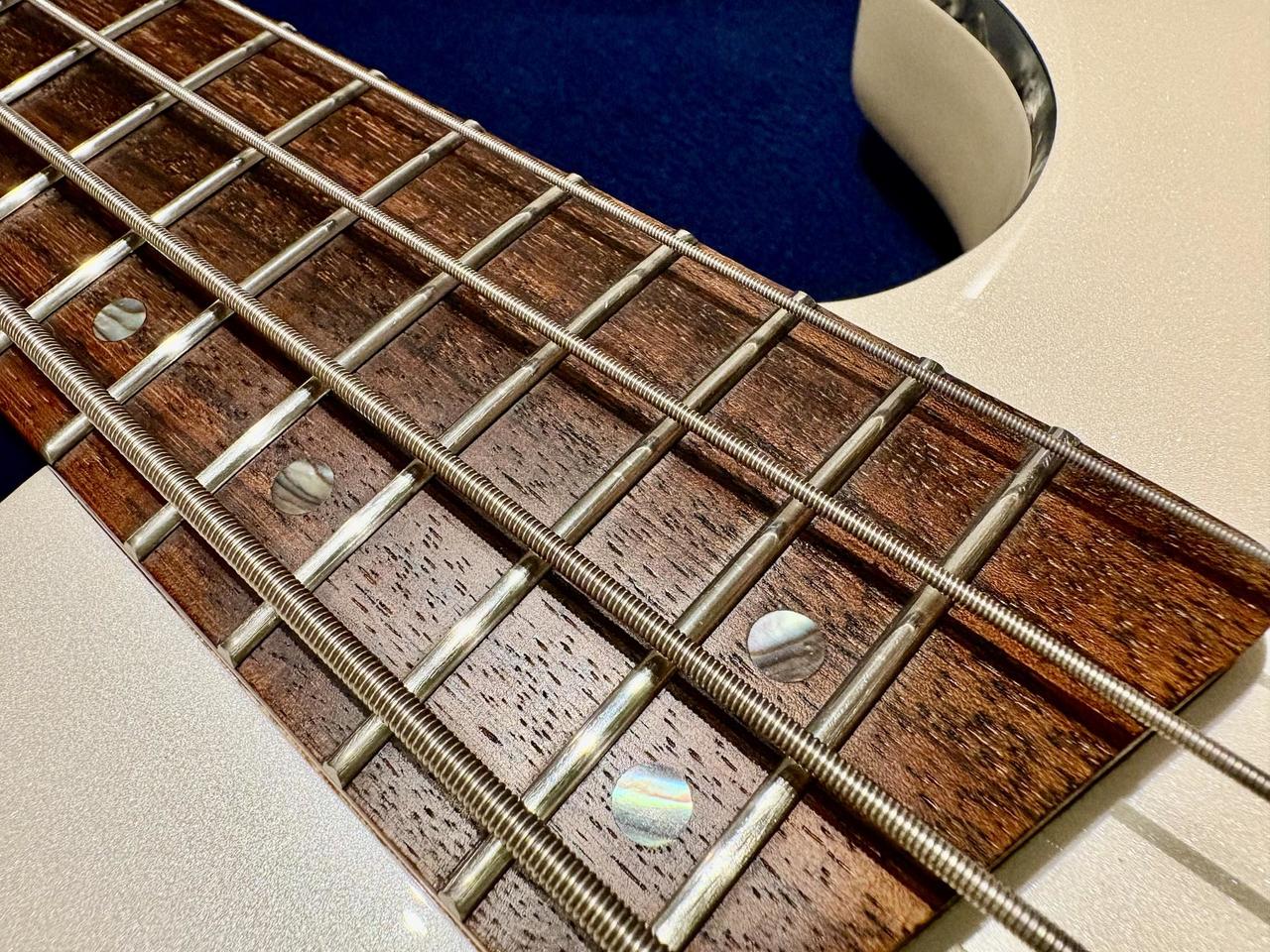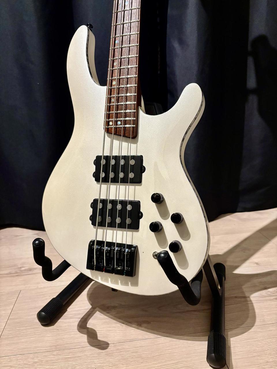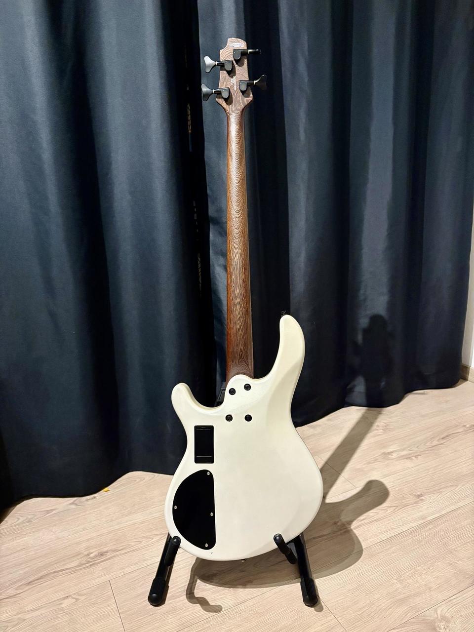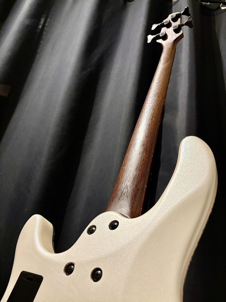 Popis: Elektrická basgitara, 4-strunová, menzúra: 34" - 864mm, krk: skrutkovaný,african wenge, telo: mahagón, lemovanie: perleťové, hmatník: palisander, snímače: 2x MBA4 Humbucker(H-H), 2 pásmový EQ(vypýnateľný) w/mid Boost Switch, Active/Passive conversion Push-Pull volume, ladiaca mechanika: Die-Cast, kobylka: EB12(4), hardware: čierny, farba: biela perla