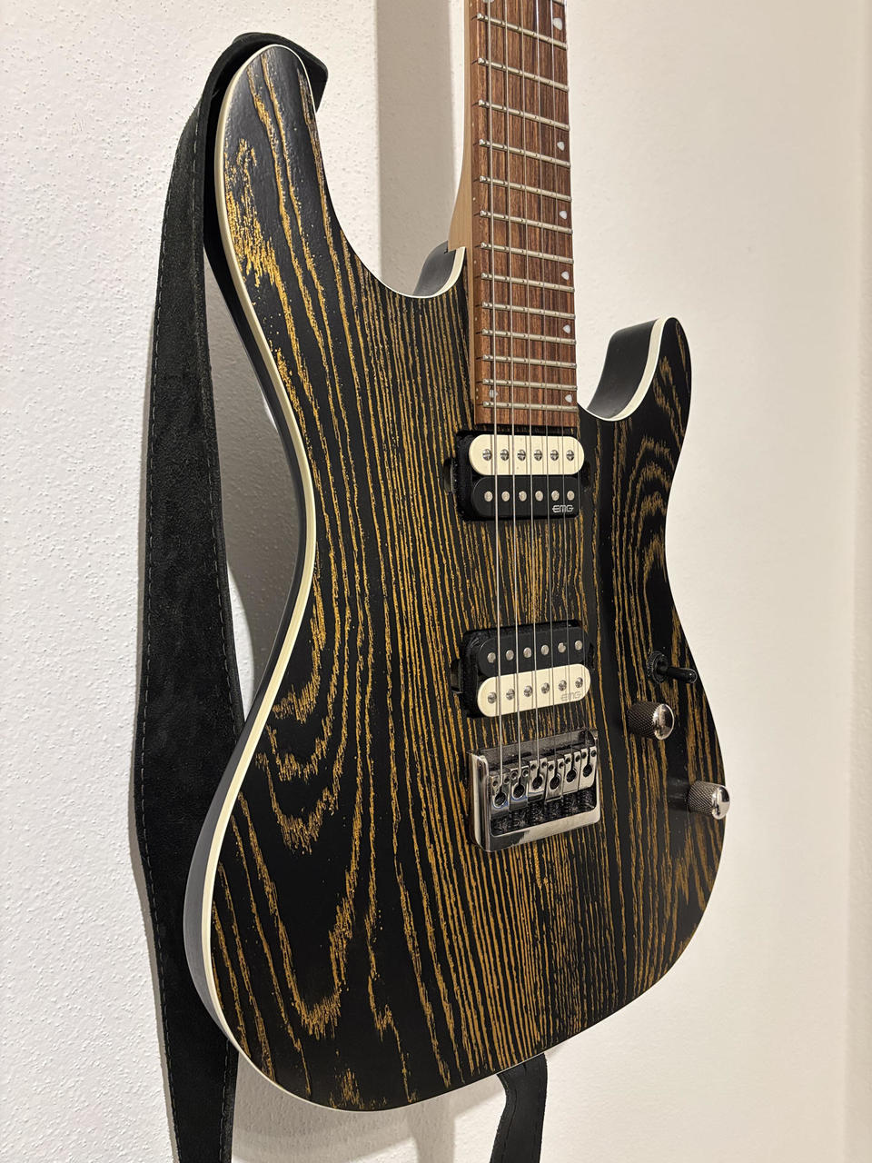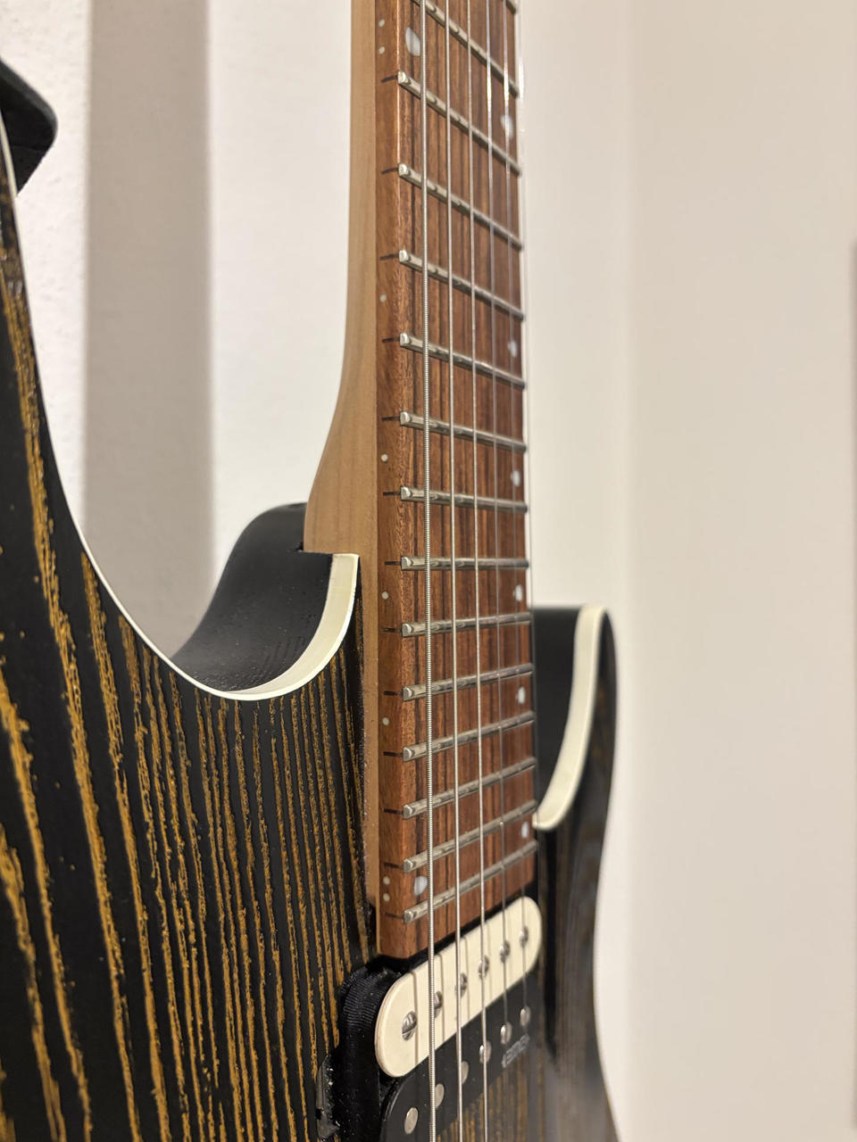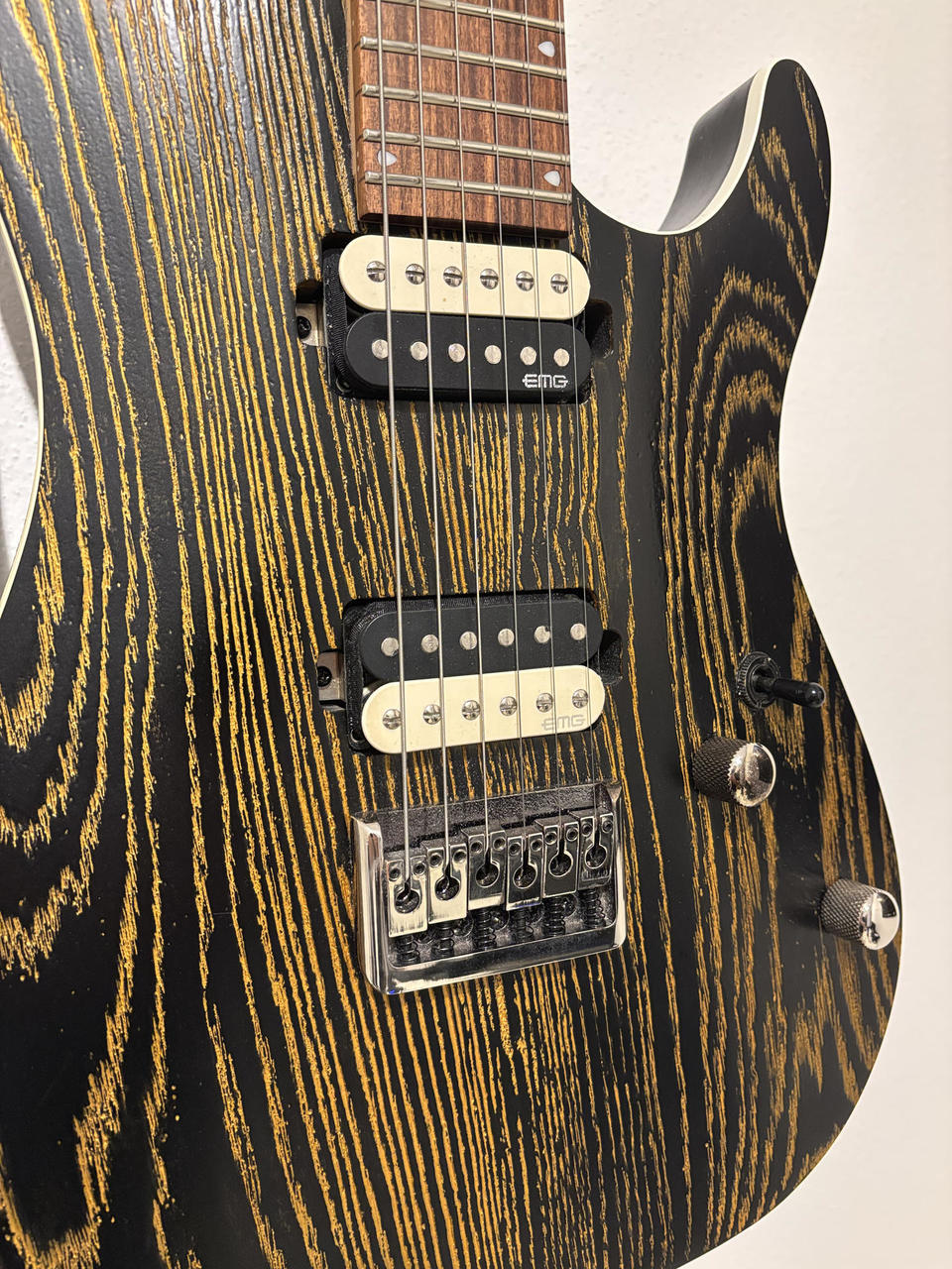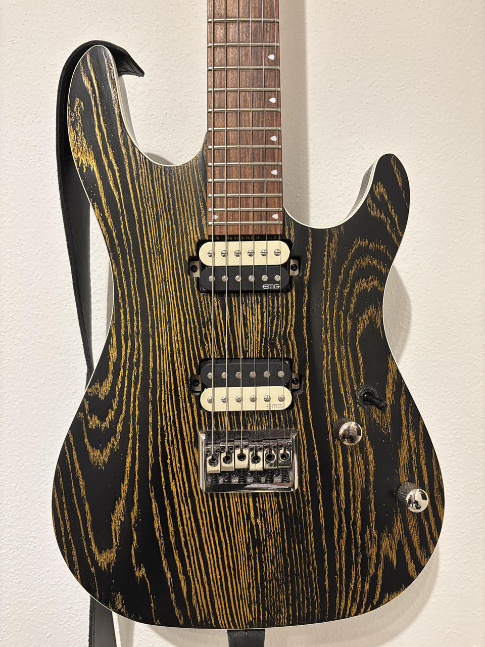 Vhodná na tvrdší žánry, skvělý zvuk s perfektní artikulací a kompresí v nízkém pásmu. Kytara je ve skvělém technickém i vizuelním stavu. Nově přeleštěné pražce. Tělo: Mahagon Top: 15mm bahenního jasan Hmatník: Pau Ferro Krk: Kanadský javor Snímače: aktivní EMG® RetroActive Super 77 Menzura: 648mm