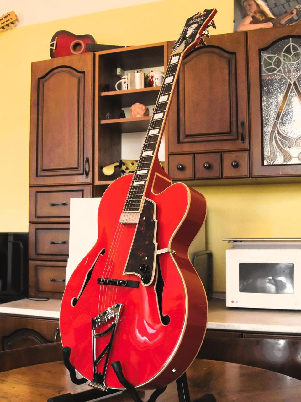 Jedná se o hollow body provedení, které vyniká především v jazzu, blues i při čisté hře. Kytara nabízí teplý, kulatý tón s výbornou dynamickou odezvou a velmi příjemný herní komfort. Stav nástroje je velmi dobrý – bez výrazných poškození. Krk je pohodlný, dohmat příjemný, kytara je seřízená a připravená k okamžitému hraní. Specifikace: Barva: Fiesta Red Konstrukce: full hollow body Snímač: humbucker Duncan design Ladicí mechaniky: Robomatic stairstep Přední deska: smrk Luby: javor Krk: javor Hmatník: ovangkol Značka D’Angelico patří mezi ikonické americké výrobce kytar s tradicí sahající do 30. let 20. století. Proslavila se především svými luxusními archtop modely, které si oblíbili jazzoví kytaristé po celém světě. Série Premier přináší typický design a zvuk této značky v dostupnějším provedení.