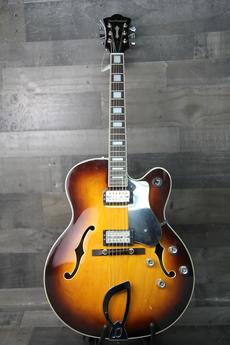 DeArmond Hollow Body Guitar X155 )This hollow body guitar has two well-regarded USA DeArmond Gold Tone humbucker pickups installed by Fender in California. These guitars were produced for Fender in Korea for only a few years, with the electronics and finishing completed at Fender in California. The craftsmanship and construction design is excellent.. It has a bound maple top, a bound maple back and maple sides, and two bound f-holes. The 22-fret bound rosewood fingerboard has block inlays. The black head stock has a Guild logo and truss rod cover. It has a De armond harp tailpiece with a “D” cutout. The twin Gold Tone hum bucker pickups are controlled with two volume knobs, two tone knobs and a three-way switch. Gold/chrome hardware.