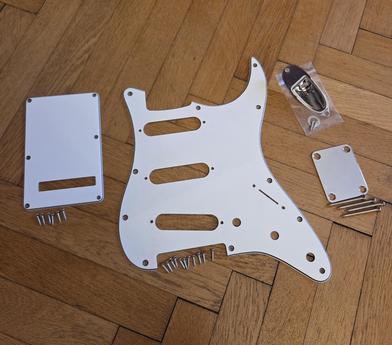 – pickguard 3-ply - 100 Kč – Fender 3-ply backplate (zadní kryt pružin) - 150 Kč – Fender kryt na jack - 100 Kč – Fender vintage neck plate (deska pro uchycení krku) - 200 Kč Komplet - 450 Kč