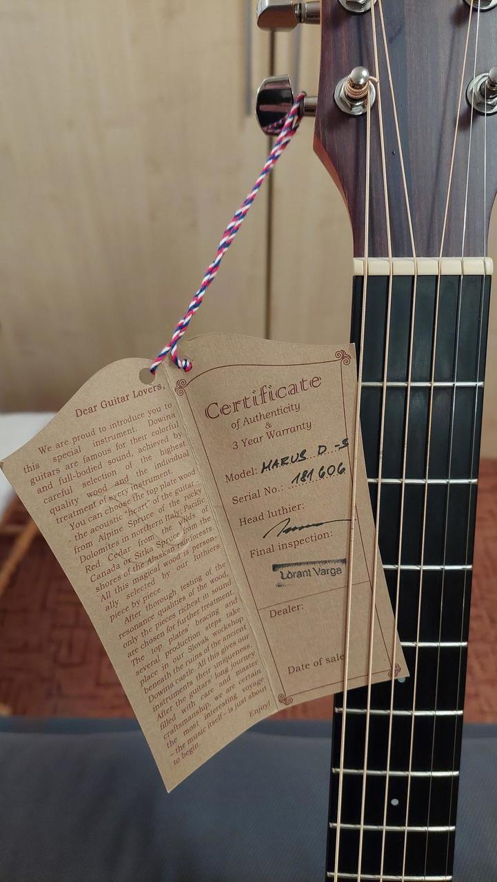 Prodám kytaru Dowina Marus D-S. Tvar těla dreadnought, vrchní deska masivní smrk, zadní deska a luby zebrano, krk mahagon, hmatník palisandr, nultý pražec kost. Sloužila jako náhradní, absolutně bez poškození!, včetně originál certifikátu a krabice. Nějaké opotřebení pražců je / na druhou stranu je krásně vyhraná. Vybíraná z několika kusů. Ideální je osobní prohlídka - zkouška - převzetí. Děkuji za případný zájem.