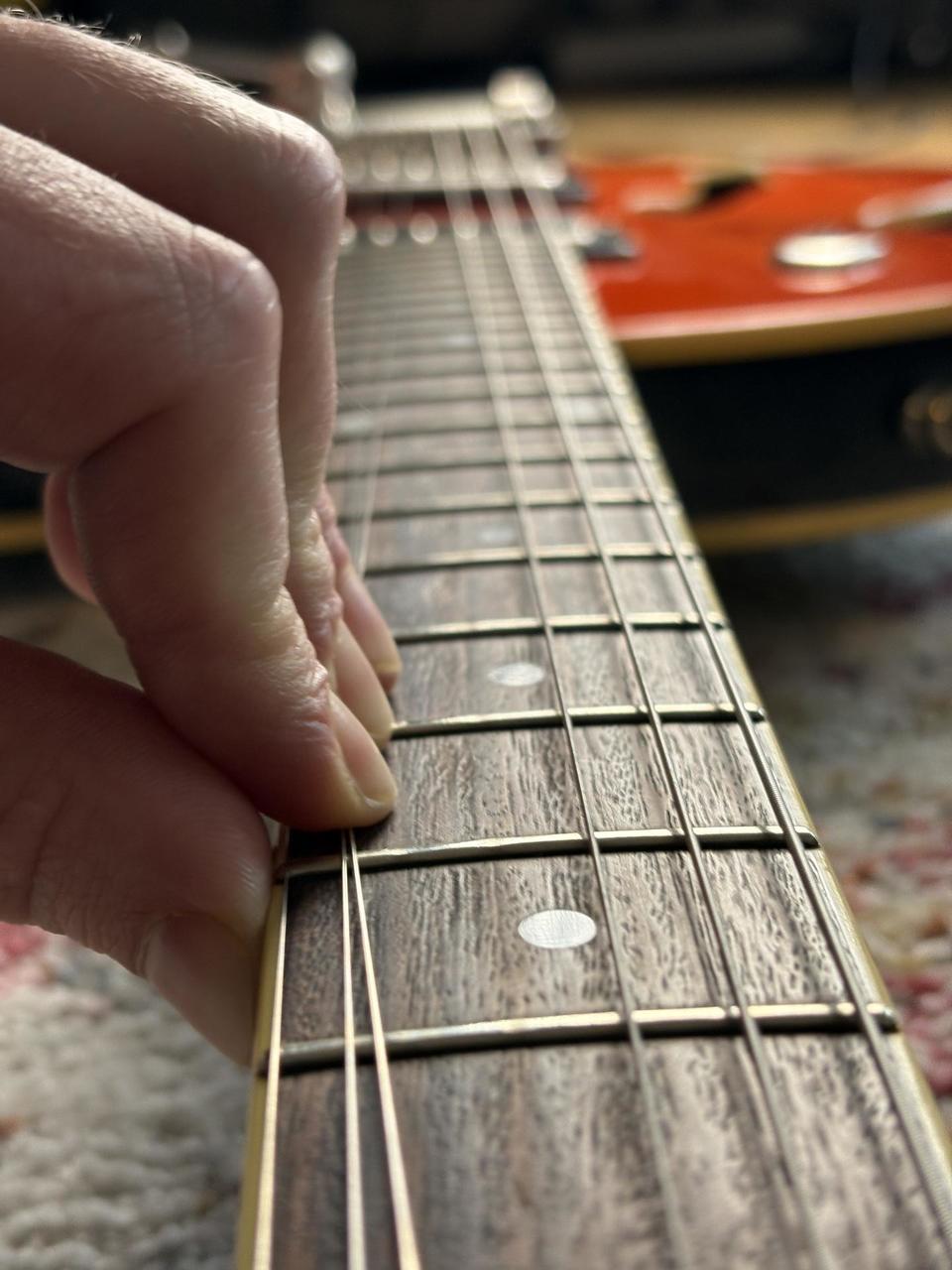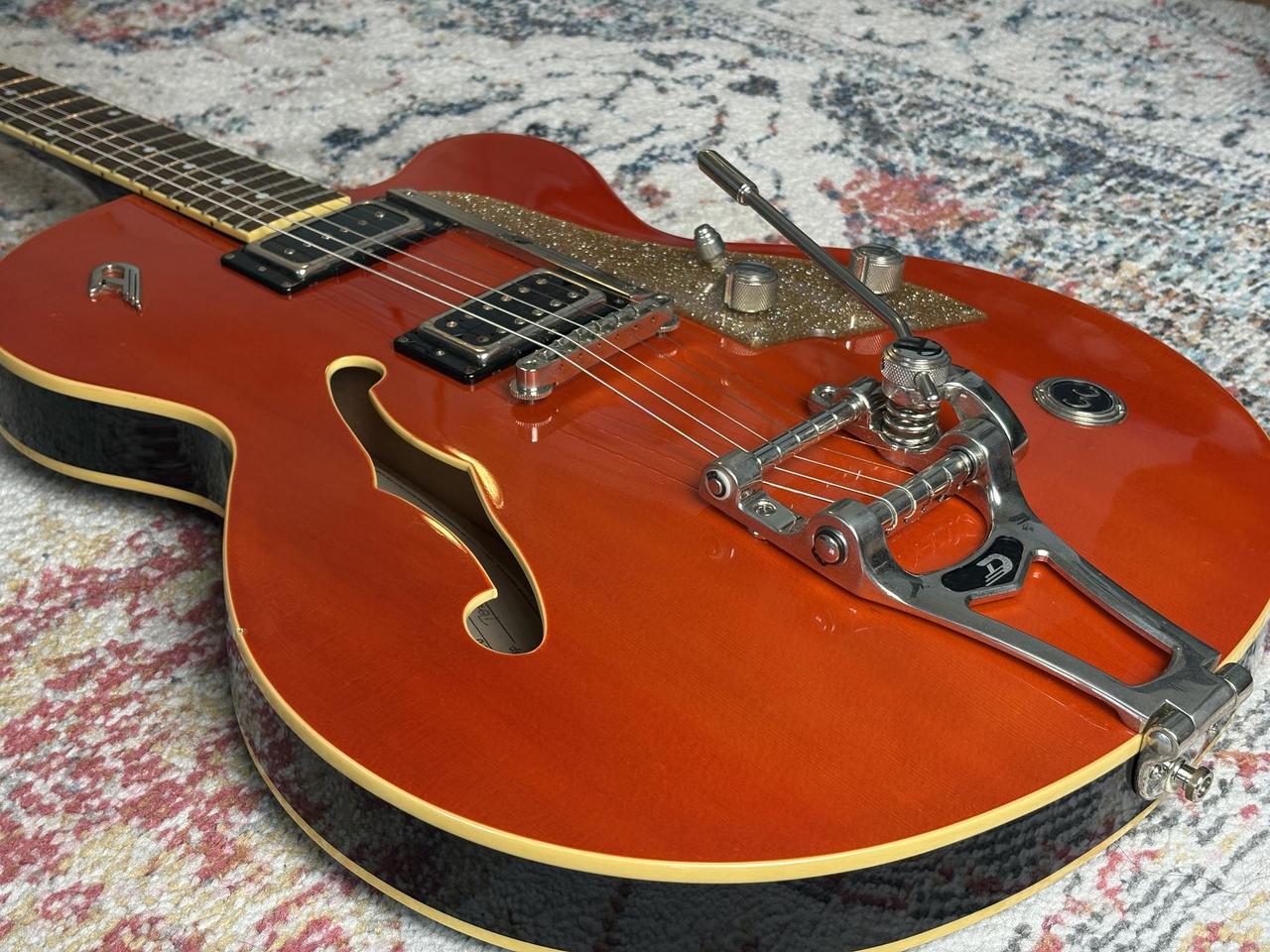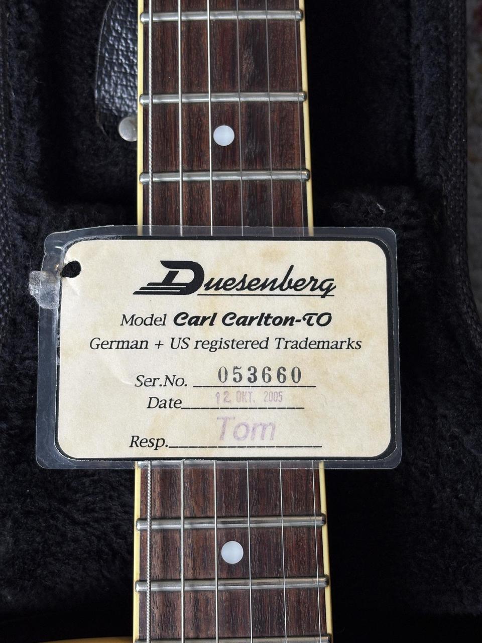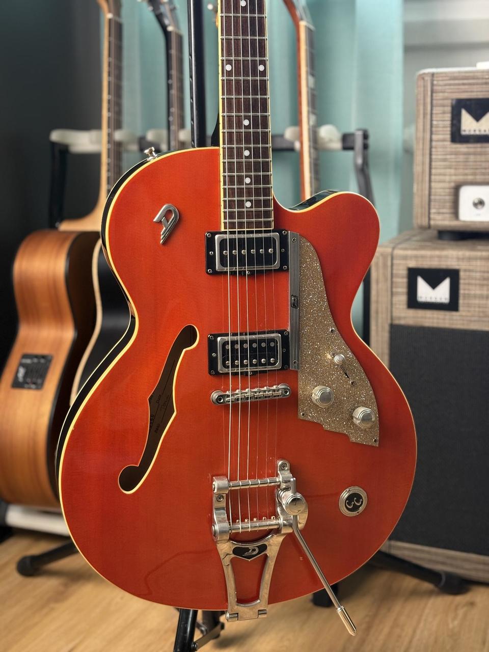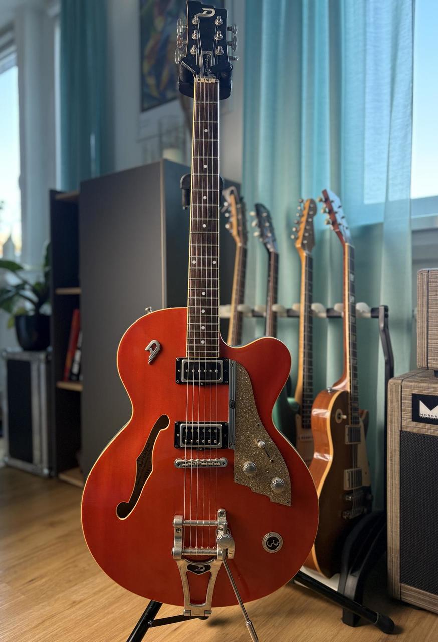 Javorový krk s palisandrovým hmatníkem je pohodlný a velmi dobře se na něj hraje. Kytara má jeden z nejdelších sustainů, co jsem měl možnost vyzkoušet. U krku je široký single-coil DP-90 (zvukově blízký Gibsonu P-90) a u kobyly Grand Vintage Humbucker (s klasickým vintage PAF zvukem). Fantastické tremolo (Duesenberg Super Tremola), podobně zkonstruované jako Bigsby, krásně chodí oběma směry a nerozhazuje ladění. Ke kytaře je originální pevný kufr. Možnost vyzkoušet na Praze 6.