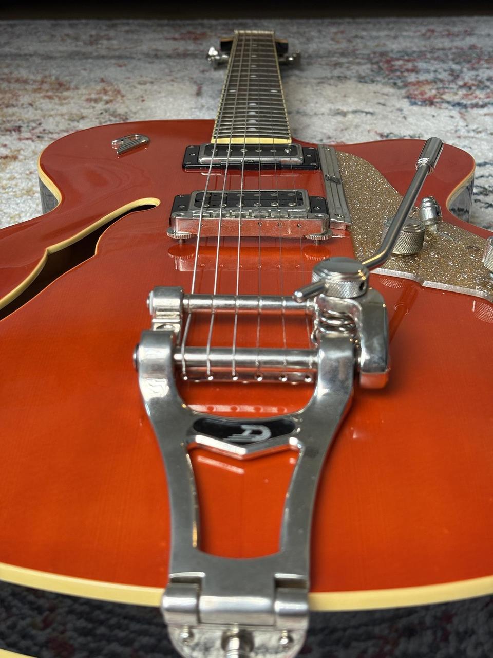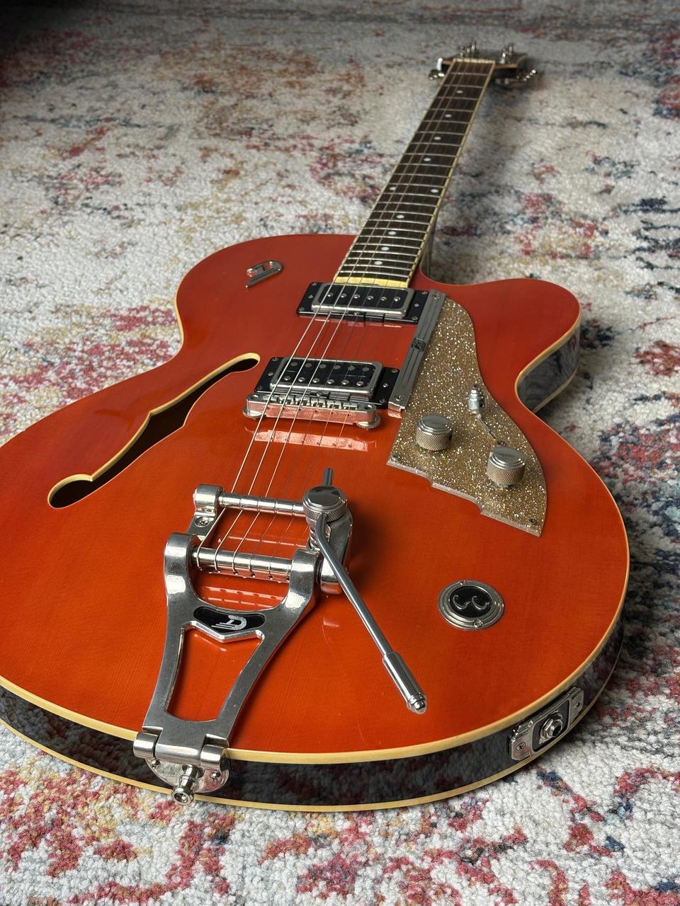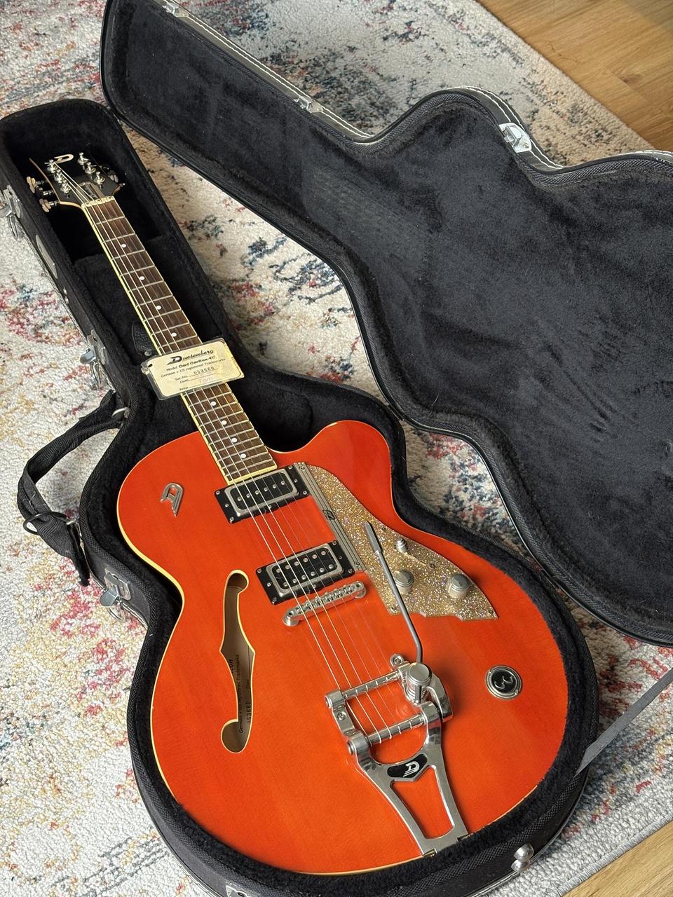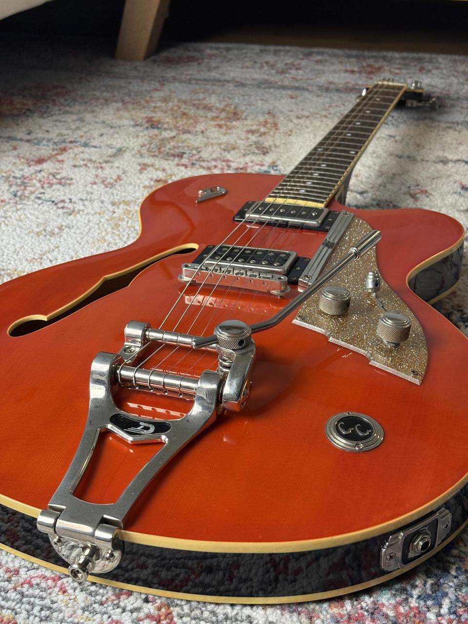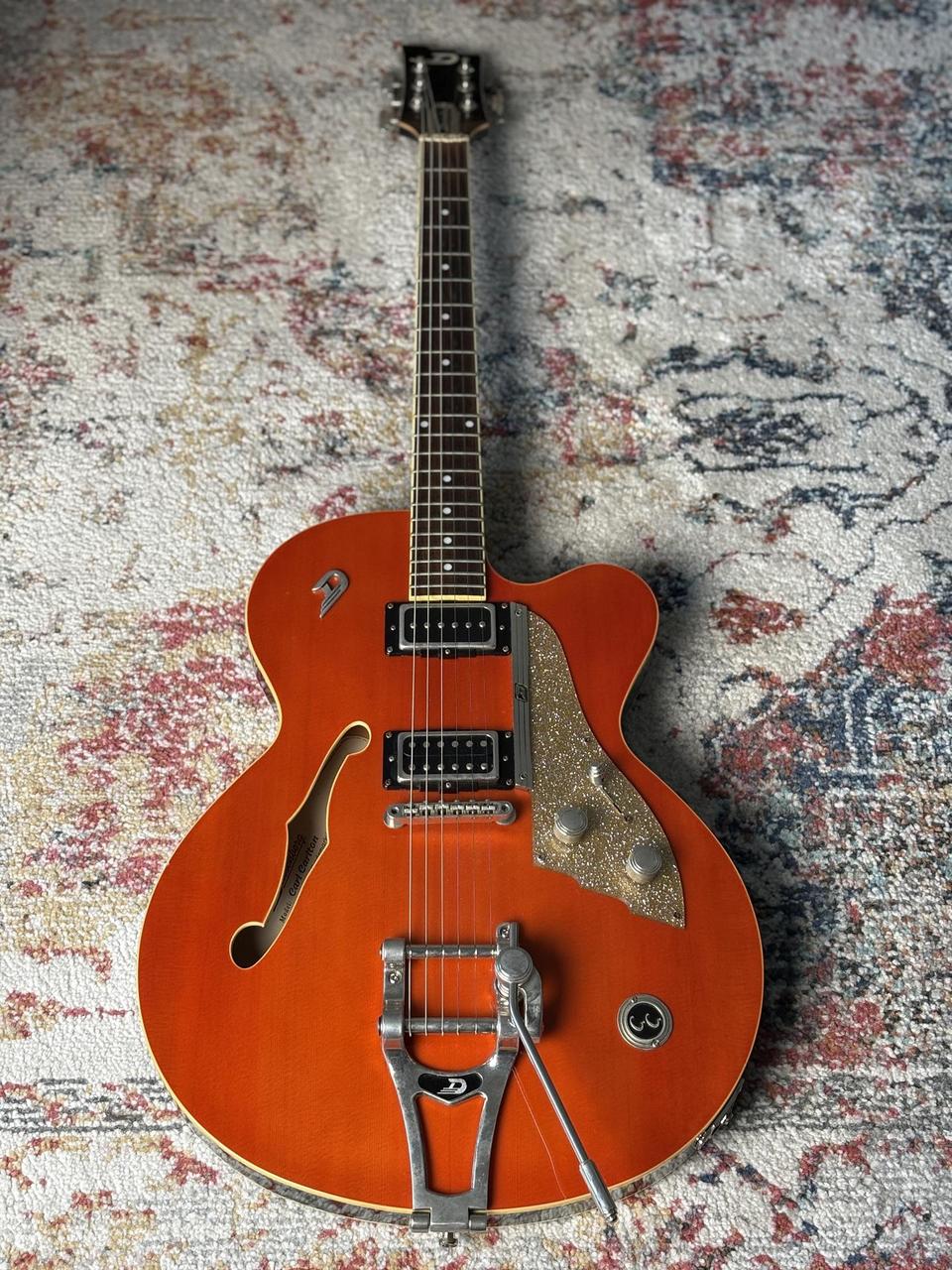 Prodám pololubovku Duesenberg CC Carl Carlton Signature – naprosto luxusní nástroj, který kombinuje vintage eleganci s moderní všestranností. Tento full-size model s dutým javorovým tělem a smrkovou vrchní deskou dává instrumentu bohatý, plný tón s krásným sustainem a skvělou dynamikou.