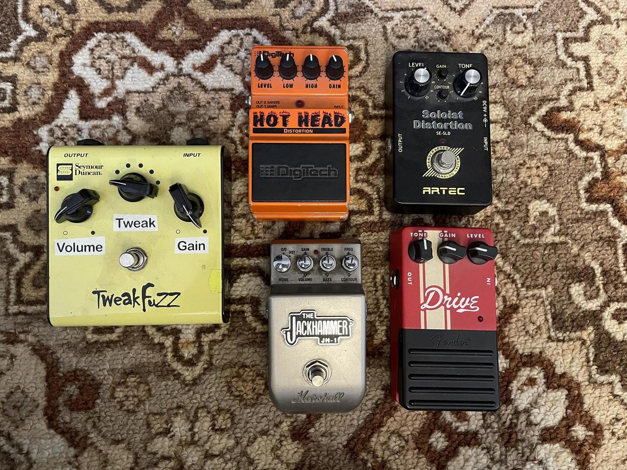 nabízím k prodeji krabičky, které nepoužívám a jen se mi doma povalují. Jedná se o: Digitech Hot Head Distortion -> efekt ze slavné série firmy Digitech, ve stejné sérii se objevuje i legendární overdrive Bad Monkey - 1200,- Artec Soloist Distortion - 1000,- Seymour Duncan Tweak Fuzz -> taky legendární krabička z vůbec první pedálová série Seymour Duncan, bohužel tento kus není ve 100% formě, je sice funkční, ale chtělo by to šikovného technika, který by se na něho podíval a dal ho do kupy - 1000,- Marshall The Jackhammer - 1200,- Fender Drive - 1000,- Stav všech efektů odpovídá stáří. Prosím zájemce, preferuji osobní předání, případně zaslání Českou poštou na dobírku (se Zásilkovnou mám špatné zkušenosti, hlavně v období Vánoc) Díky za nabídky