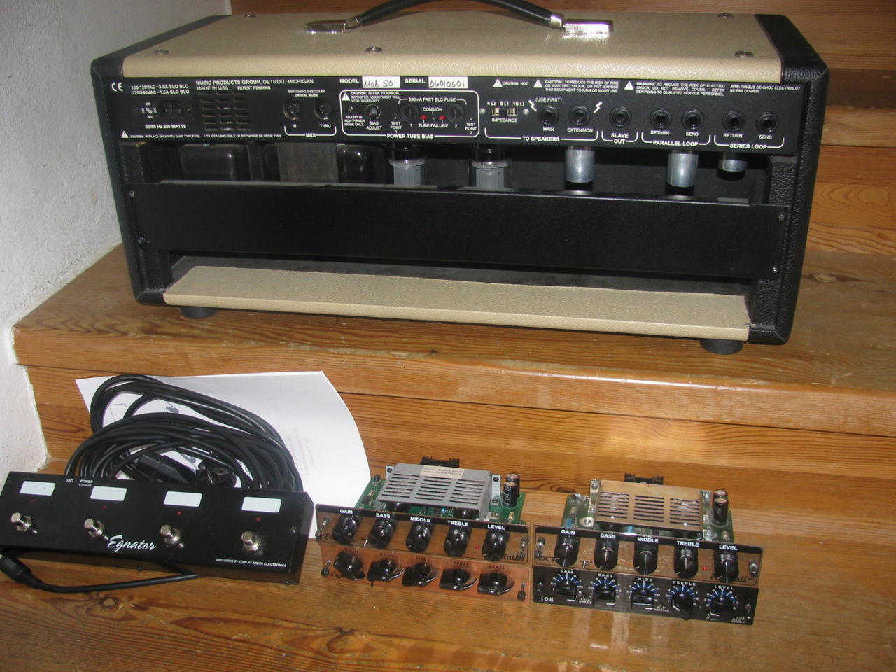 Velmi vzácný Egnater MOD 50 made in USA . špičkový stav Podporuje veškeré MTS randal Sxnergy .Salvation audio a další . . Komplet hlava + 4x MTS . 1086 . SUPER V . Blackface .XTC . Original footswitch a obal na přepravu . Cena za komplet . Veškerá data jsou na netu .Pokud máte zájem prosím posílejte nabídky .