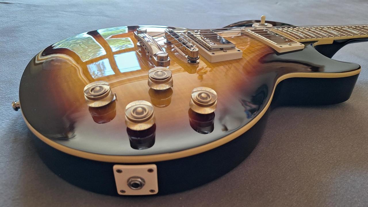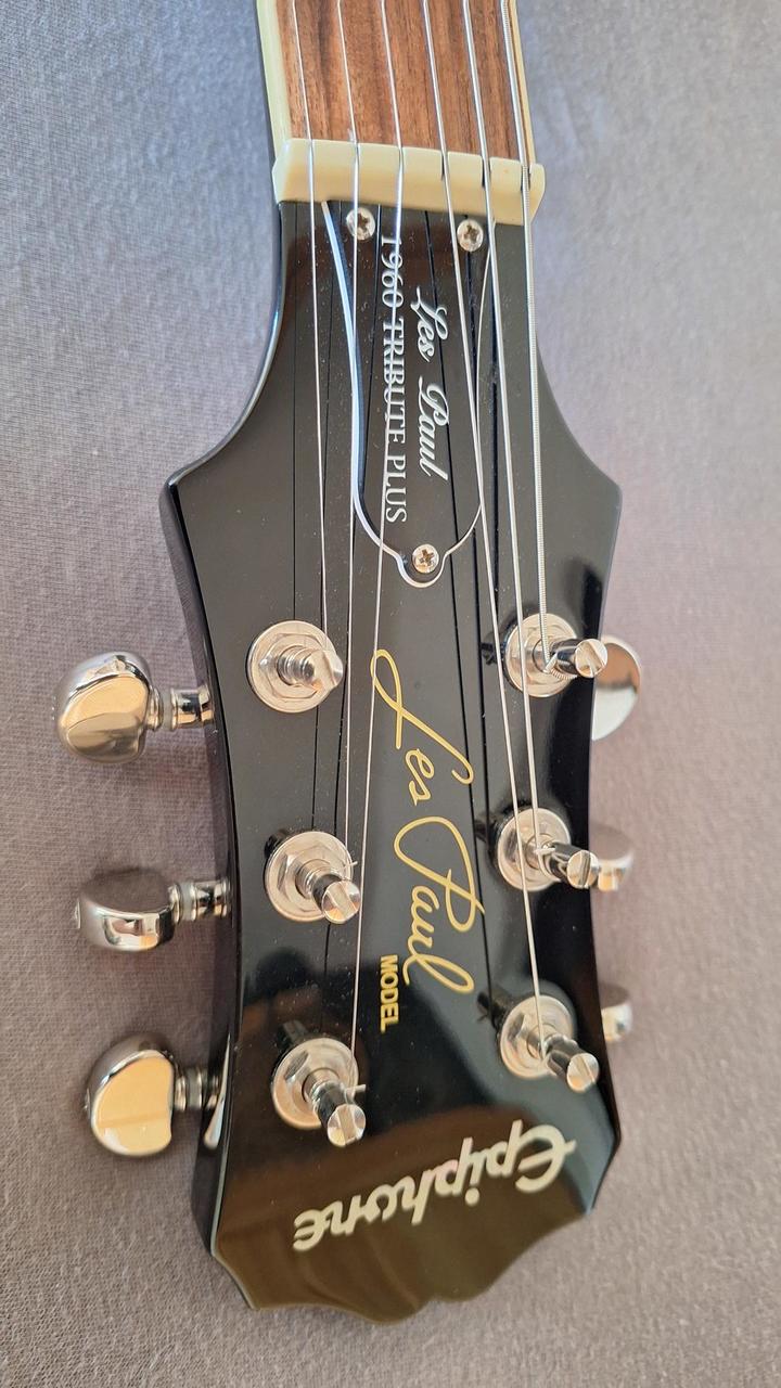 prodám svůj Epiphone Les Paul Tribute Plus Vintage Sunburst, který jsem si kupoval na začátku roku 2019 nový jako svoji první elektriku. Bohužel na něj ale není čas a musí pryč. Je ze série Tribute 1960s, s masivním mahagonovým tělem a vrchní deskou z javoru, lepený mahagonový krk s palisandrovým hmatníkem a 22 pražci, menzura 628mm. Má 2x snímače humbucker Gibson '57 Classic + '57 Classic Plus, ovládání 2x Volume a 2x Tone se systémem push / pull, 3-polohový přepínač, kobylka LockTone Tune-O-Matic, niklovaný hardware a zamykatelné Grover Die-cast 14:1 ladící mechaniky. Stav je výborný, vlastně nikdy neopustil dům.