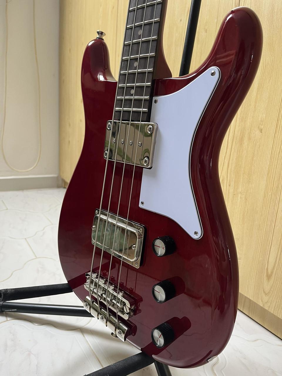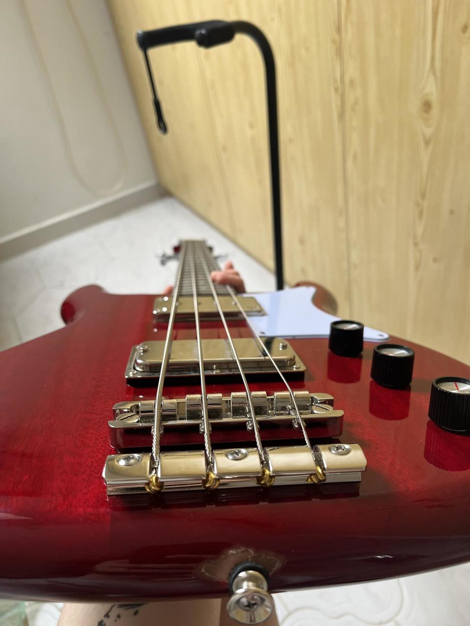 Jedná se o shortscale basu s dvěma snímači - mini humbuckerem u kobylky a u krku je snímač bass sidewinder. Zvukově mi připomíná něco mezi Hofner basou a Rickenbackerem. Tělo je z mahagonu, hmatník z vavřínu. U baskytary jsem měnil ladící mechaniky za mechaniky značky Gotoh (https://www.thomann.de/cz/gotoh_gb707_2l_2r_c_bass_tuners.htm). Nemá téměř žádné známky používání, používaná pouze k domácímu hraní. Má malinko uštípnutý lak u knoflíku na popruh (na fotce). S tím mi ale už kytara přišla z thomannu. Preferuji osobní předání Slaný - Kladno - Praha. V případě zájmu mi napište prosím SMS.