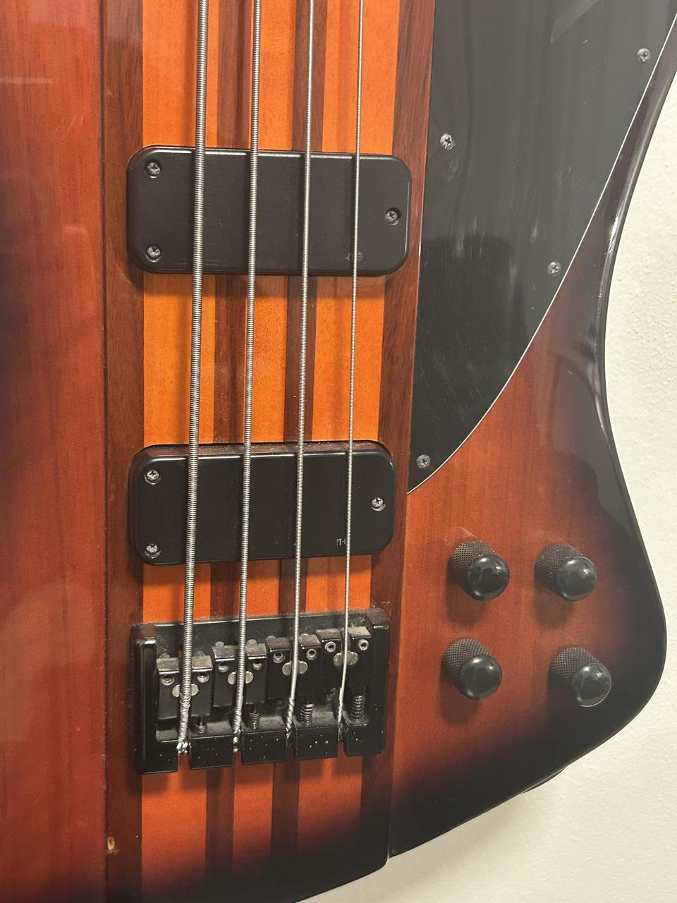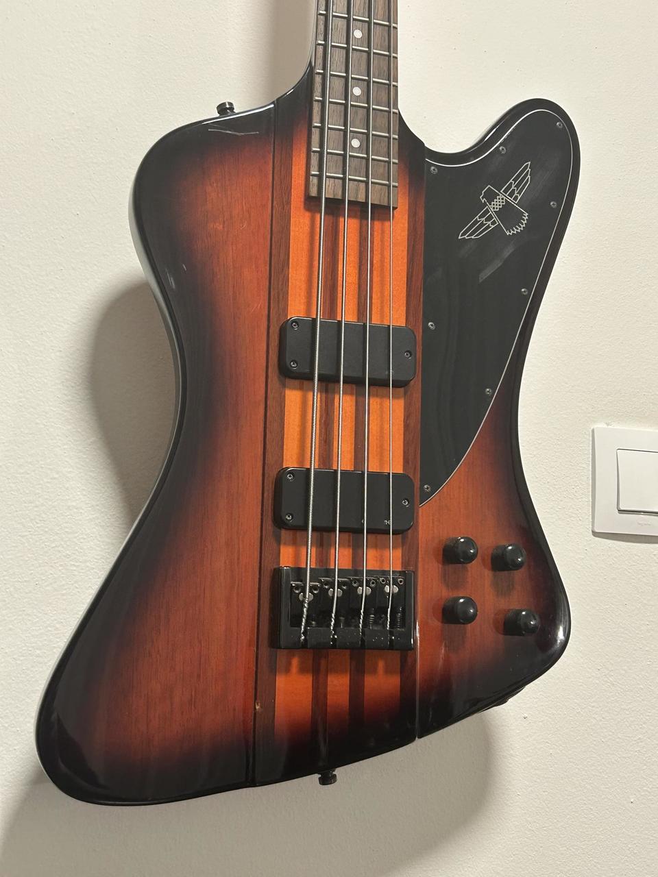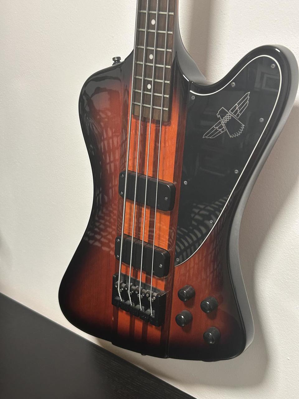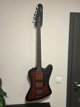 Popis dle AI vytažený z internetu: Baskytara Epiphone Thunderbird Pro-IV (nebo pětistrunná verze Pro-V) je moderní, aktivní varianta klasického designu Thunderbird, která se vyznačuje konstrukcí průchozího krku (neck-through) pro maximální sustain. Na rozdíl od standardních pasivních modelů je vybavena aktivní elektronikou a snímači T-PRO humbucker. Technické specifikace: Podle údajů z webů Guitar Center a Equipboard nabízí model Pro-IV následující parametry: Konstrukce: Sedmidílný průchozí krk z kombinace ořechu a javoru s mahagonovými křídly těla. Snímače: Dva aktivní humbuckery Epiphone T-PRO. Elektronika: Aktivní EQ s ovládacími prvky pro celkovou hlasitost (Master Volume), poměr snímačů (Blend), High-EQ a Low-EQ. Hmatník: Palisandr (Rosewood) s rádiusem 12" a 20 pražci medium/jumbo. Menzura: Standardních 34" (863,6 mm) s šířkou nultého pražce 1,50". Hardware: Černý, s plně nastavitelnou kobylkou typu flush-mount. Uživatelské recenze a zkušenosti: Odborníci a uživatelé na fórech jako TalkBass a Reddit často vyzdvihují tyto vlastnosti: Zvuk: Nabízí širokou škálu tónů od hlubokých, vrčivých basů až po průrazné výšky, což ji činí vhodnou pro rockové a metalové žánry. Hratelnost: Profil krku SlimTaper je hodnocen jako velmi rychlý a pohodlný, i když je nástroj celkově masivní. Ergonomie: Častým tématem je tzv. „neck dive“ (přepadávání na hlavu), který je pro tvar Thunderbird typický, ačkoliv někteří uživatelé uvádějí, že u modelu Pro je díky vyvážení méně výrazný než u pasivních verzí. Kvalita zpracování: Recenzenti na Beginner Guitar HQ považují tuto řadu za jednu z nejlepších hodnot od Epiphone, která se kvalitou blíží i dražším modelům Gibson.