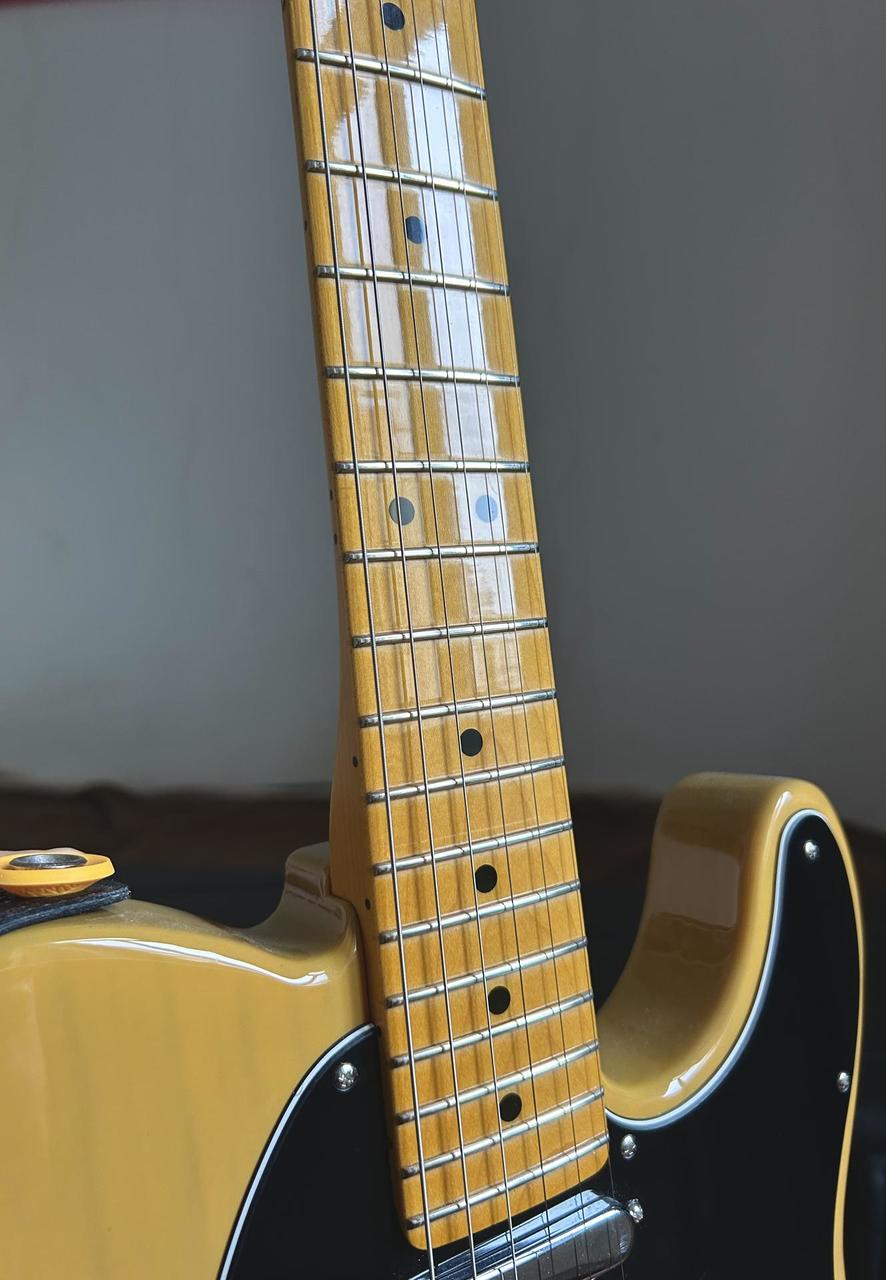 Barva Butterscotch Blonde, Profil krku Deep C, tělo americká borovice, krk javor. Kytara má také následující upgrady: - Ladicí mechaniky byly vyměněny na uzamykatelné (také Fender) pro pohodlnější výměnu strun a lepší ladění. - Sedla v kobylce teď jsou Gotoh In-Tune BS, které zajišťují přesnější intonaci než standardní. - Nainstalovan druhý retainer pro 3. a 4. strunu (rovněž od Fenderu). Tato kytara je výjimečná tím, že umožňuje zapnout oba snímače v paralelním režimu – tedy po stisknutí tlačítka push-push tónu, se dva singly spojí a vytvoří zvuk jednoho humbuckeru. Také je Treble Bleed obvod, který zaručuje konstantní kvalitu tónu bez zvýrazňování basů při redukci hlasitosti ovladačem hlasitosti. Kytara má také ergonomičtější patku krku, což umožňuje pohodlné hraní i ve vyšších polohách. Podle mého názoru jde o nejlepší model mezi telecastery – nabízí neomezené možnosti zvukové variability. Kytara je seřízena s nízkým dohmatem a je plně připravena k hraní. Momentálně jsou nataženy struny 9.5 v E standard. Kytara byla zakoupena v roce 2024 a stále je v záruce. Součástí prodeje je kufr i veškerá dokumentace. Důvod prodeje - kytaru nepoužívám aktivně a pro mou tvorbu není nezbytná, takže bych byl rád, kdyby posloužila jinému hudebníkovi. Kytaru neposílám, pouze osobní odběr v Brně.