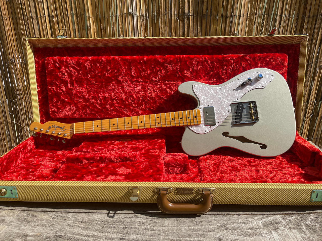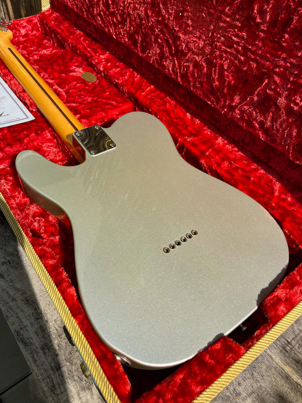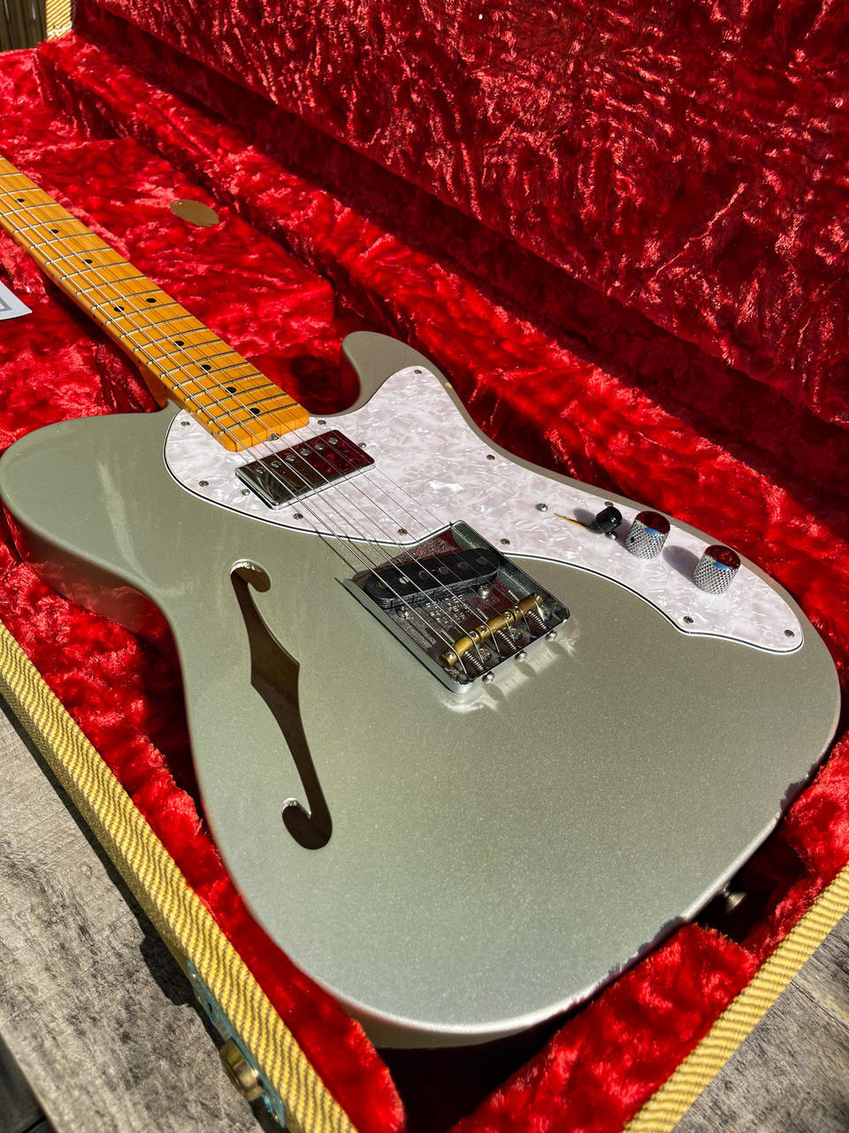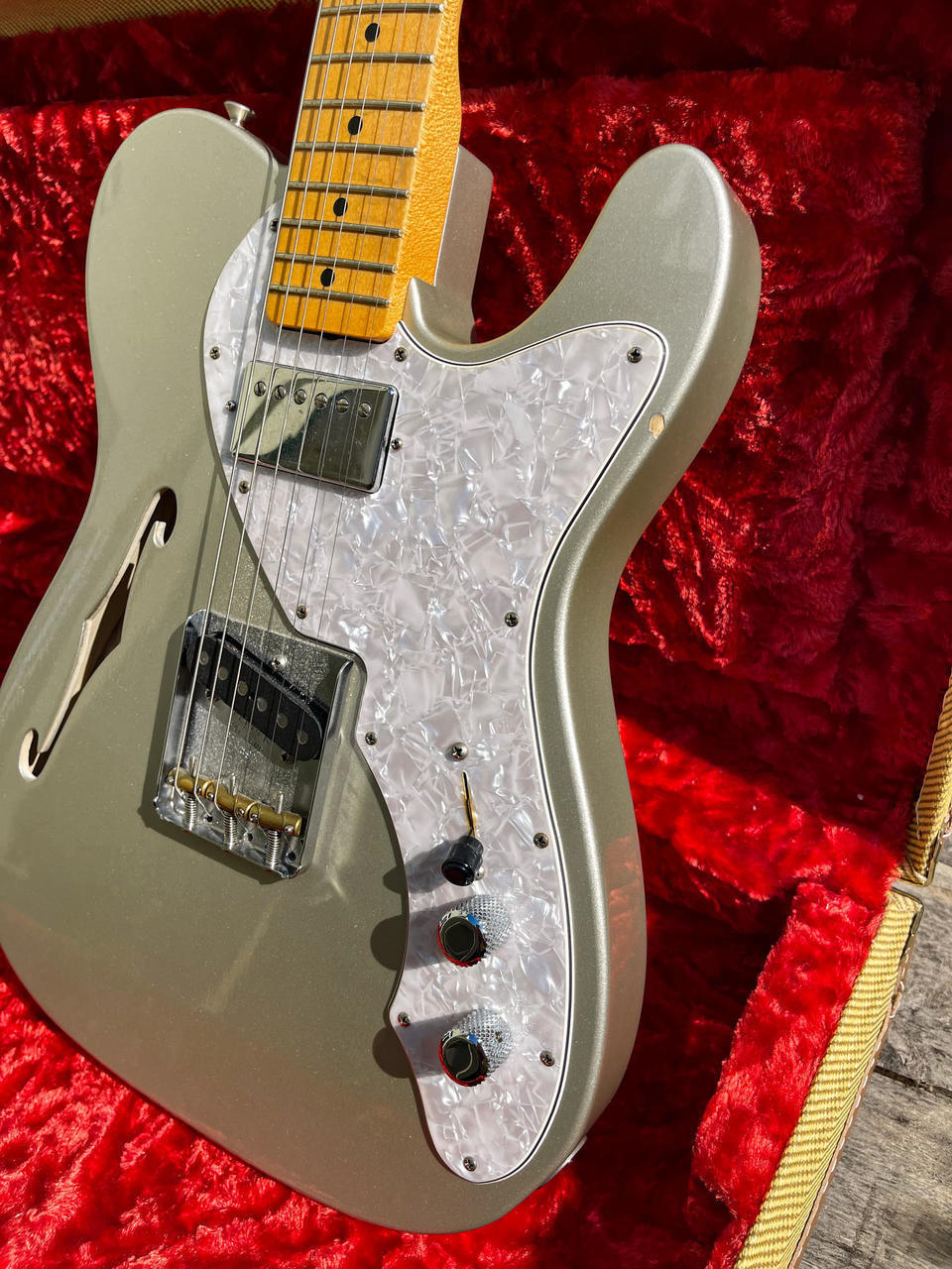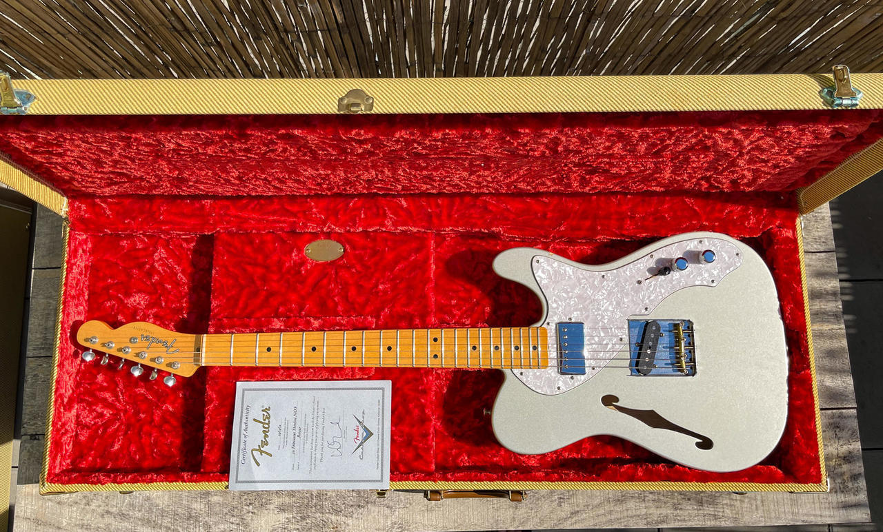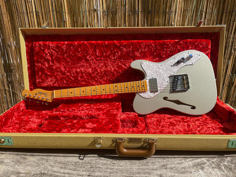 Prodám Fender Custom Shop ’50 Tele Thinline H/B NOS – výborný semi-hollow telecaster se skvělou hratelností. Kytara je ve vzácné a elegantní barvě Inca Silver a ve velmi dobrém stavu. Tělo z jasanu s F otvorem dává kytaře příjemnou lehkost a krásně otevřený zvuk. Hmotnost jen 3,2 kg. Javorový krk s profilem D, hraje se na něj velmi pohodlně. Kytara má skvělý sustain.