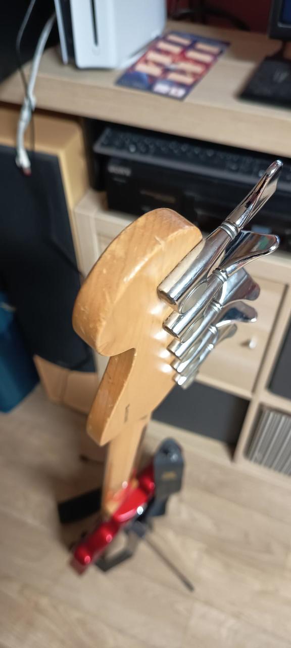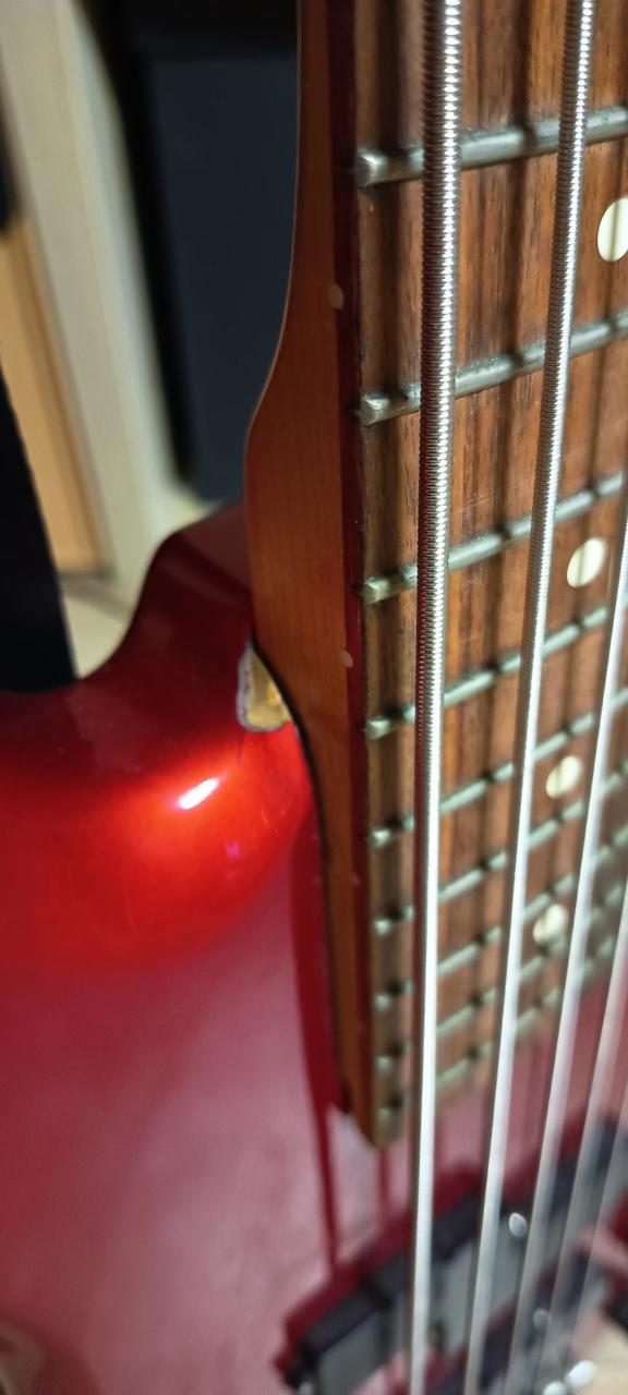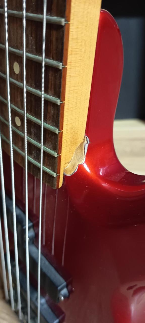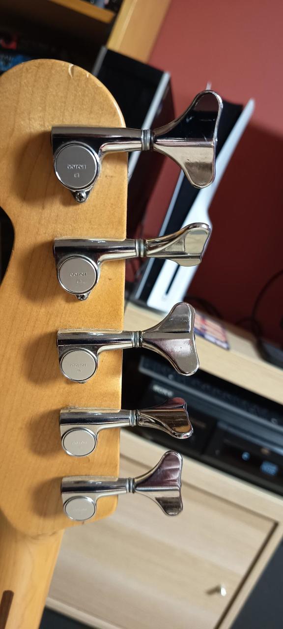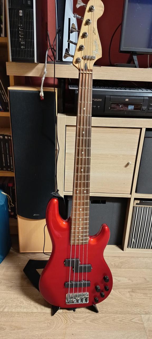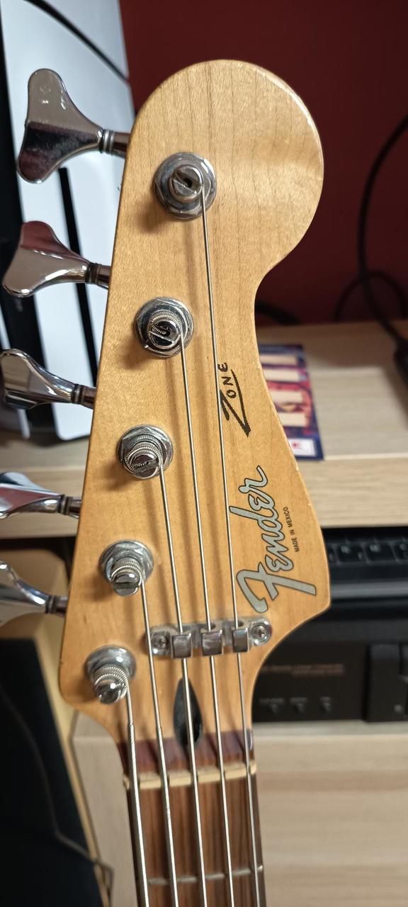 Jedná se o docela raritní model, vyráběl se v Mexiku v letech 2001 - 2006. Při rychlém jednání sleva možná! nultý pražec - 48 mm rozteč strun u kobylky - 18 mm hmotnost - 4,3 kg Odehrála toho se mnou mraky, byla to moje hlavní basa přes 15 let. Za tu dobu samozřejmě nasbírala nějaké ty šrámy. Pokusil jsem se vše vyfotit. Odloupnutý lak kolem krku je výsledkem pádu na zem, kdy povoli pás a kromě laku to odnesl i můj palec na noze. Ťukance na krku jsou výsledkem klasického koncertního poskakování a s ním spojených nechtěných úderů do mikrofonních stojanů, činelů atd. Obecně vzato, s přihlédnutím k tomu, co vše má za sebou, si myslím, že je v docela dobré kondici. Prodávám ji z důvodu nevyužití. Pouze osobní předání v Kopřivnici nebo blízkém okolí. Specifikace v angličtině: Body: Alder Neck: Maple Fingerboard: Rosewood Construction: Bolt On Frets: 22 Pickups: USA P +J Electronics: Active Controls: Volume, Balance, 3 Band EQ Scale (inches): 34" "Bass with a classic Fender J style 5 string neck with 5 in line machine heads, slightly downsized body, P/J pickups and active electronics. you can dial in a fat P sound thanks to the Alnico P type pickup, and go for an authentic Jazz Bass growl switching to the bridge Noiseless J Bass style pickup. The oinboard 3 band EQ can make subtle changes to the sound if you so wich, but you can also get an extreme sound if that's what you're looking for." V přiloženém videu lze slyše 4str. verzi.