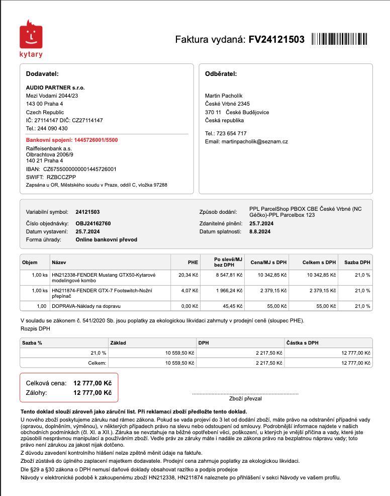 Dá se na něj cvičit klidně v bytě, hraje parádně i potichu. Bez problému zvládne i kapelu s bicími (nikdy jsem při koncertech nešel nad 50% volume). Na kombu jsou pouze malé oděrky ze spodní strany viz foto. V kombu je praktický držák na FS pomocí suchého zipu. Cena nového kompletu byla 13.133,-KČ (10.343,- kombo, 2.379,- FS, 411,- látkový obal). Kupováno v červenci 2024, je tedy ještě v záruce. Pouze osobní vyzvednutí s možností vyzkoušení v Českých Budějovicích. Cena pevná. Parametry komba: https://kytary.cz/fender-mustang-gtx50/HN212338/ Parametry FS: https://kytary.cz/fender-gtx-7-footswitch/HN211874/ Obal: https://kytary.cz/fender-cover-mustang-gtx50/HN219806/?source=Accessories