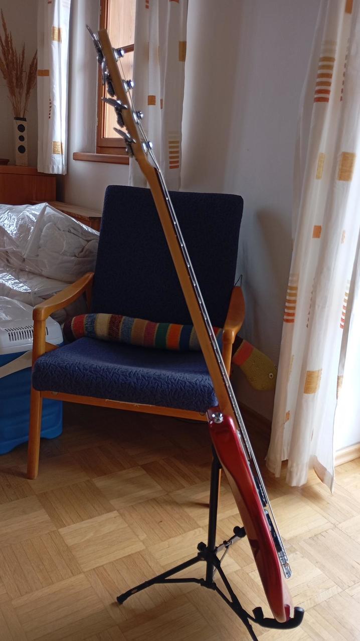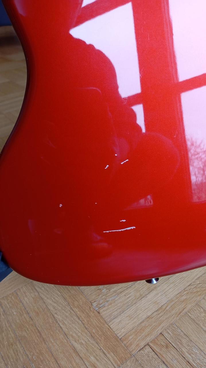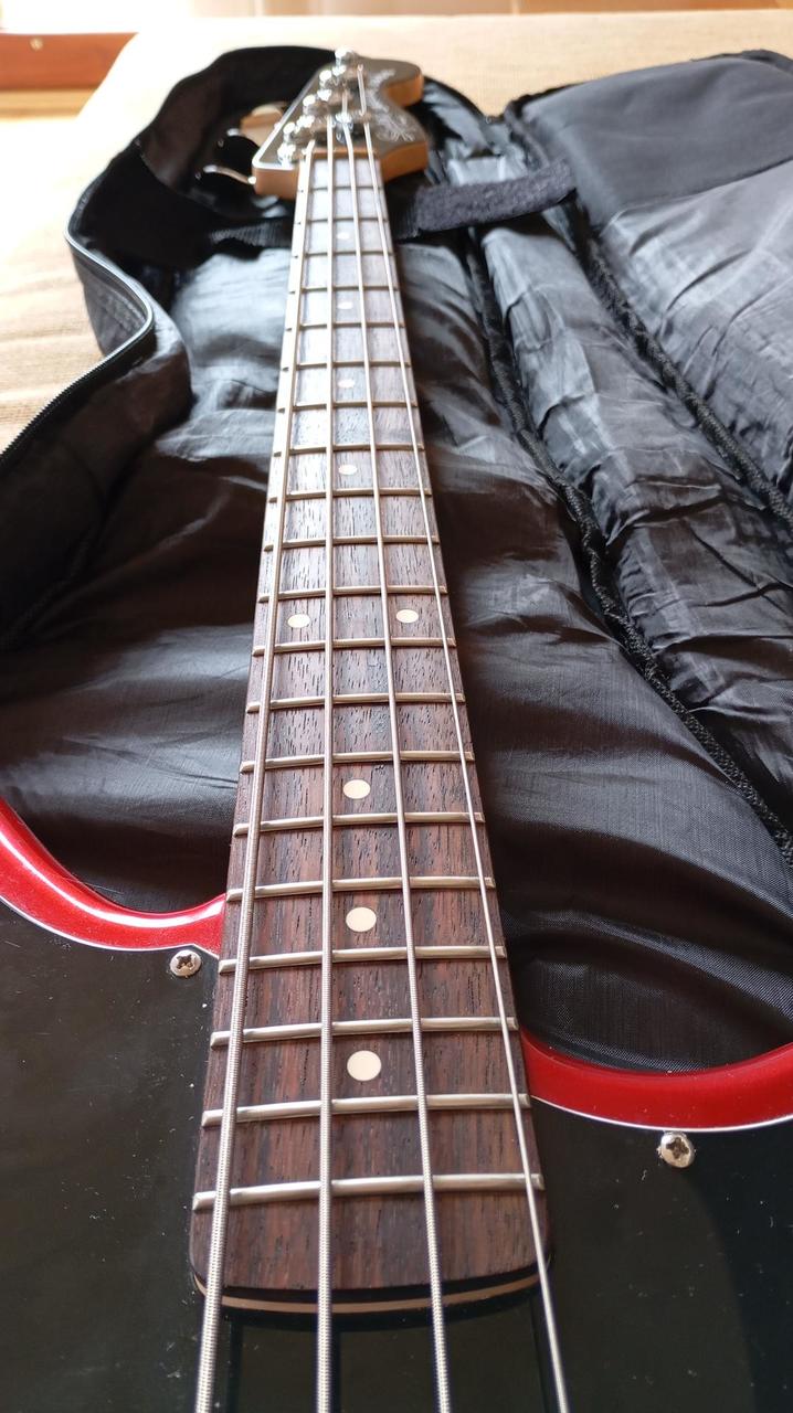 Prodám opečovanou baskytaru v červeném odstínu Candy Apple Red s krátkou menzurou kupovanou jako novou v roce 2018. Je po synovi, který na ni hrál jako student ZUŠ od osmi let, takže vhodná pro podobný účel, ale i pro menší ruce, drobnější postavy nebo kohokoli, kdo má rád pohodlné hraní. Basa je v perfektním technickém stavu, seřízená. Pár oděrek od běžného používání se najde, ale jen na zadní straně, plus jedno miniaturní ťuknutí zespodu (viz foto), zepředu je jako nová.