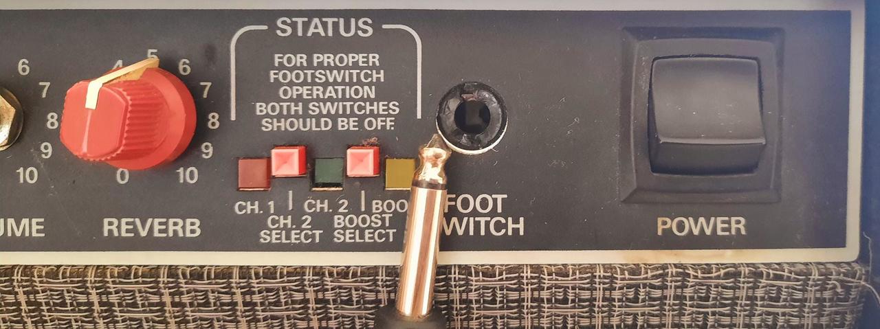 Všechny originální díly. -kanálové tranzistorove kytarové kombo 150 W, 1x12" reproduktor r.v. 1988 - 1992, USA "Hnízdo“/"samice" jack k footswitch na zesilovači má rozbitou plastovou část (viz foto), ale nemá žádný vliv na používání a lze jej snadno vyměnit za nový v hlavě zesilovače.