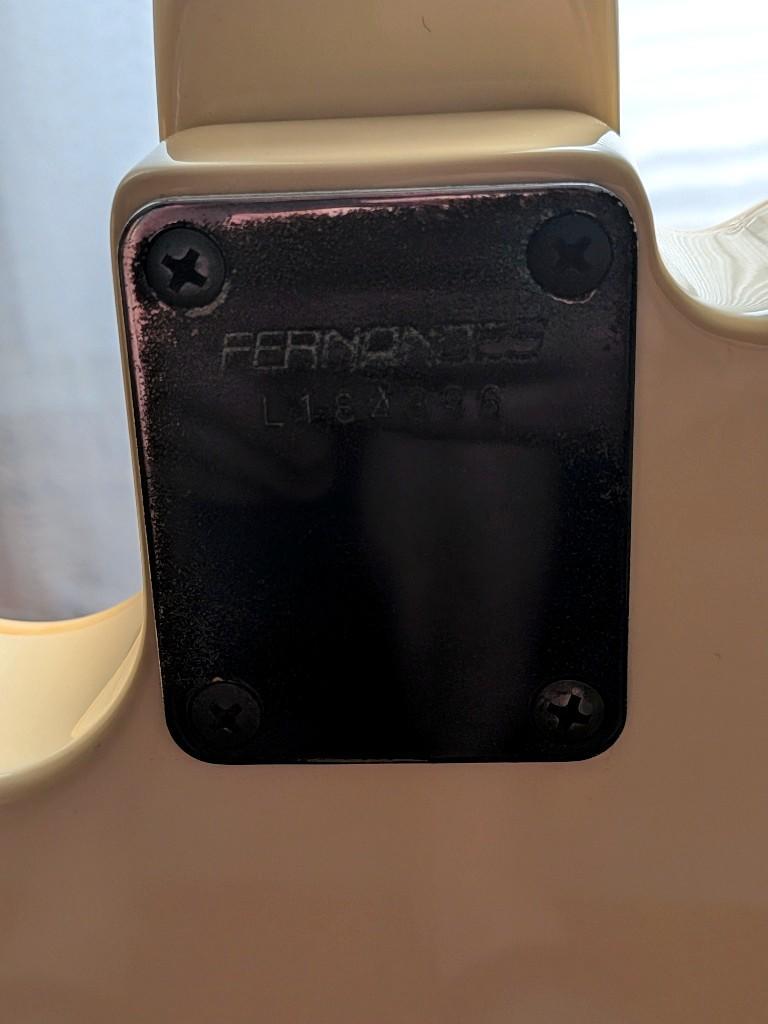Originální japonský Fernandes TEJ-80BT v bílé / vintage white barvě s horním bindingem. Vyšší model z řady TEJ z počátku 90. let, postavený nad běžnými verzemi TEJ-45/50. Olšové tělo, šroubovaný jednodílný javorový krk se slim U profilem, palisandrový hmatník, 22 pražců, string-through-body kobylka, černý hardware, ladicí mechaniky Gotoh a původní aktivní single-coil snímače F.G.I. Technology. Ovládání: 1x volume, 1x tone, 3polohový přepínač, aktivní elektronika na 9V baterii.