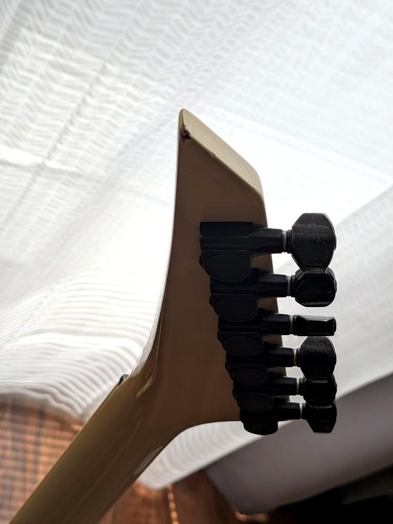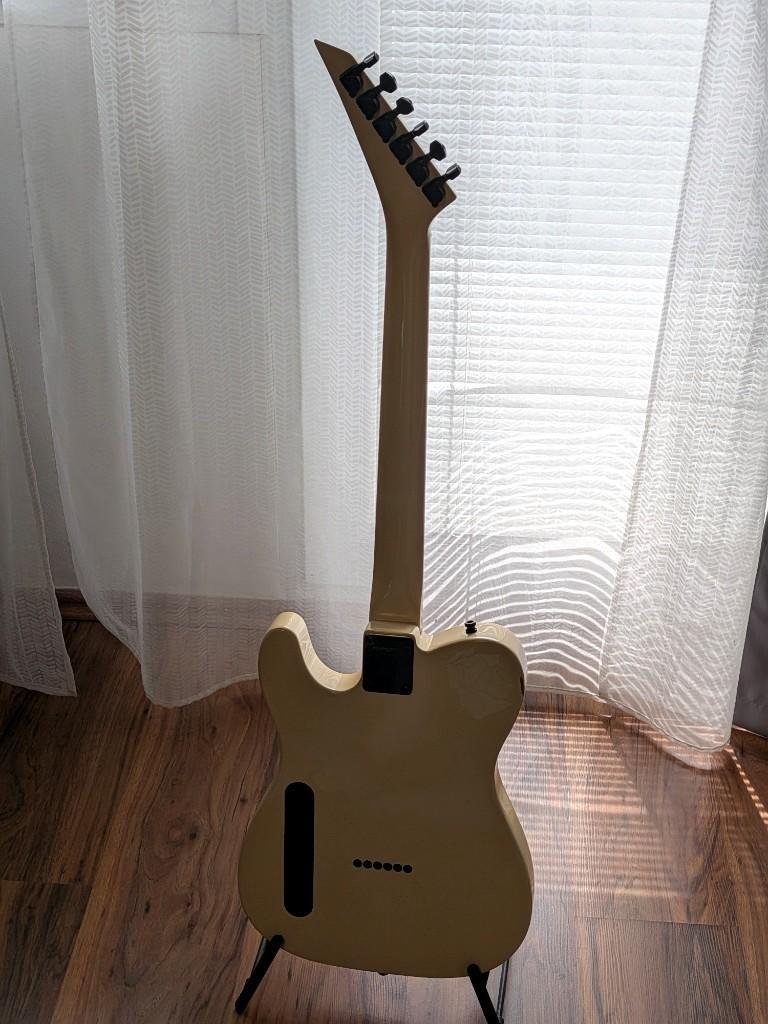 Kytara je na svůj věk ve velmi pěkném stavu, s krásně lesklým lakem, hezky zežloutlým krémovým bindingem a jen lehkým kosmetickým opotřebením. Pražce mají ještě hodně života, elektronika funguje správně, potenciometry nechrastí, krk je rovný a výztuha funguje. Vzácnější vyšší MIJ TEJ model s průrazným, komprimovaným a tichým aktivním zvukem, kterým je tahle verze známá. Kytaru je možné vyzkoušet v Praze na adrese Novodvorská 106 přes kombo Yamaha THR10X. --- Original MIJ Fernandes TEJ-80BT in white finish with top binding. Higher-tier TEJ model from the early 90s, above the common TEJ-45/50 range. Alder body, 1-piece maple bolt-on neck with slim U profile, rosewood fingerboard, 22 frets, string-through-body bridge, black hardware, Gotoh tuners, and original F.G.I. Technology active single-coil pickups. 1x volume, 1x tone, 3-way switch, active circuit powered by 9V battery. The guitar is in very good vintage condition, with deep gloss finish, nicely aged cream binding, and only light cosmetic wear. Frets have plenty of life, electronics work properly, pots are clean, and the neck is straight with working truss rod. A rare higher-spec MIJ TEJ with the punchy, compressed, low-noise active sound this model is known for. The guitar can be tested in Prague, Novodvorská 106, through a Yamaha THR10X amp.