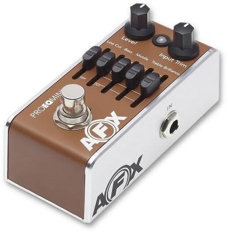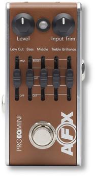 Funkce AFX Pro EQ Mini: 5pásmový ekvalizér speciálně upravený pro akustické nástroje - True Bypass s možností buffered Bypass nebo Mute - Ovládání fáze proti zpětné vazbě - Inovativní duální směrování - Velmi kompaktní design, který se vejde téměř kamkoli - Vyžaduje 9V externí napájení (není součástí výrobku a prodává se samostatně).