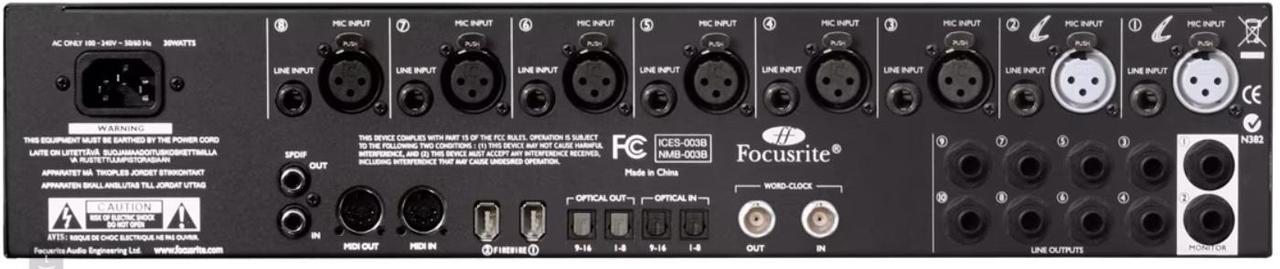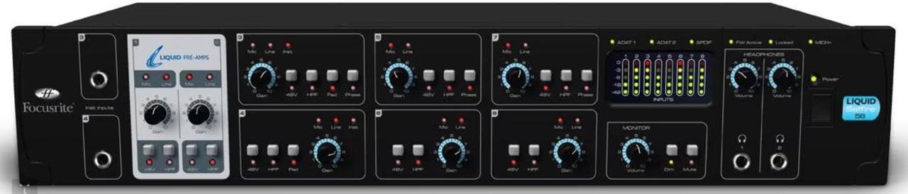 Technické údaje: • Externí zvuková karta (28-in / 28-out) • FireWire rozhraní • 24-bit / 192 kHz převodníky • Frekvenční rozsah: 20Hz – 20kHz (-0,1 dB) • Vstupy: 8x XLR (mikrofonní), 8x 1/4“ Jack TRS (linkový), 1x RCA S/PDIF (digitální), 2x optický ADAT, MIDI, World-clock BNC • Výstupy: 10x 1“ TRS Jack, 1x RCA S/PDIF (digitální), 2x optický ADAT, MIDI, World-clock BNC • Technologie JetPLL (eliminace jitteru) • 2x předzesilovače Focusrite Liquid (emulace vintage předzesilovačů) • Emulace: API 3124+, Avalon VT-737SP, Focusrite Red 1, Helios, Manley Slam, Neve 1073, Pultec MB1, Telefunken V72, Universal Audio 610, Millenia HV-3D • 6x mikrofonní předzesilovače Focusrite Saffire • Phantomové napájení +48V • High-pass filtr • MIDI rozhraní • Digitální S/PDIF rozhraní • 2x optické ADAT rozhraní (16-in / 16-out při max. 48kHz, 8-in / 8-out v SMUX módu, 4-in / 4-out v SMUXII módu) • World-clock rozhraní • 2x Sluchátkový výstup s nezávislým ovladačem hlasitosti • Virtuální loopback vstupy • Neomezené možnosti routování (Saffire Mix Control) • Součástí balení software: Focusrite Plug-in Suite • 5-segmentový LED indikátor úrovně pro analogové vstupy • Kompatibilní s Windows Vista, XP, Mac OS X 10.4 a vyšší • Kompatibilní s 64-bitovými systémy