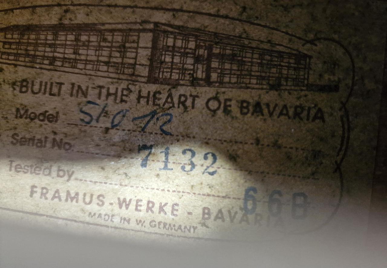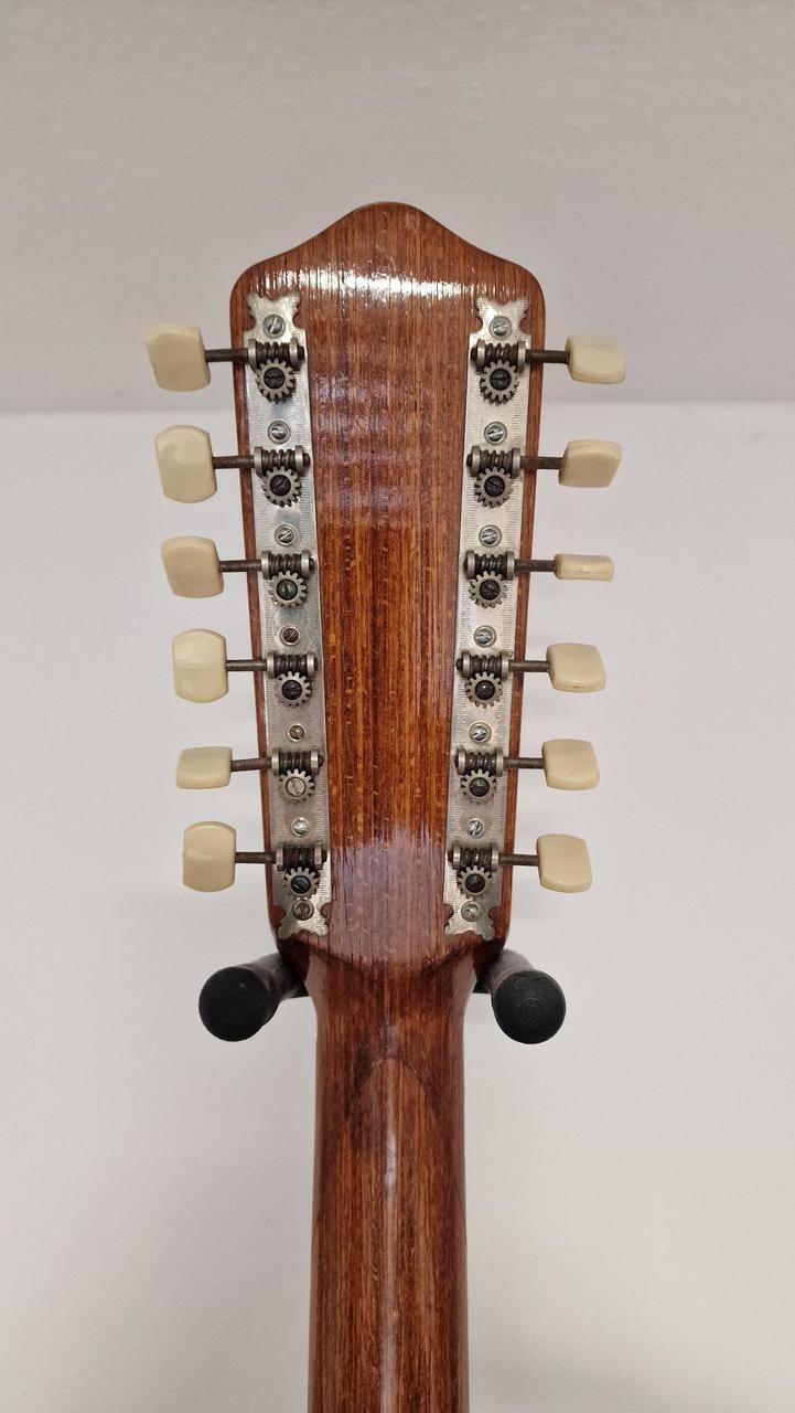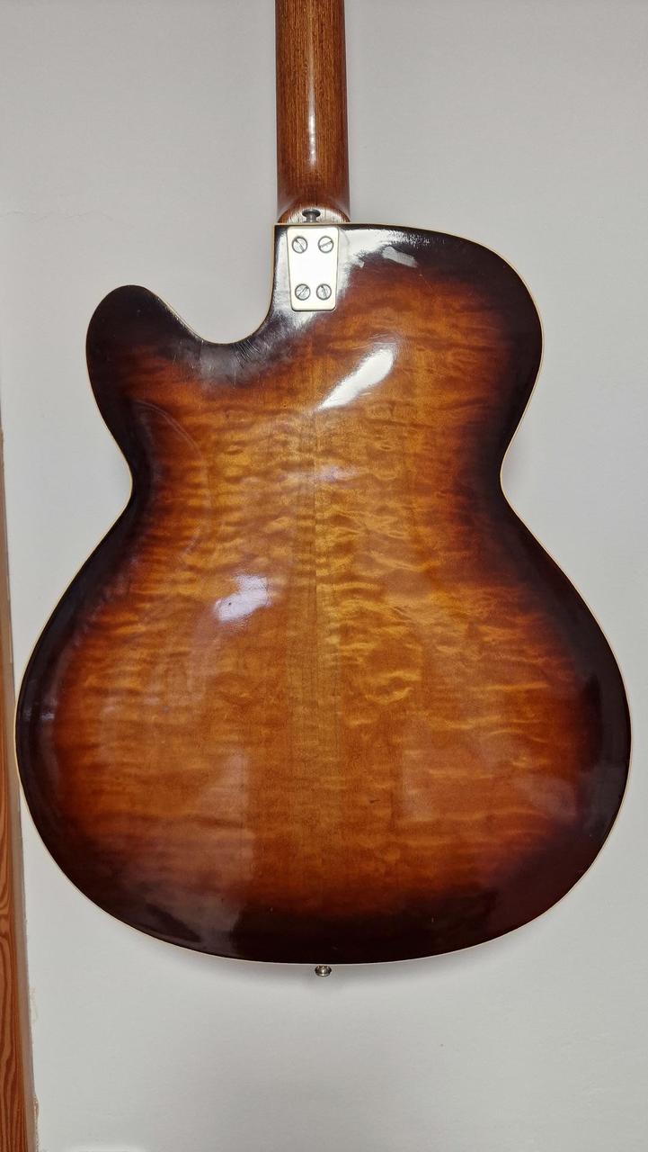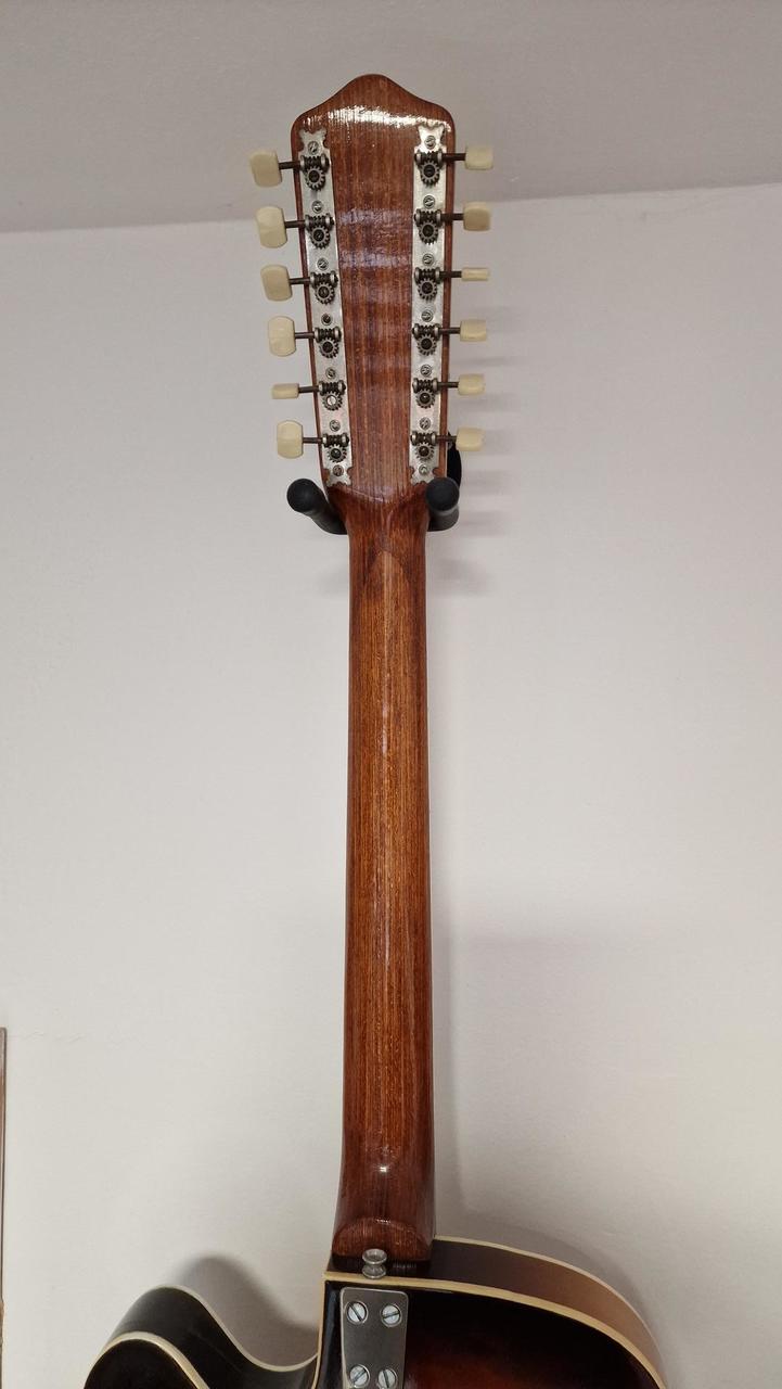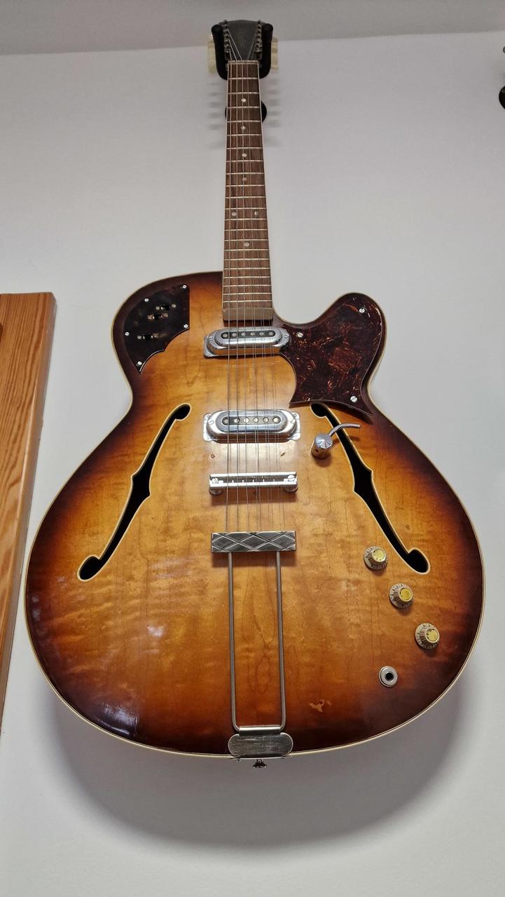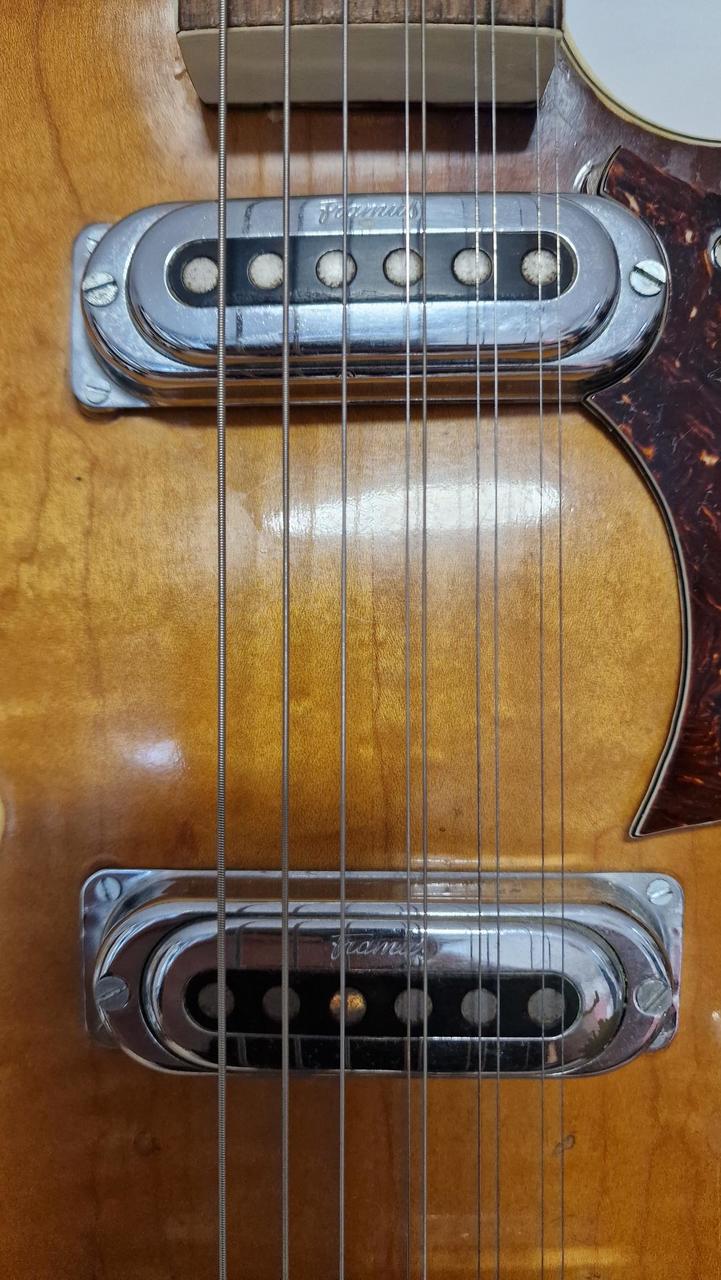 kytara je v hratelném stavu a má originální zapojení bez zásahu vše je původní ! letos slaví 60let takže má nějaké vrásky,ale je v celkově pěkném stavu viz foto ! vhodný dárek pro někoho k 60tinám :) Tělo: Klenuté, laminované tělo typu thinline (poloduté) se zaobleným jednoduchým výřezem (single cutaway). Vrchní a zadní deska jsou z laminovaného kudrnatého javoru. Krk a hmatník: Krk z vícevrstvého javoru (multiply) s palisandrovým hmatníkem. Snímače: Dva originální oválné chromované single-coil snímače. Elektronika: Ovládání hlasitosti a tónu pro každý snímač a také hlavní ovladač "organ effect" (s pružinou, která po uvolnění zvýší hlasitost na maximum). Menzura: Dlouhá menzura 64,5 cm. Povrchová úprava: Kytara byla k dispozici v hnědém stínovaném (brown shaded) Hardware: Originální niklové pražce a binding (lemování). Most (kobylka) je často nahrazen neoriginálním palisandrovým dílem s kostěným sedlem u mnoha dochovaných nástrojů. Recenze a zvuk Majitelé a prodejci chválí Framus Sorento 5/012 za velmi dobrý zvuk a pohodlné hraní, zejména s ohledem na její věk. Její 12strunný thinline design jí dodává charakteristický, bohatý tón. Nástroj je často popisován jako vzácný sběratelský kousek vhodný pro profesionální hudebníky a milovníky vintage nástrojů.