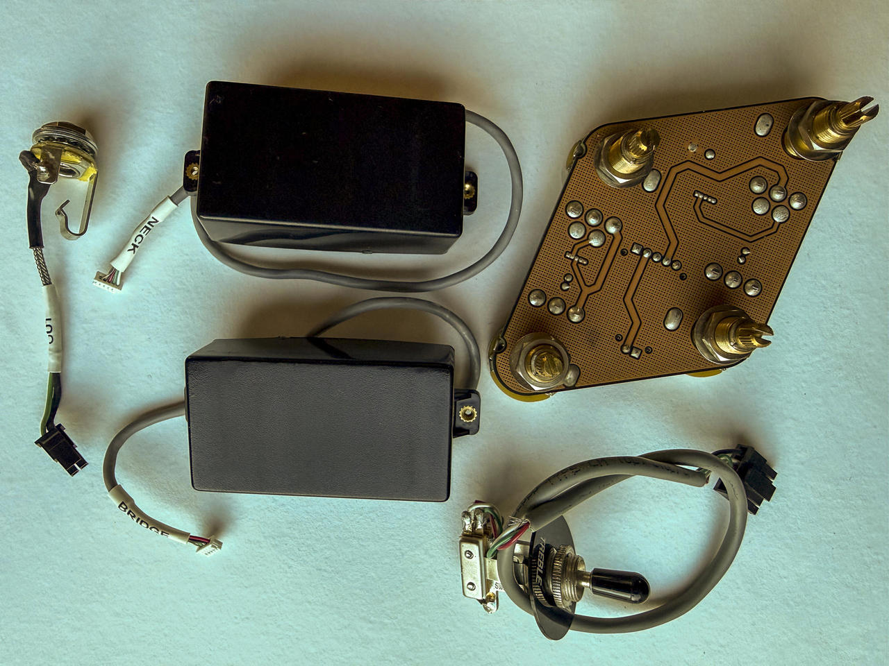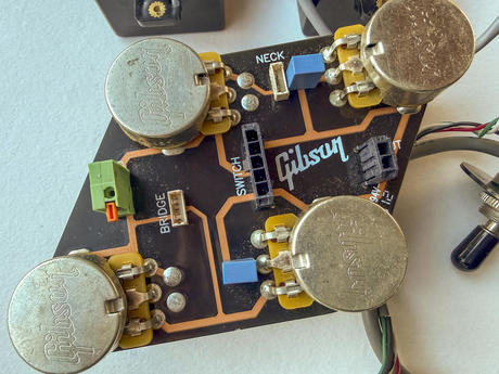 Kompletní osazení pro Les Paul bez pájení! Gibson 498T, Gibson 490R a QuickConnect PCB z kytary Gibson Les Paul (Gibson LPJ 2013), kabeláž je kompletní s konektory QuickConnect pro PCB, včetně přepínače a výstupního jacku, zaručeně funkční.