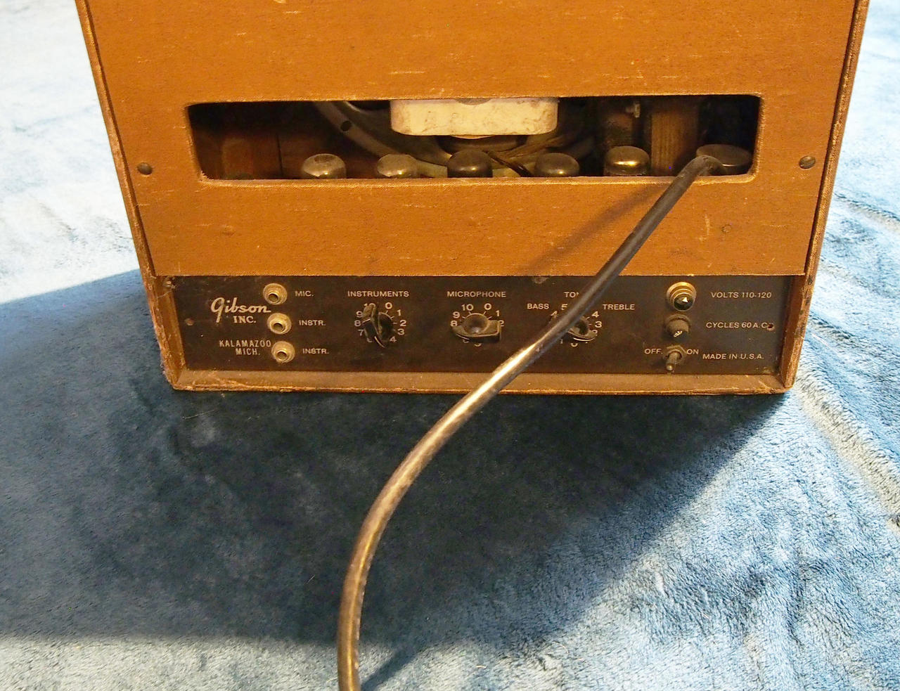 Lampy: předzesilovač: 6SL7, 6SN7, 6SJ7, konec: 2 x 6V6, rectifier: 5Y3. Výkon 14 W. 12 palec origo repro. 3 vstupy: dva linka, jeden mikrofonní. 41 x 45 x 22 cm, 6.5 kg. Transformátor na 220V/50Hz v ceně. Funkční, skvělý.