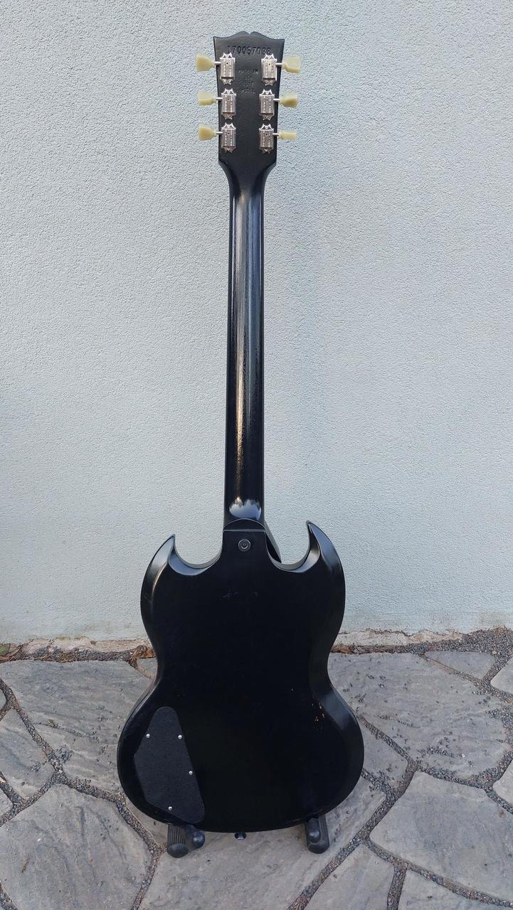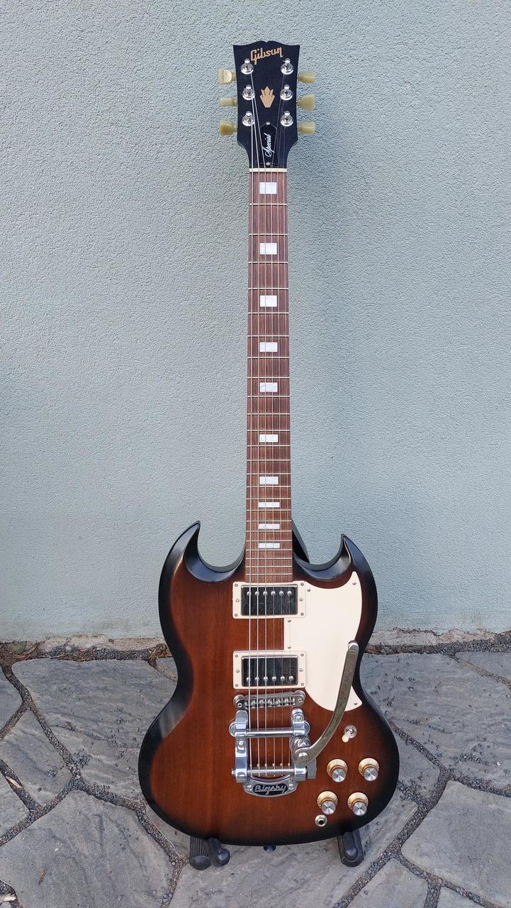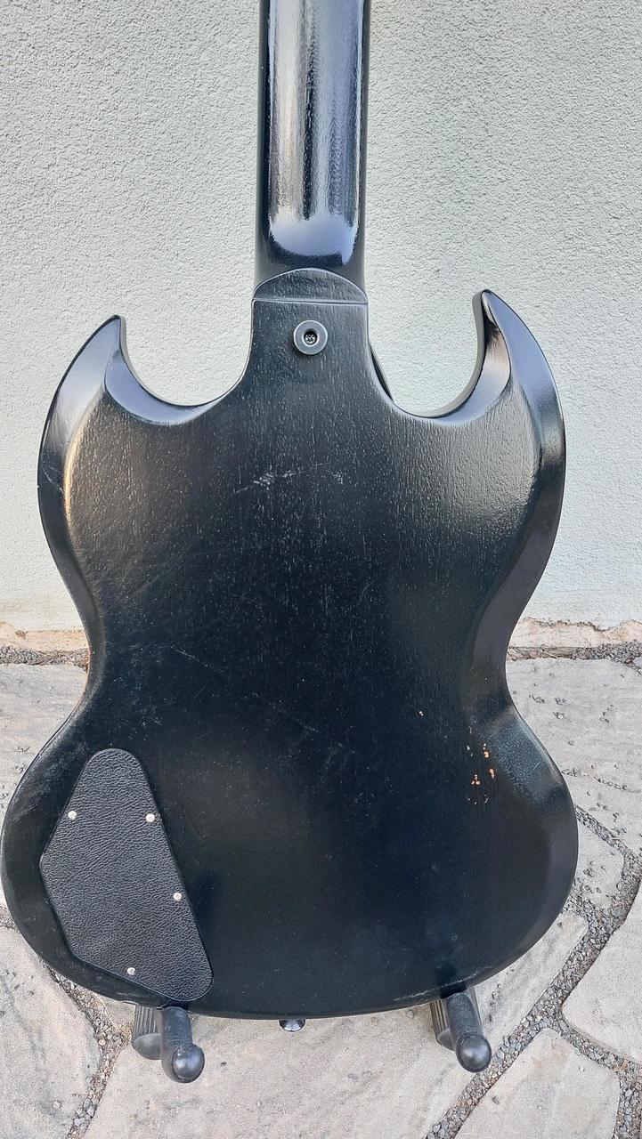 Prodám velmi zachovalou a atraktivní kytaru Gibson SG, kterou jsem kupoval od pana Jana Martínka z kapely Žlutý pes. Kytara je seřízená (struny 11) na Bigsby originál (6tis Kč)namontované pomocí originální montážní podložky (2tis Kč). Takže bez zásahu do kytary. Kdykoliv jde snadno sundat. Krk i pražce v pořádku. Hardware původní. Možno s pevným kufrem +2.500,- Kč. Hraje to, ladí to. Drobné kosmetické vady od běžného používání. Posílám kurýrem pouze včetně kufru oproti platbě předem na účet. Cena pevná. Jelikož už nehraju, tak nemám zájem o výměnu. Možná bych měnil za dětskou motokrosovou motorku (ne čínu). Možnost vyzkoušet u mně ve zkušebně na lampových aparátech. Lokalita Ústí nad Labem
