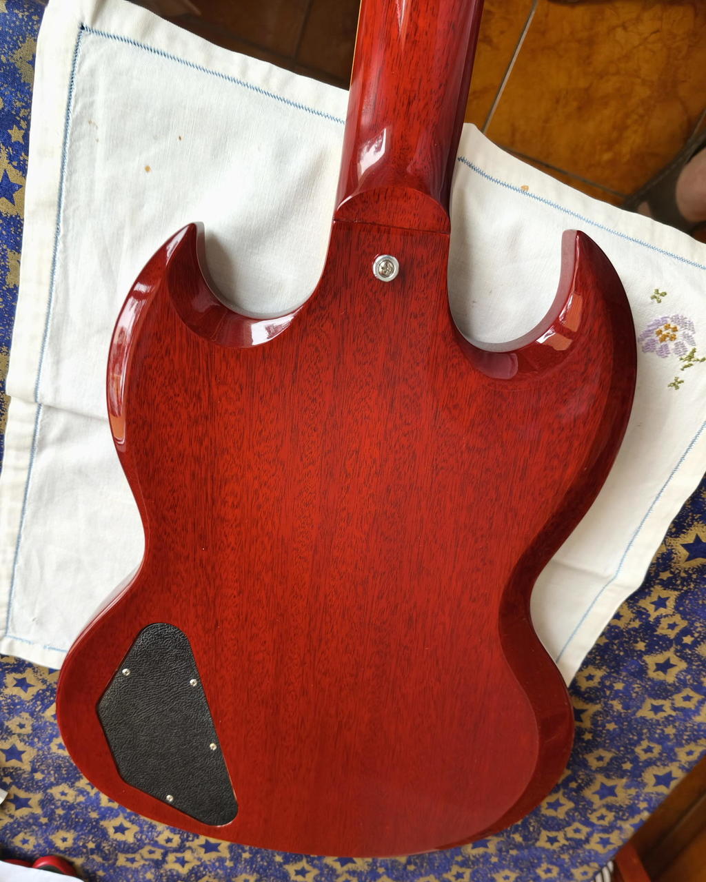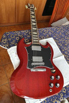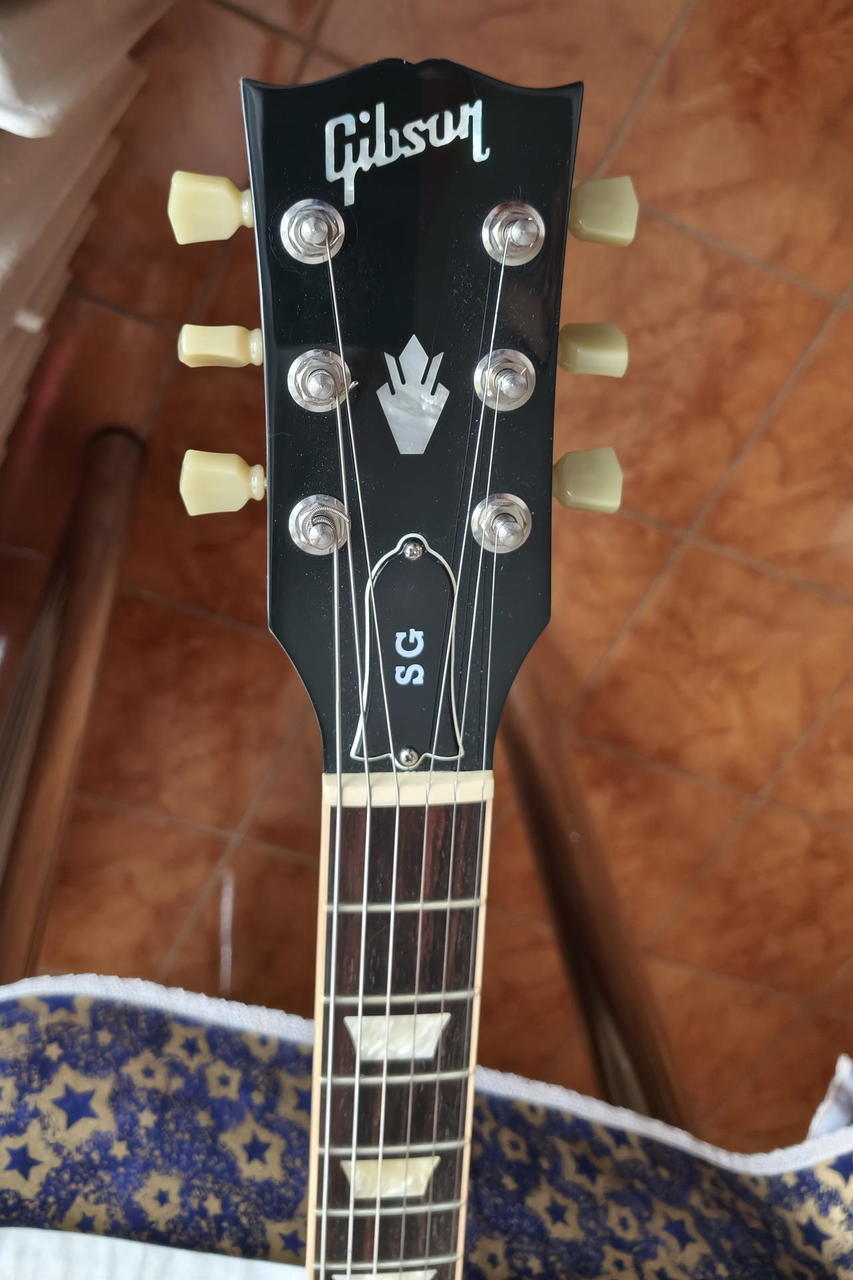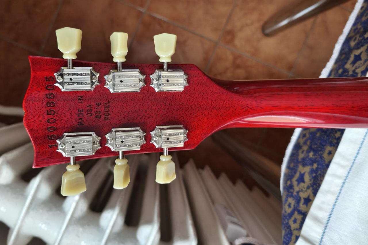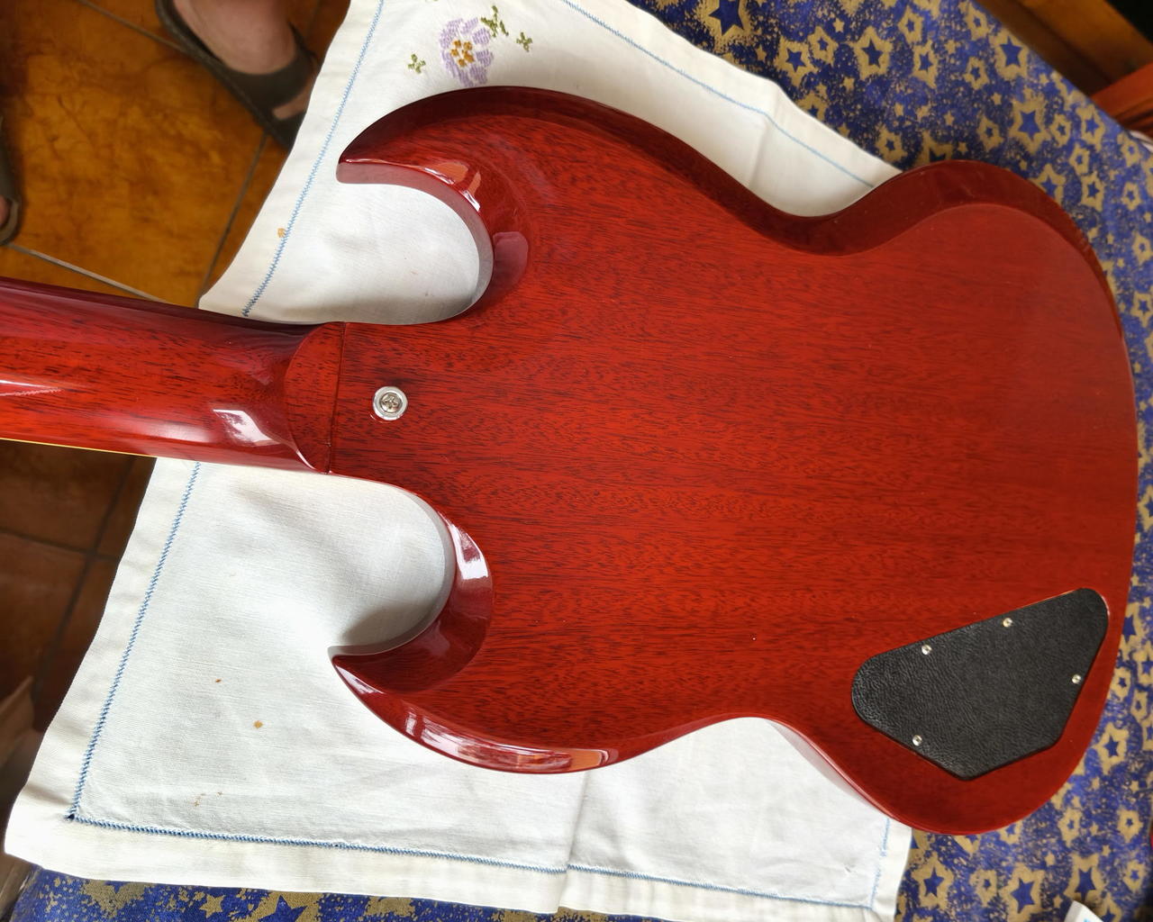 Prodám deset blet starou elektrickou kytaru Gibson SG Standard Traditional v barvě Heritage Cherry s originálním luxusním hnědým kufrem Gibson. Kytara byla vyrobena v Nashvillu v Tennessee v roce 2016, je ve vynikajícím stavu s pouze lehkými povrchovými škrábanečky a stopami po trsátku. Tělo a krk jsou vyrobeny z mahagonu, hmatník z indického palisandru s akrylovými lichoběžníkovými značkami pozic. Nástroj váží 3,08 kg, délka menzury je 628,6 mm a šířka nultého pražce je 42,71 mm. Ladicí mechaniky jsou Gibson Deluxe Kluson, kobylka Tune-O-Matic a snímače 490R a 490T.